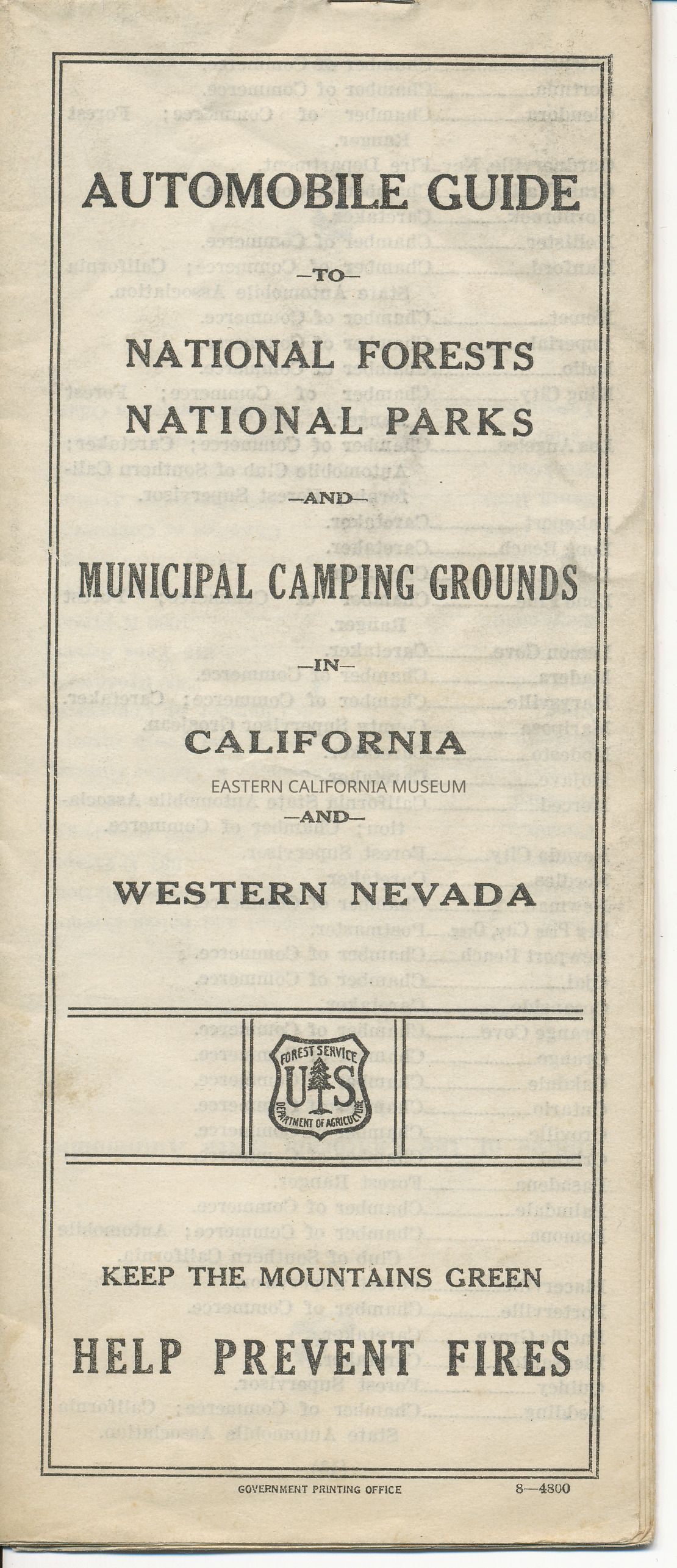Map titled "Automobile Guide to National Forests, National Parks, and Municipal Camping Grounds in California and Western Nevada." Produced by the Forest Service, likely in the 1920s. There are two staples keeping the two pages together.