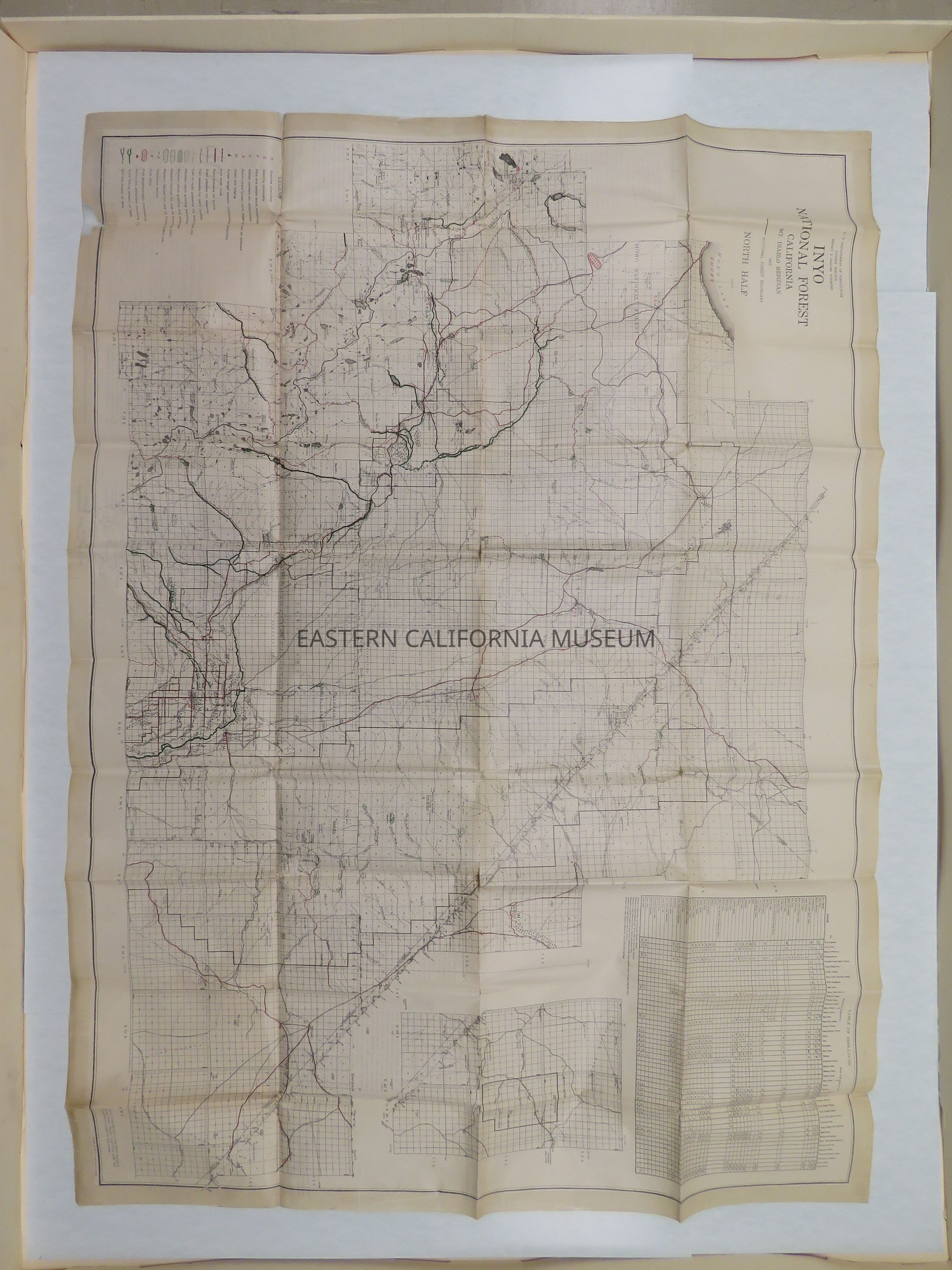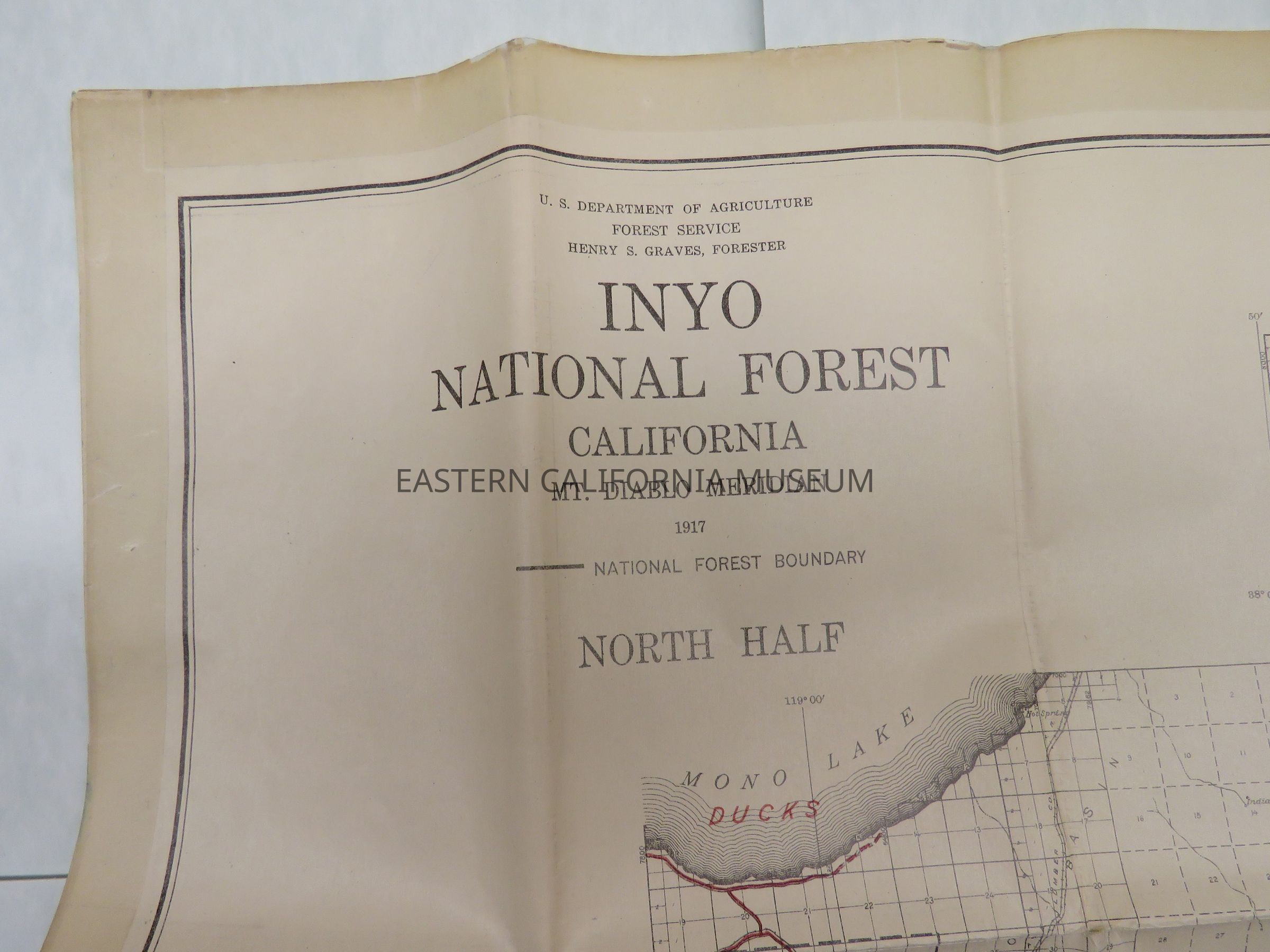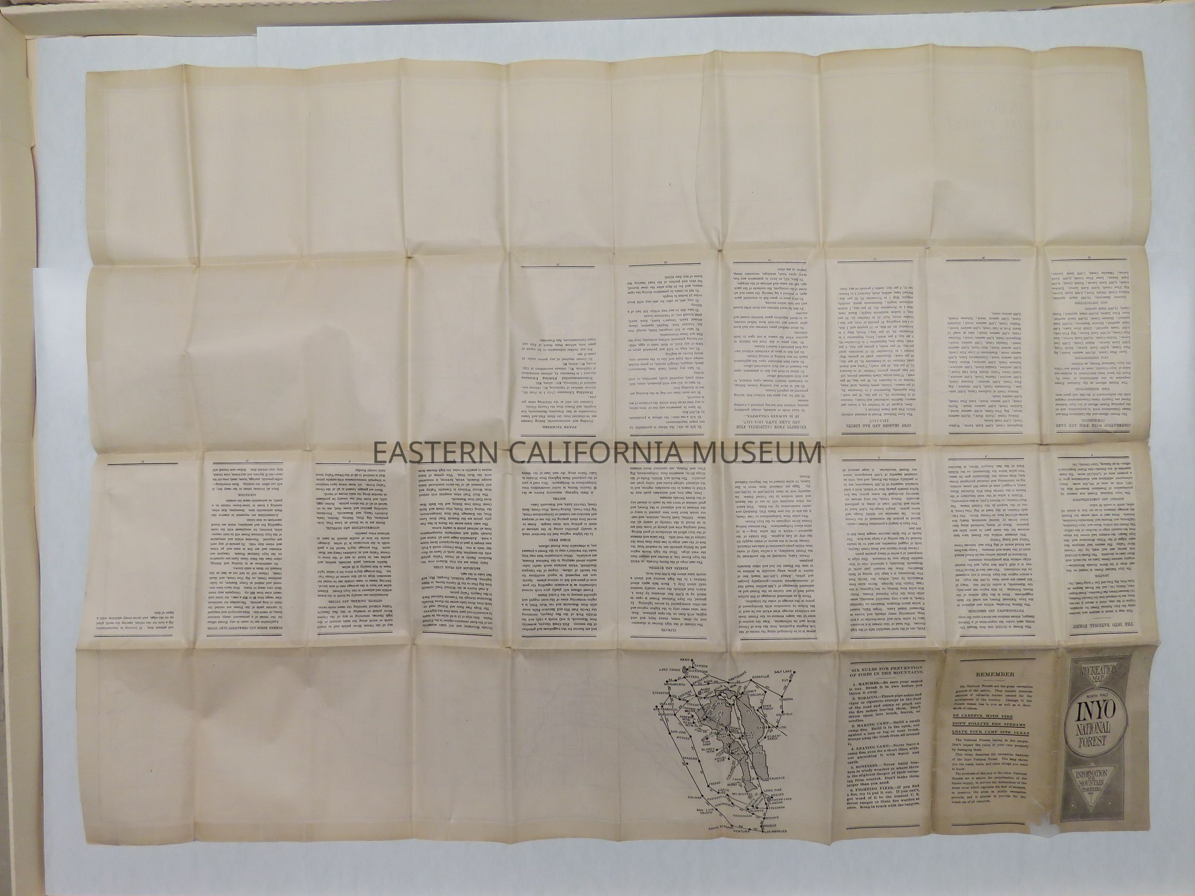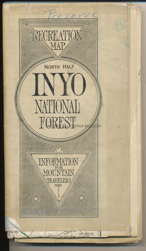 Recreation map of the North Half of the Inyo National Forest, CA, 1917. In poor condition: edges have been reinforced with clear tape, several holes.