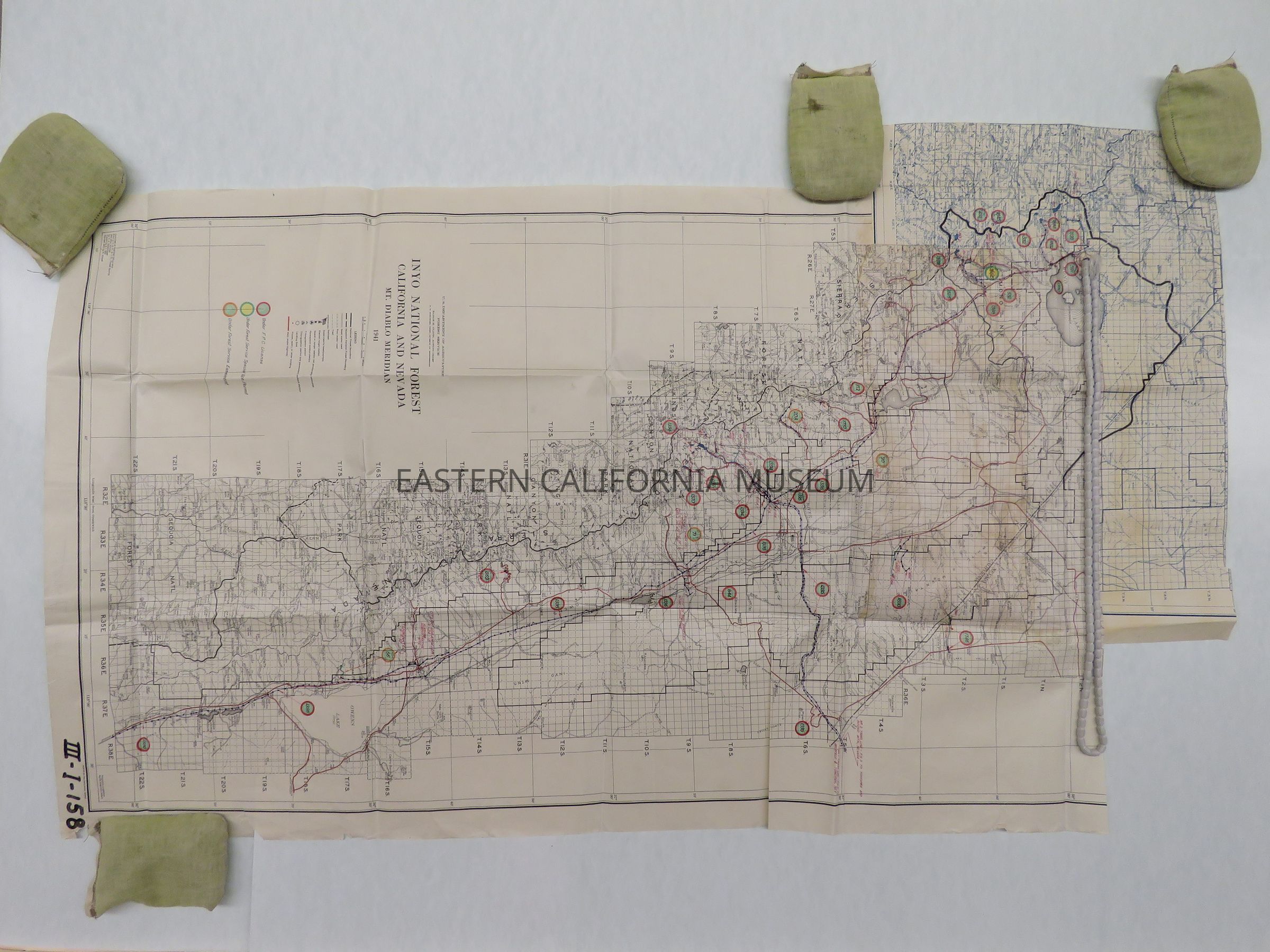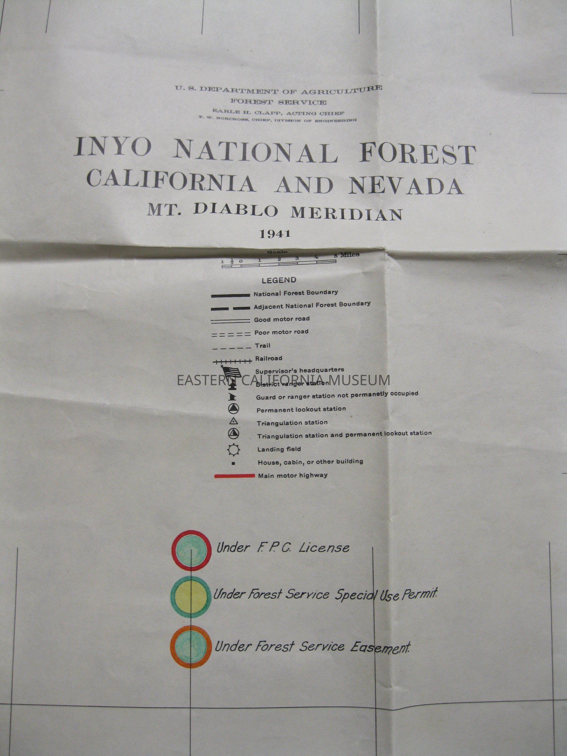 Map of the Inyo National Forest (California and Nevada), 1941, with color and numerical notations for Federal Power Commission Licenses, Forest Service Special Use Permits, and Forest Service Easement. Two papers are glued or taped together to make a larger map.