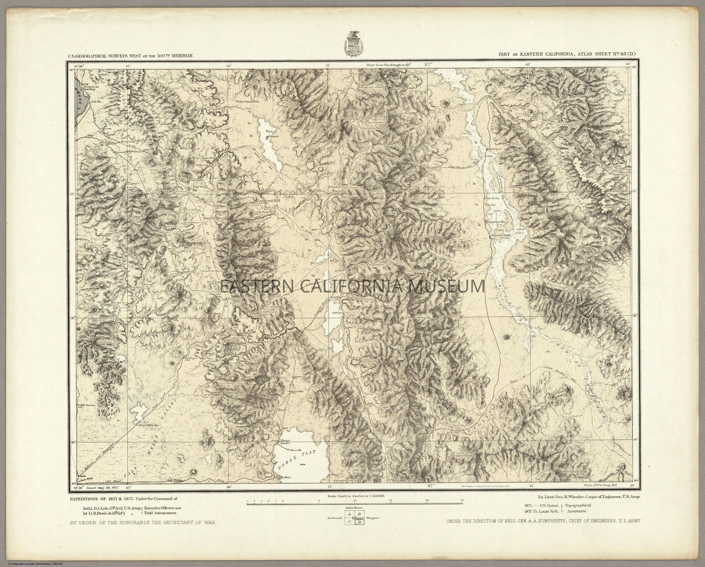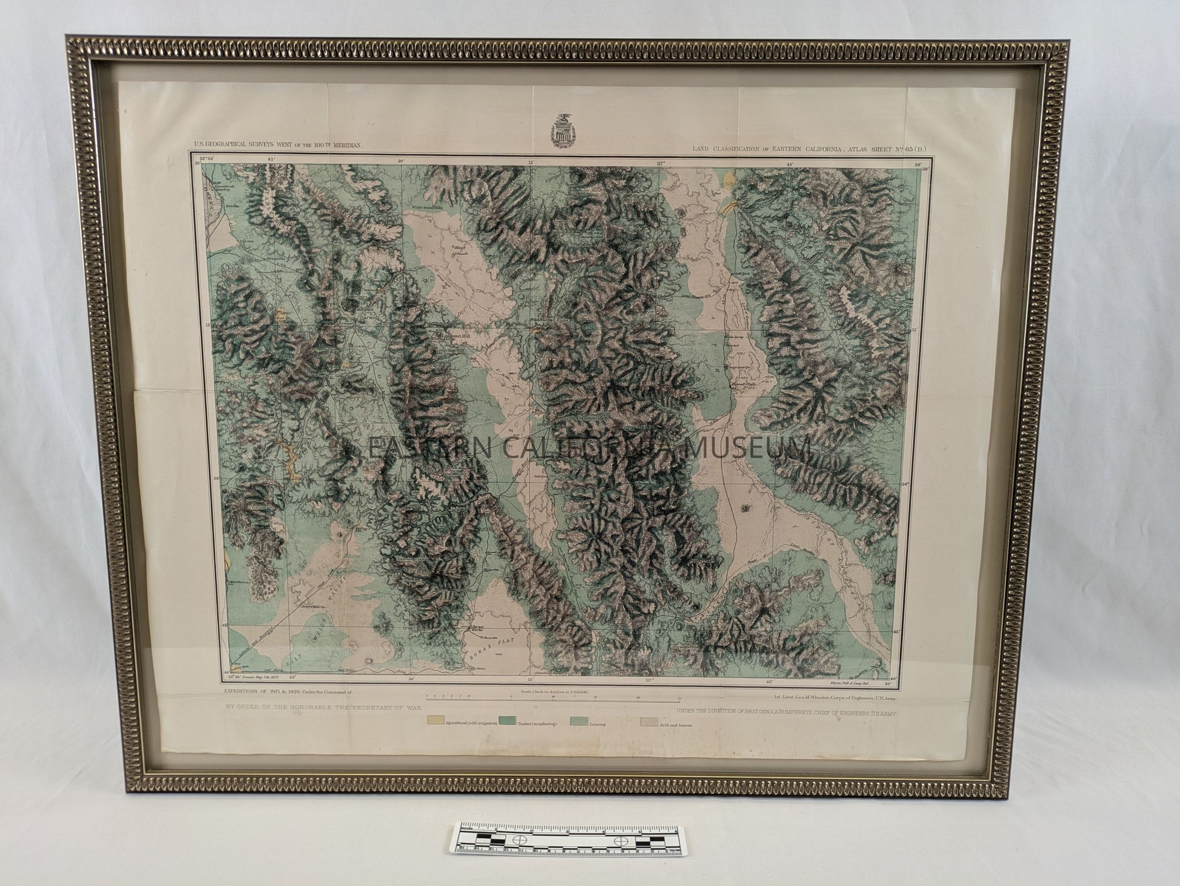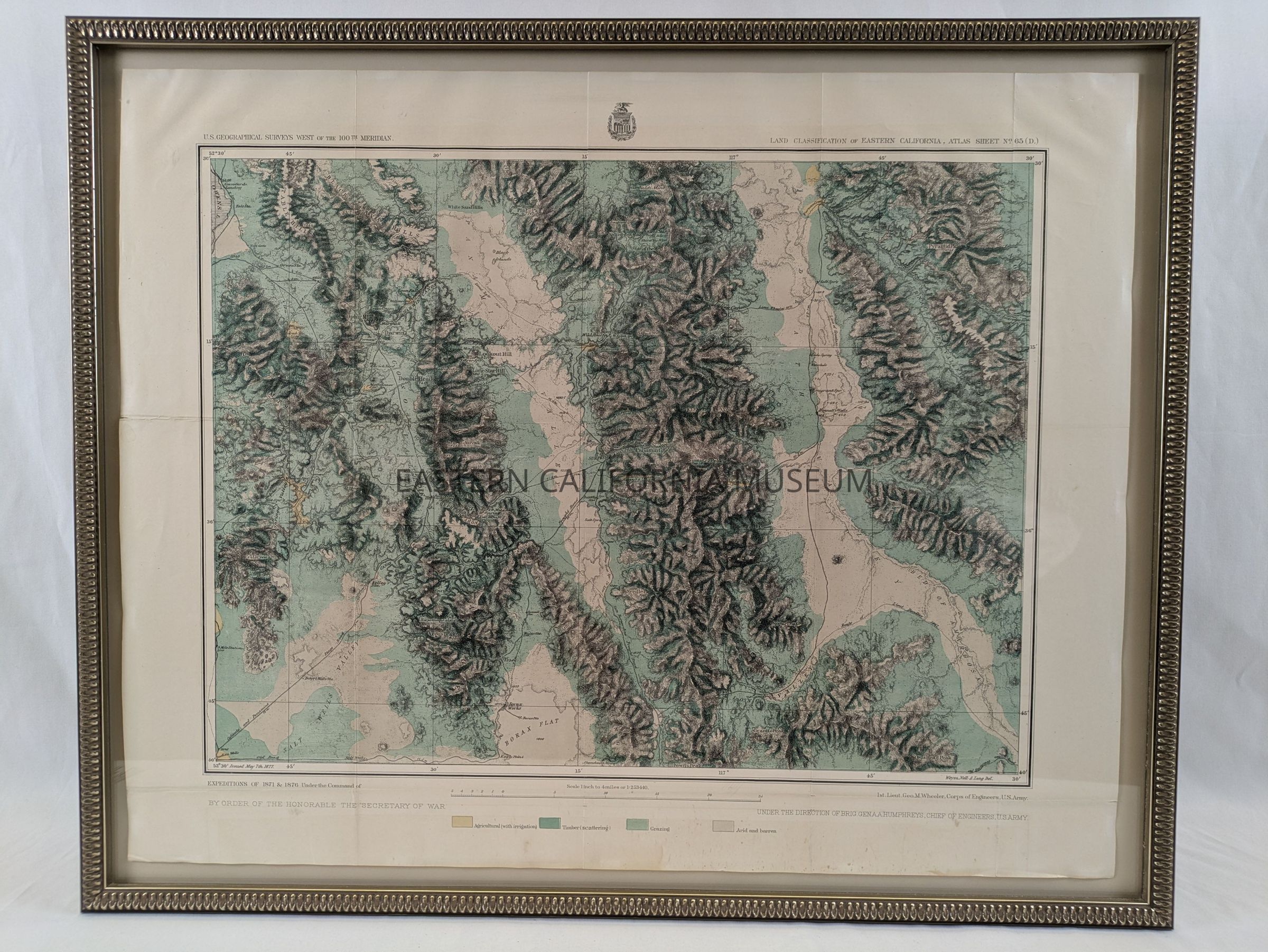Framed map no. 65 (D) from the U.S. Geological Surveys West of the 100th Meridian, also referred to at the Wheeler Survey of 1871. It shows a section of Owens Lake in the upper left, the Panamint Valley, Death Valley, Argus Range, Panamint Range, and Funeral Range. Springs, wells, routes, and other items of note are included.Collection