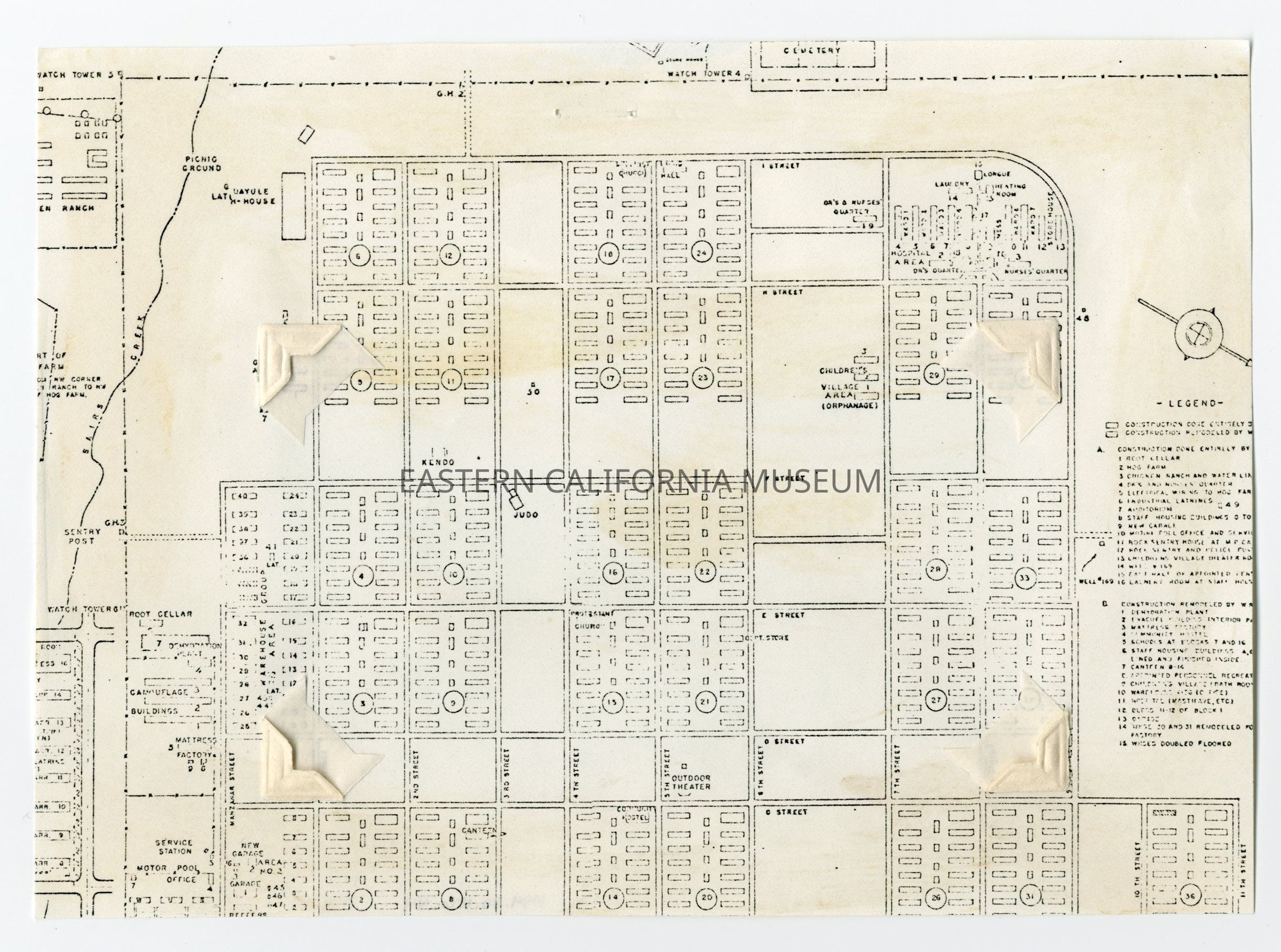 Photocopy of a map of Manzanar War Relocation Center. A label had been layered on top of it, and the four corner holders are still affixed to the paper.