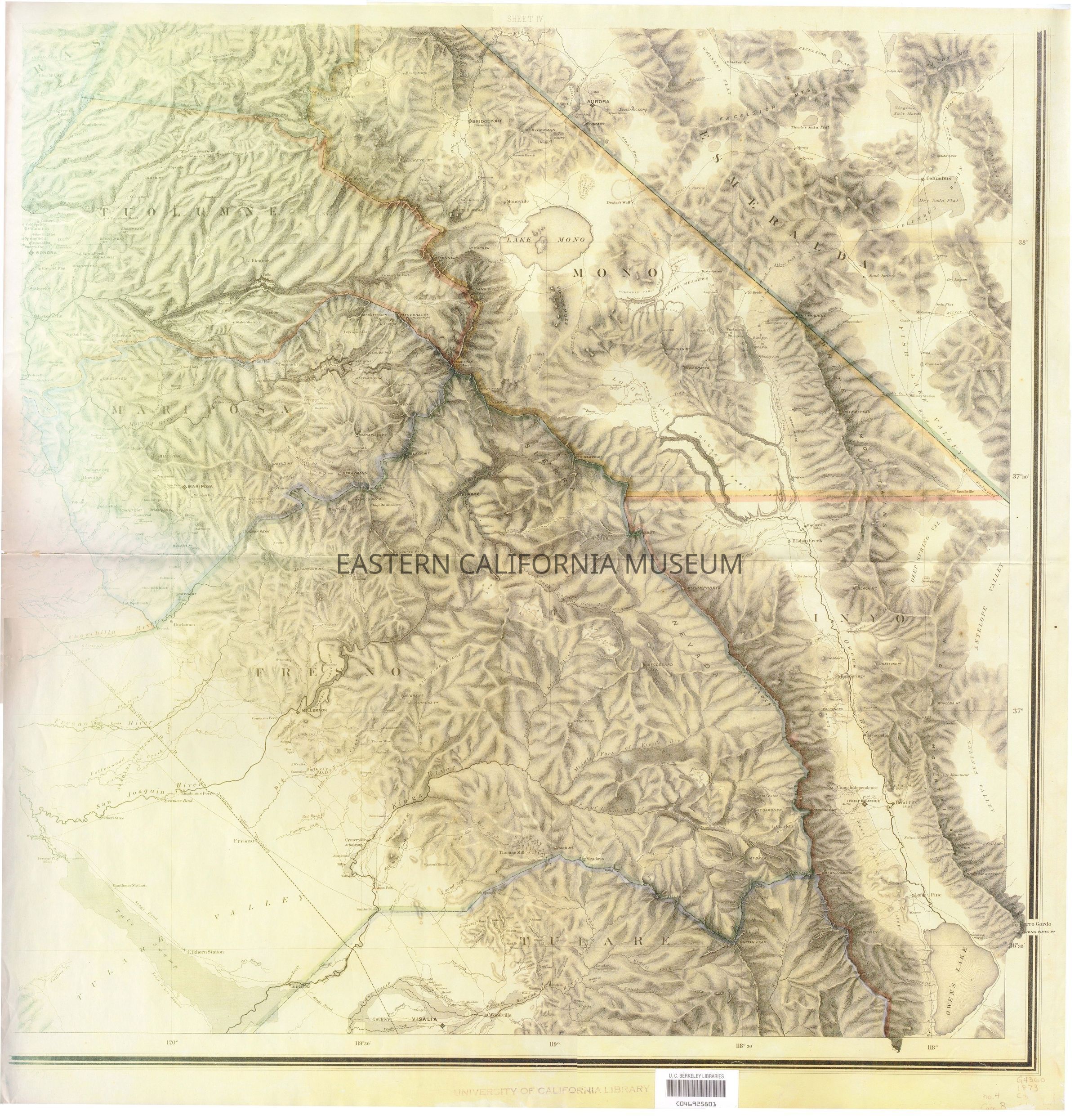 Modern copy of a section of "Topographical Map of Central California, Together with a Part of Nevada" that was produced by the State Geological Survey of California with C. F. Hoffmann as the Principal Topographer in 1873.
