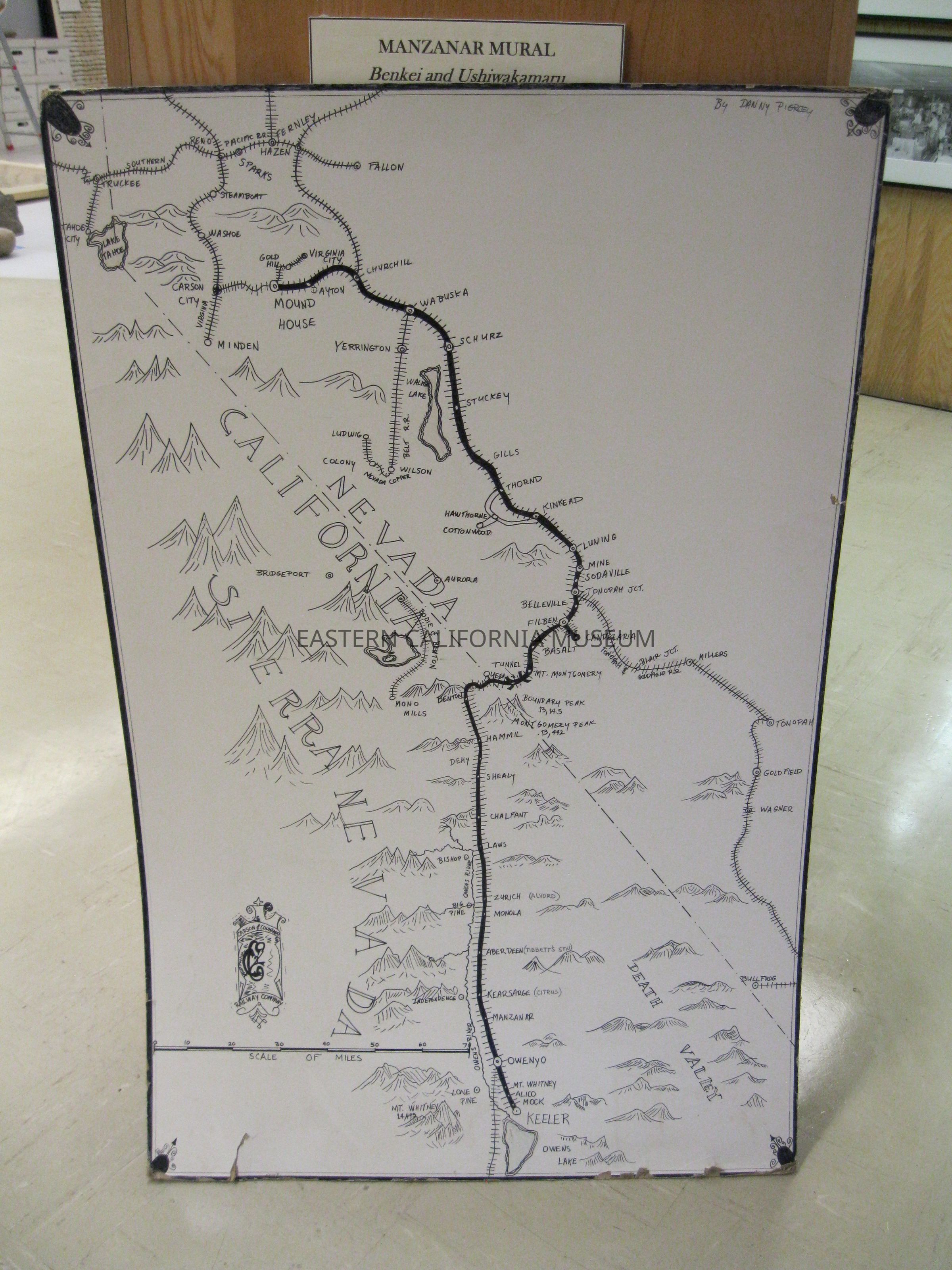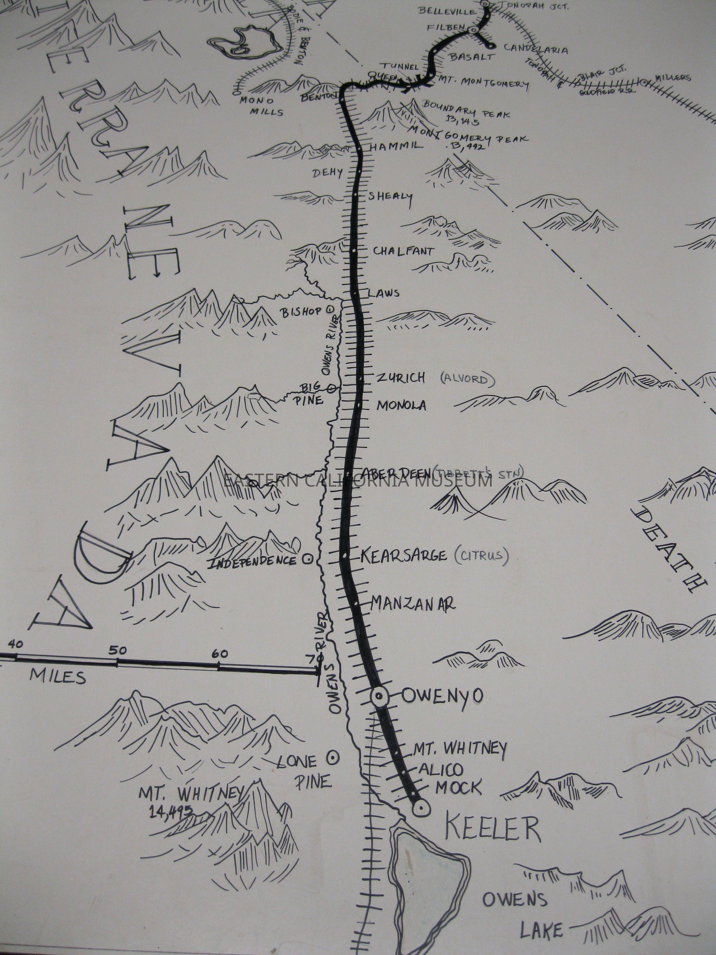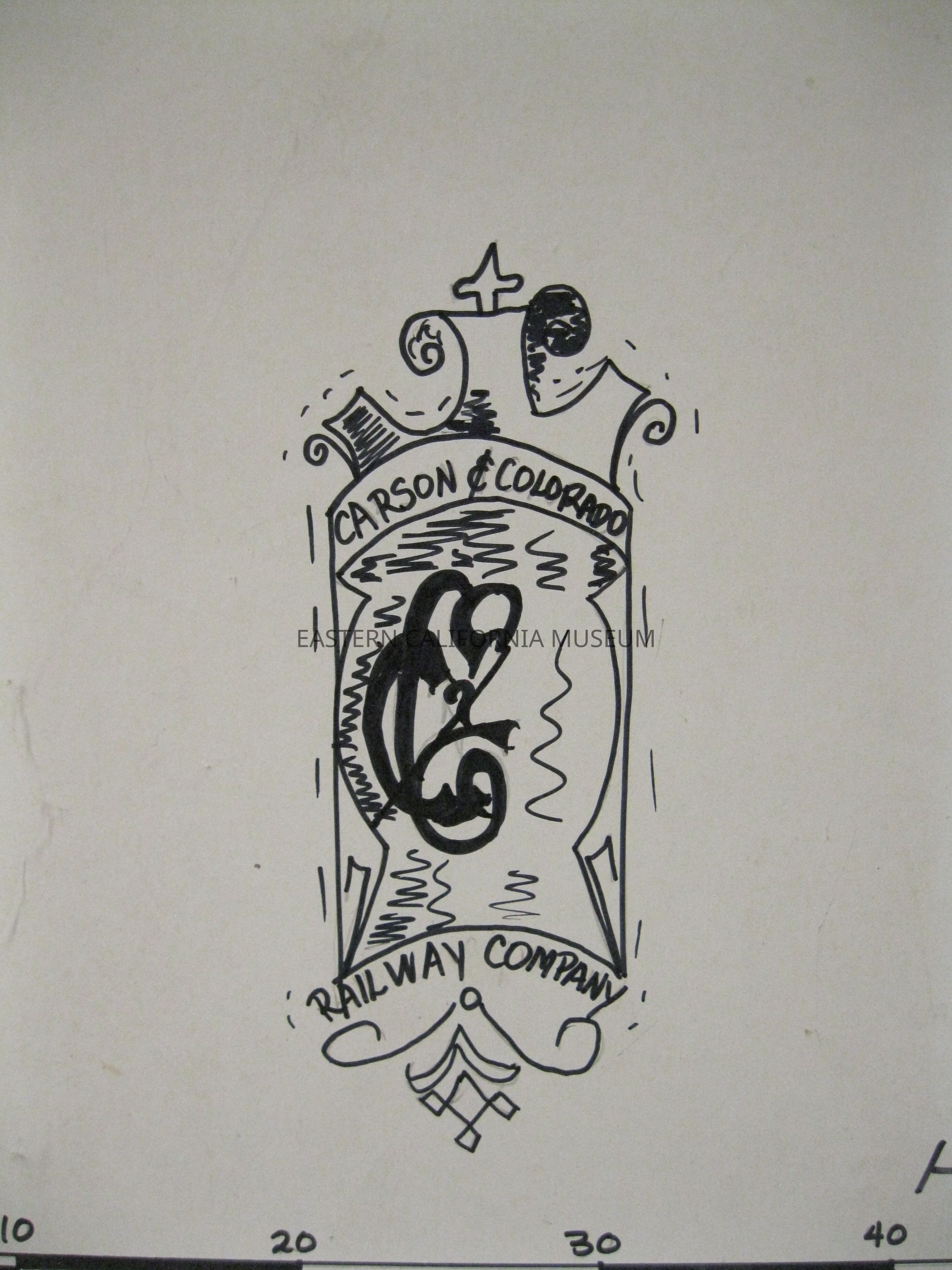 Handmade map of the Carson and Colorado Narrow Gauge Railroad, 1881-1883. White poster board with black lettering.