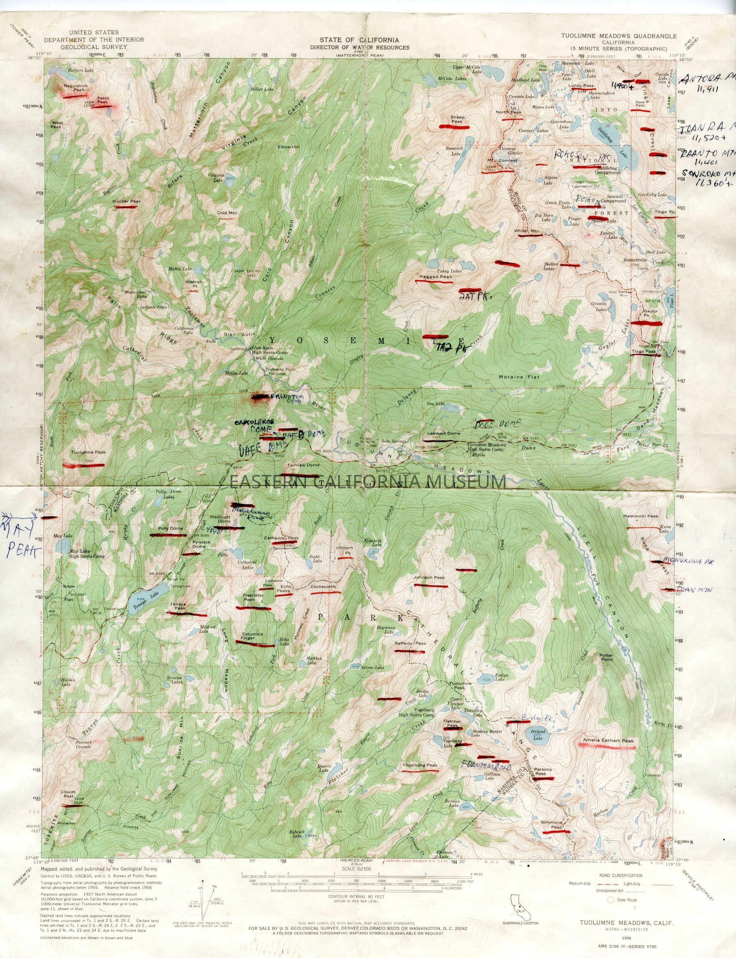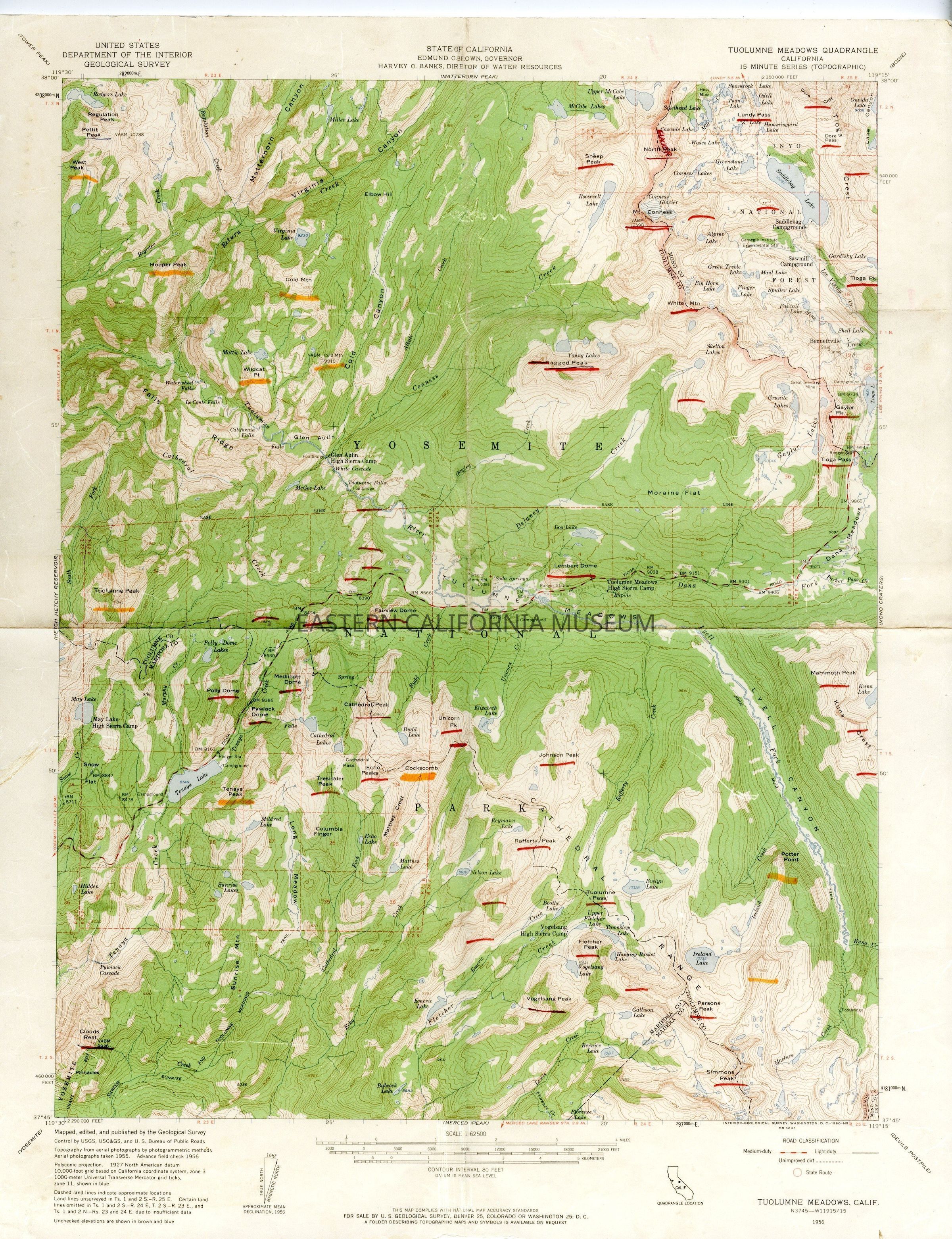 2024.22.34--Copy of a map mounted on foam core: Tuolumne Meadows Quadrangle, 15' Series (Topographic), 1956.