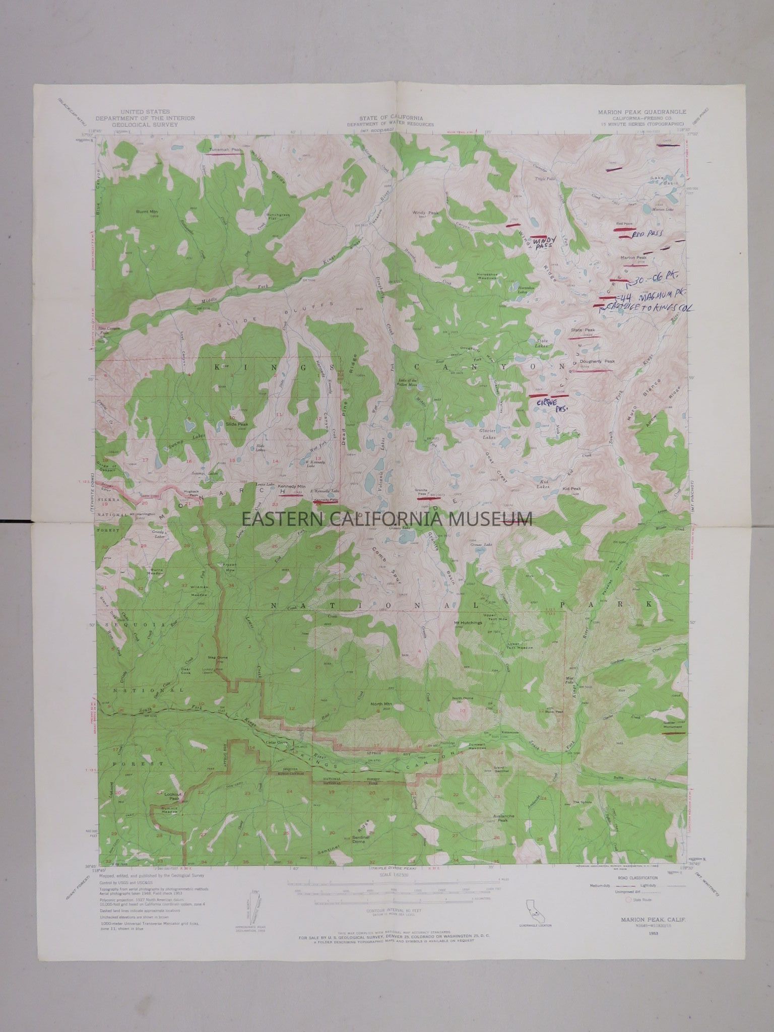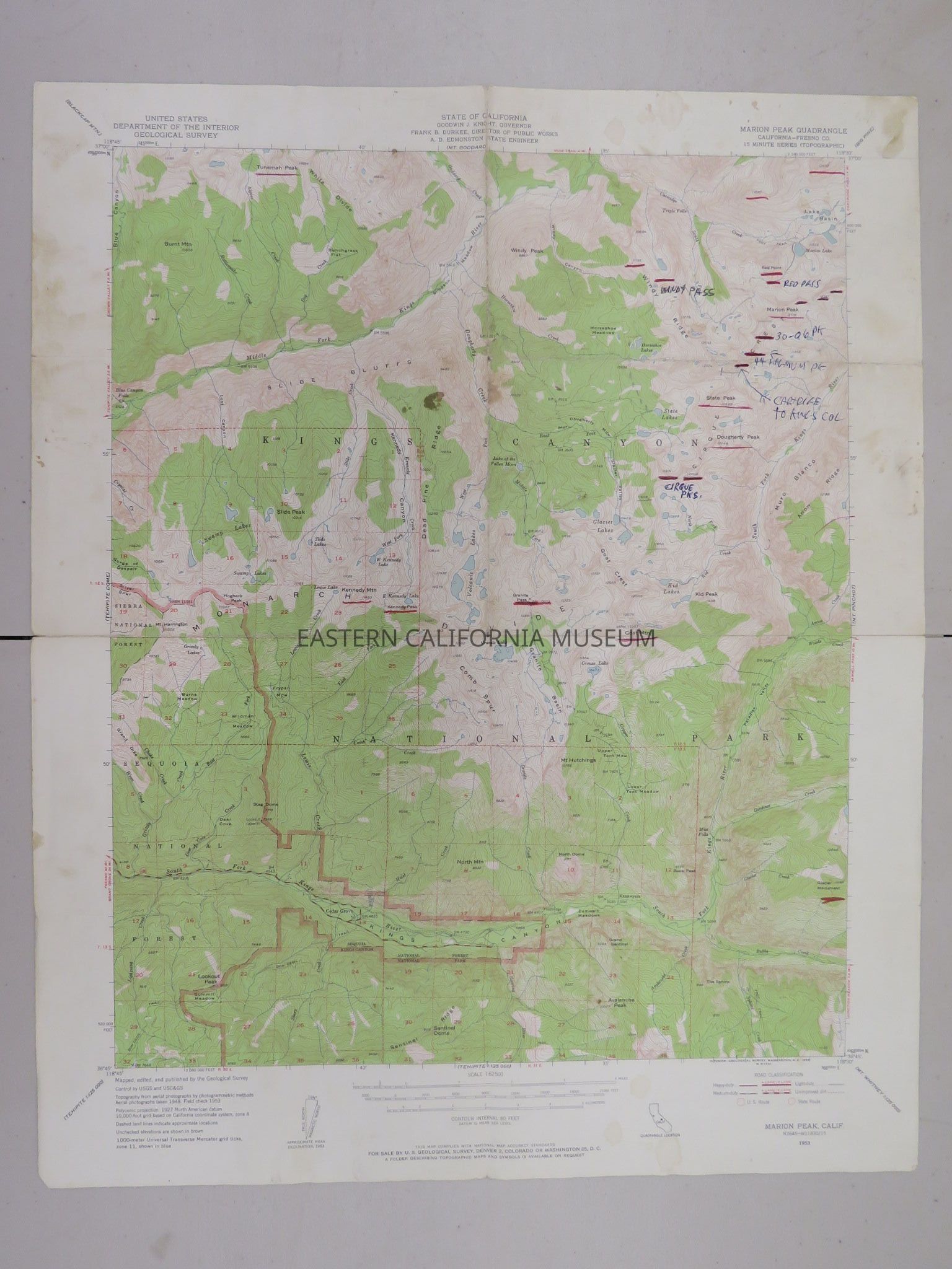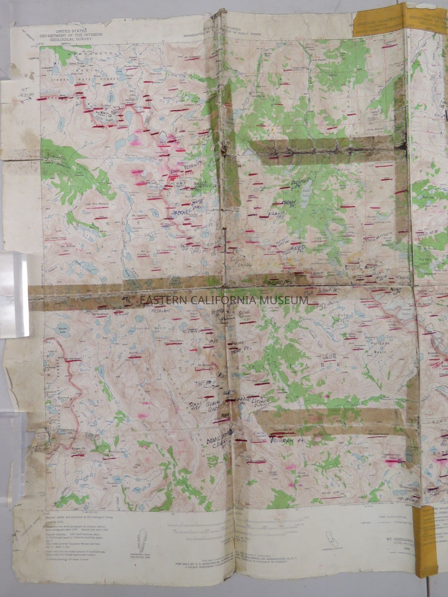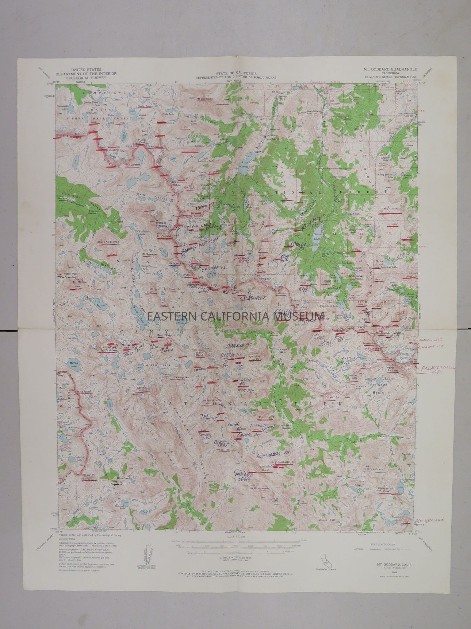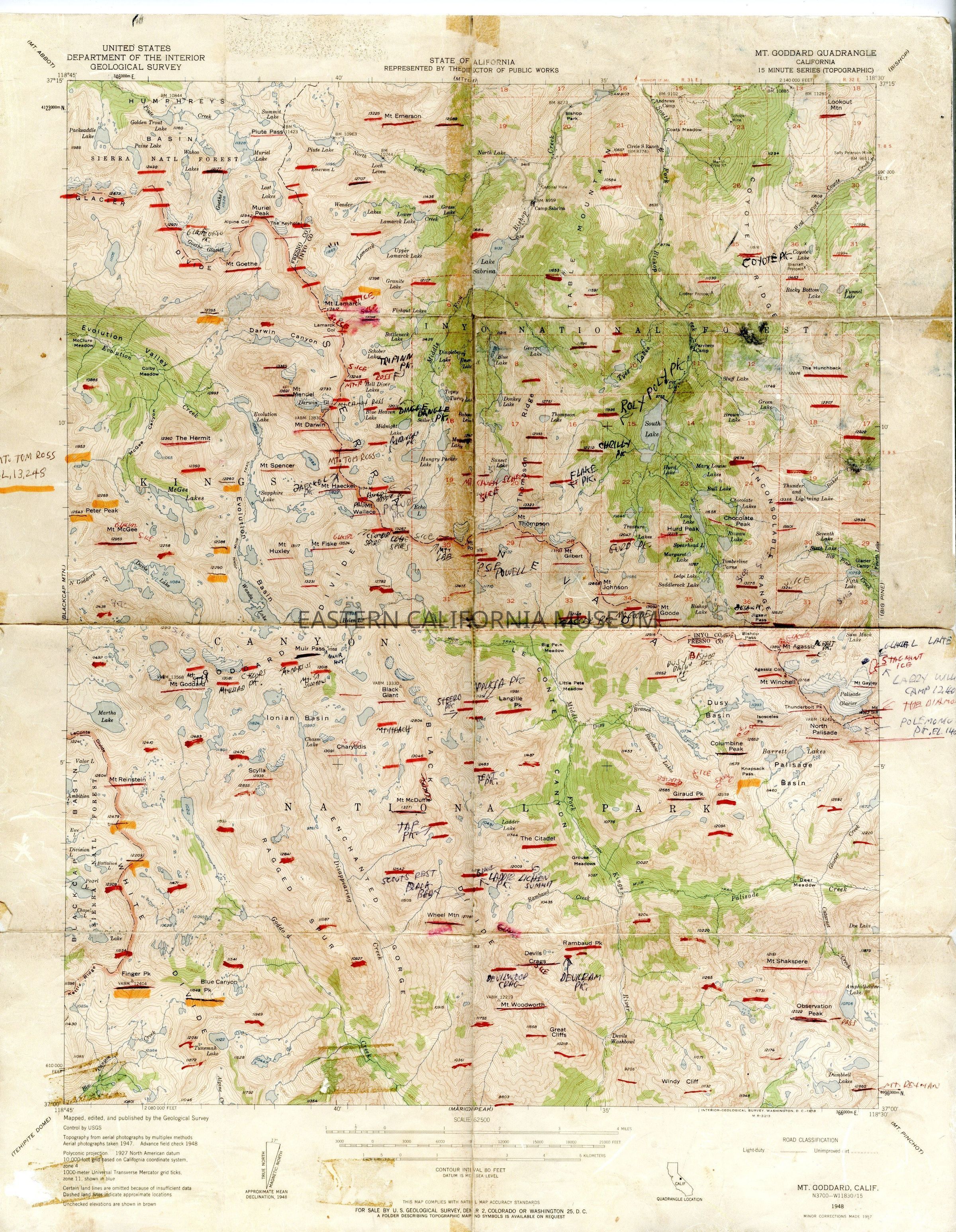 2024.22.36--Copy of a map mounted on foam core: Mt. Goddard Quadrangle, 15' Series (Topographic), 1948. Handwritten on a note card affixed to reverse: Red means---"I climbed it!" 6 [4 overwritten] other topo maps equal 1200 peaks.