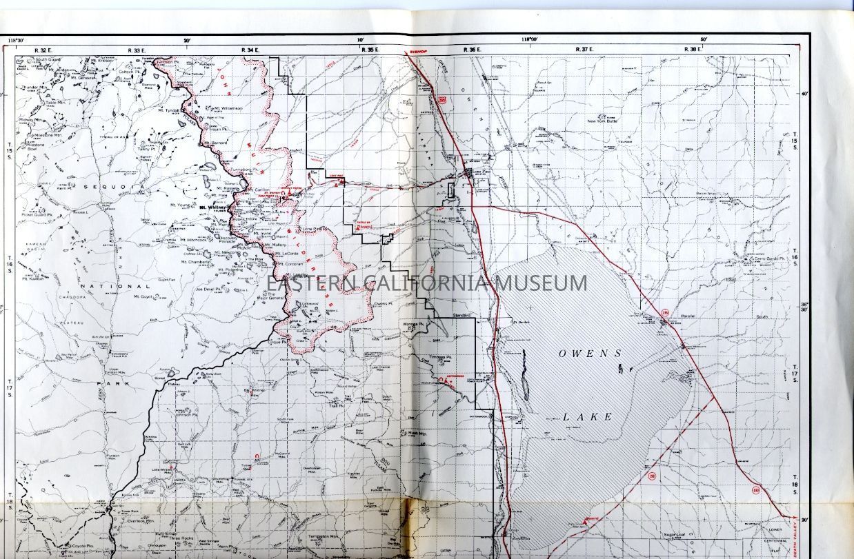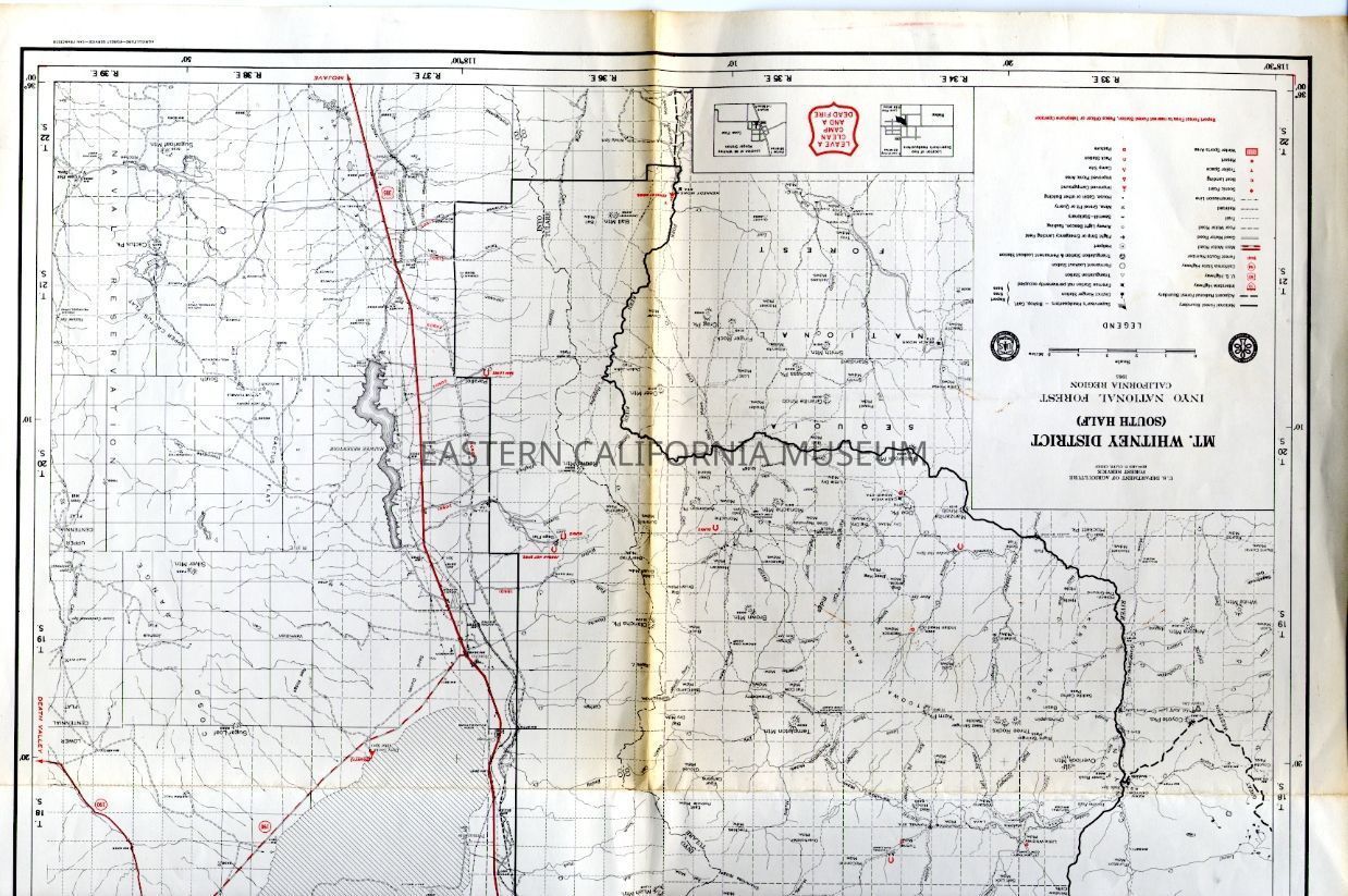 USFS map of the south half of the Mt. Whitney District of the Inyo National Forest. Includes townships and ranges, drainages, peaks, lakes, trails, roads, elevations, forest boundary, etc. Basically black and white with red highlights.Collection