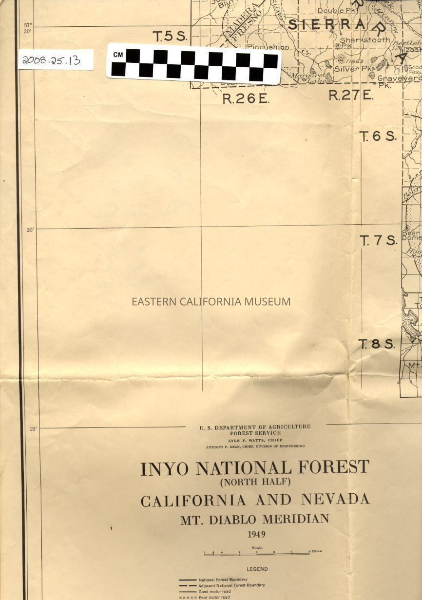 Paper map "Inyo National Forest (North Half), California and Nevada, Mt. Diabolo Meridian, 1949". United States Department of Agriculture, U. S. Forest Service. Compiled at Regional Office, 1934, U. S. G. S. G. L. O. Forest Service and other surveys by H. A. Settlement. Revised 1940 and 1948.Collection
