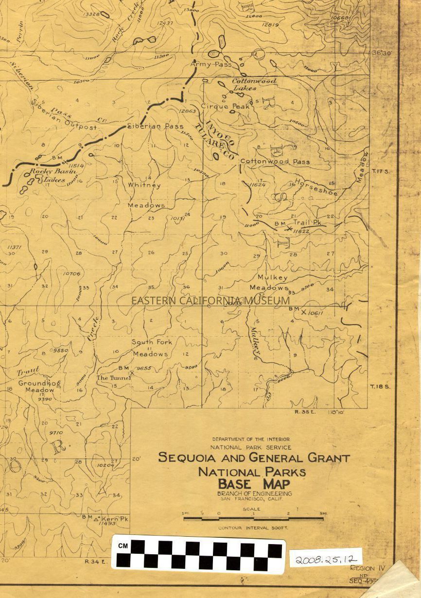 Paper map "Sequoia and General Grant National Parks Base Map". August, 1932. Branch of Engineering, San Francisco, Calif. Prepared by U. S. G. S, from base maps and other sources. Revised in 1935.Collection