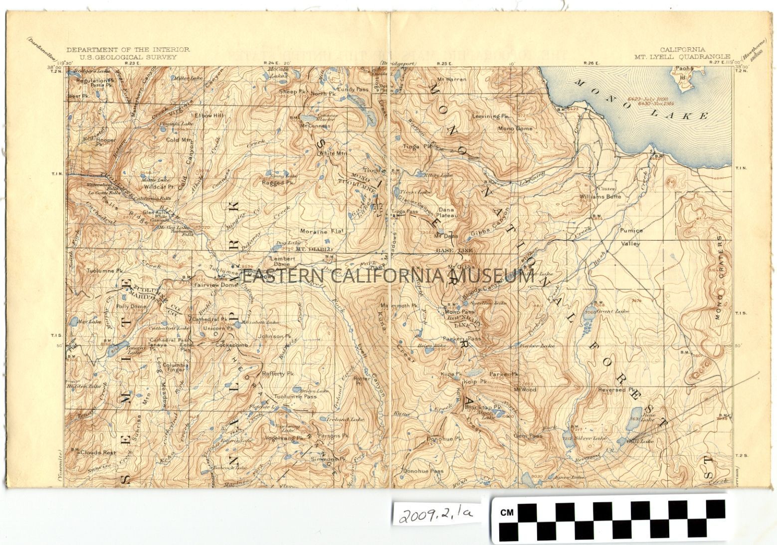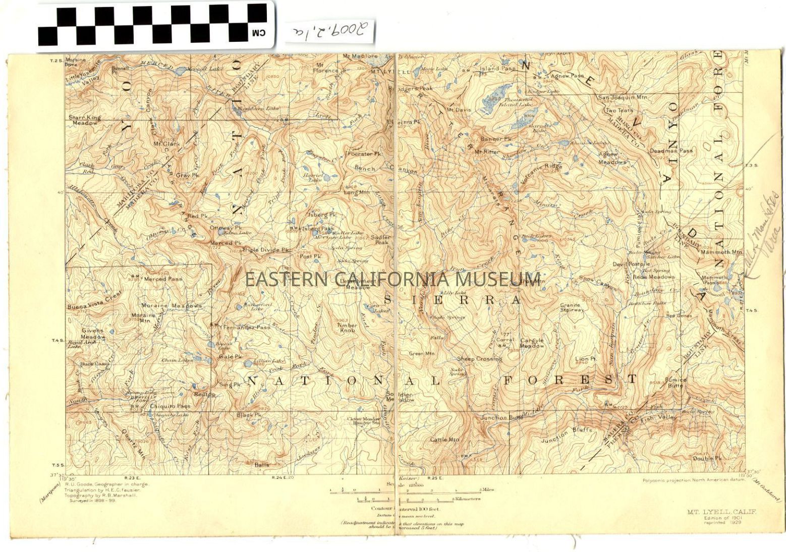 Linen backed USGS 15 Minute topographic quadrangle; 1901 edition reprinted in 1929; Mt. Lyell, Calif. Folded in quarters in the back of Manuscript 2009.2.1 indicating project areas for the report.