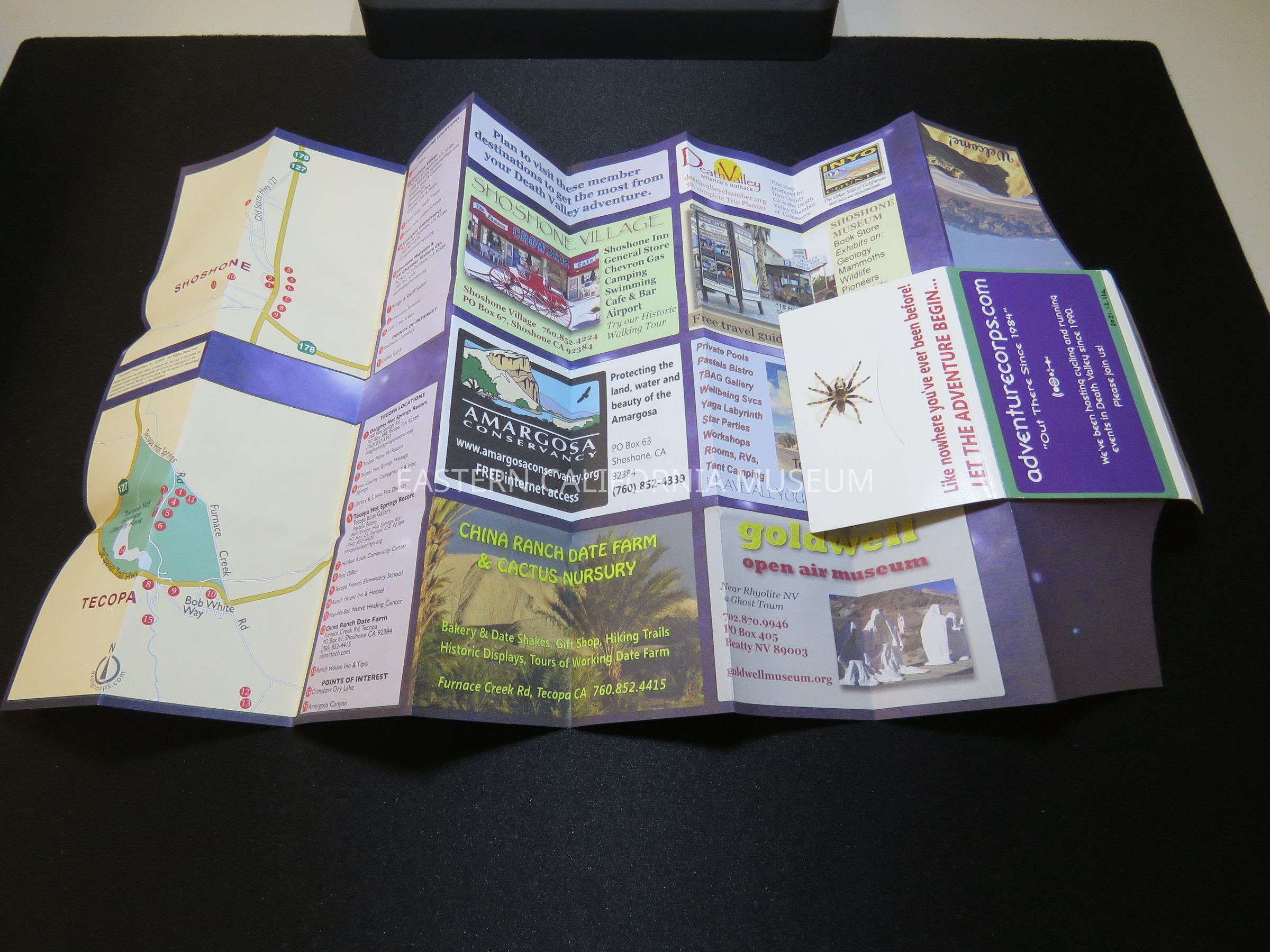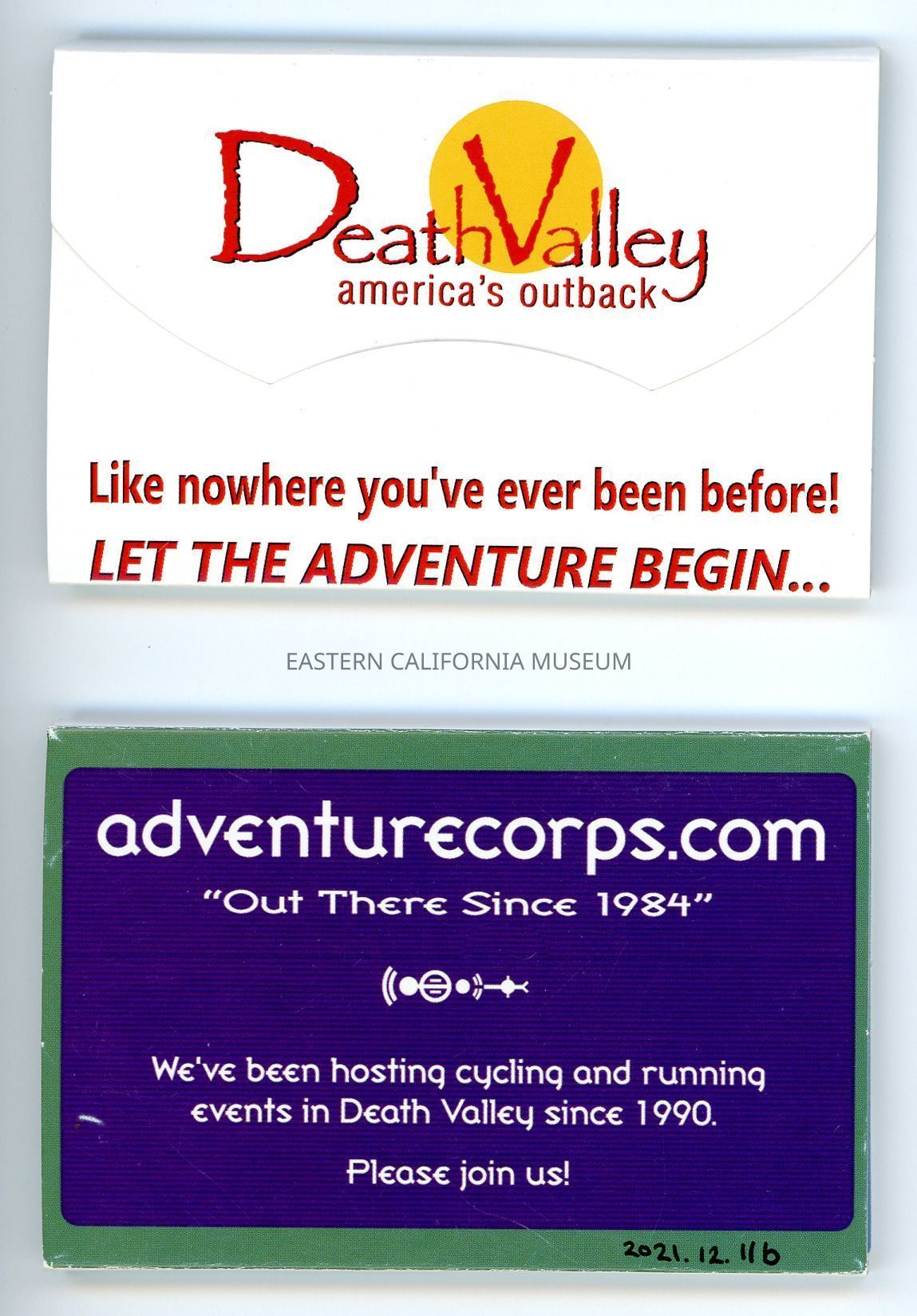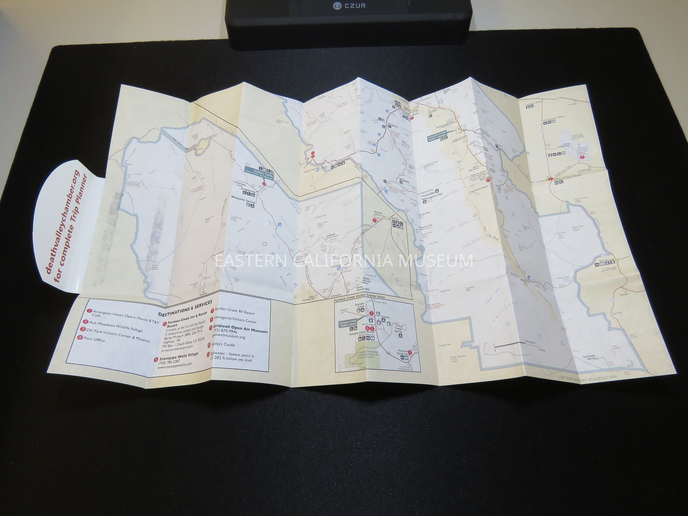 Two copies of a small, folding tourist/souvenir map for Death Valley. It has advertisements from Adventure Corps, Death Valley Chamber, and Furnace Creek Resort on the outside "case" part.