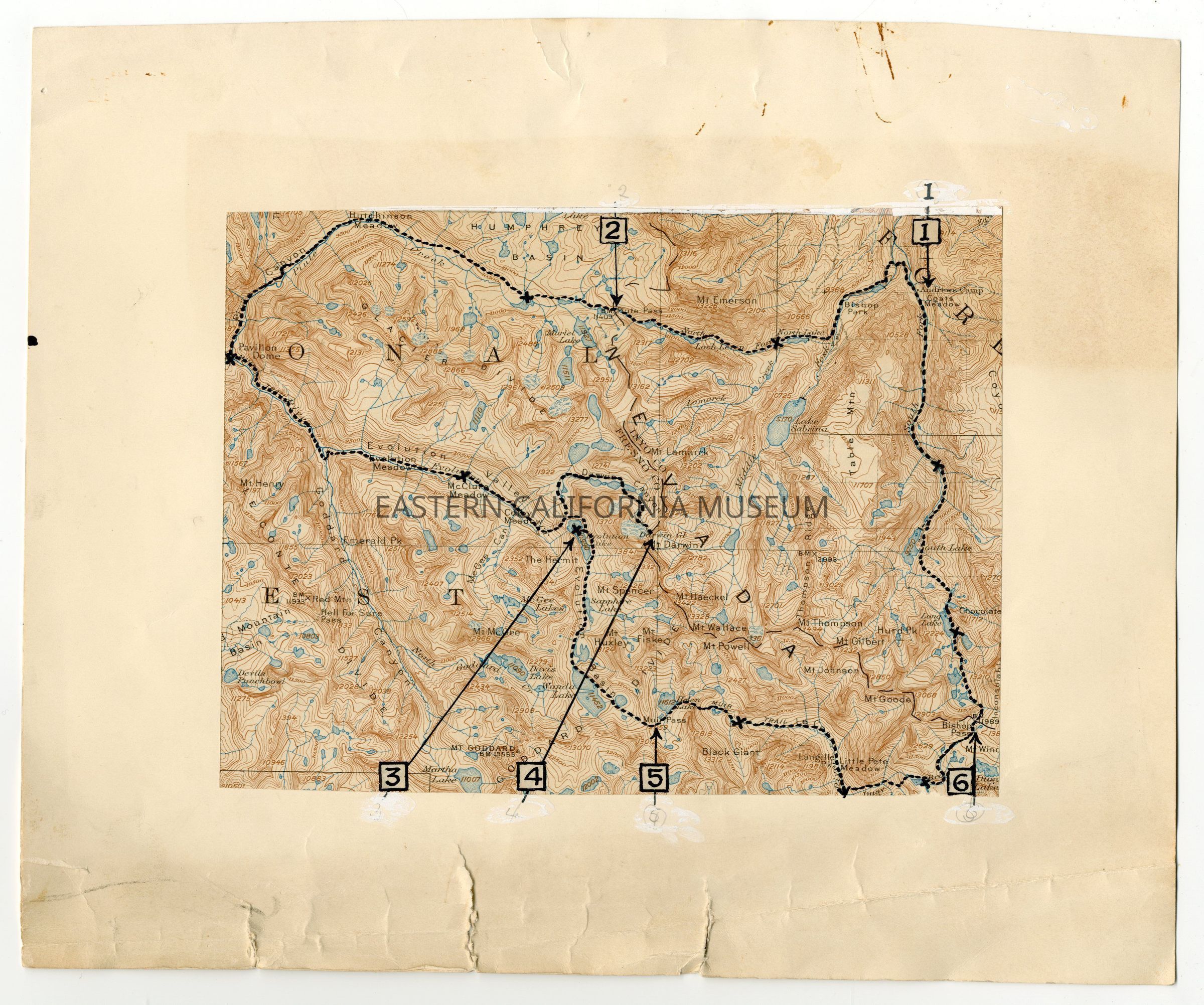 Partial map from the collection of Chester Versteeg. It shows the Sierra northwest of Bishop Pass. There are six areas marked, but not labeled.