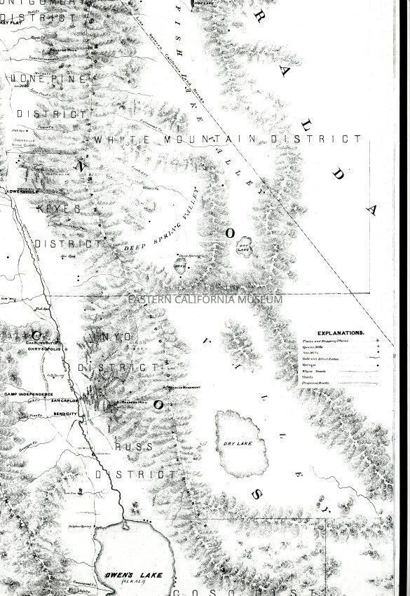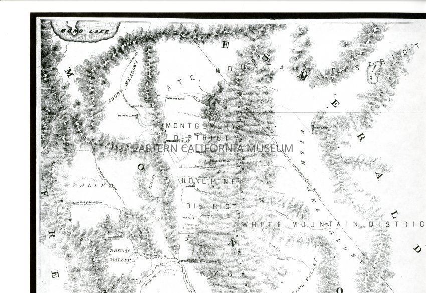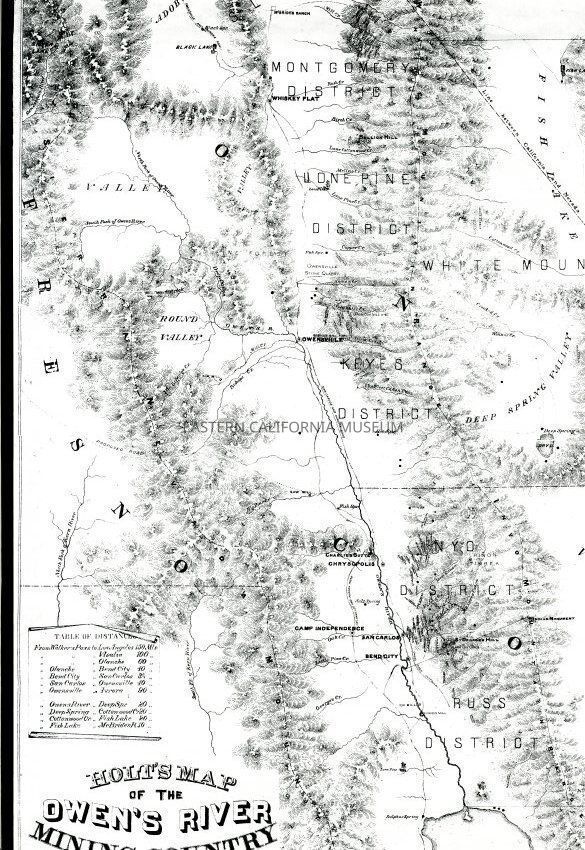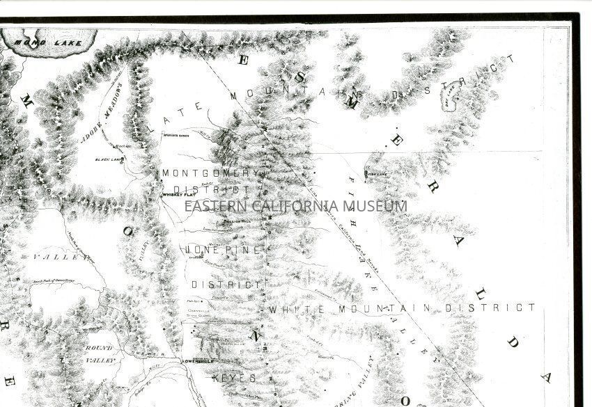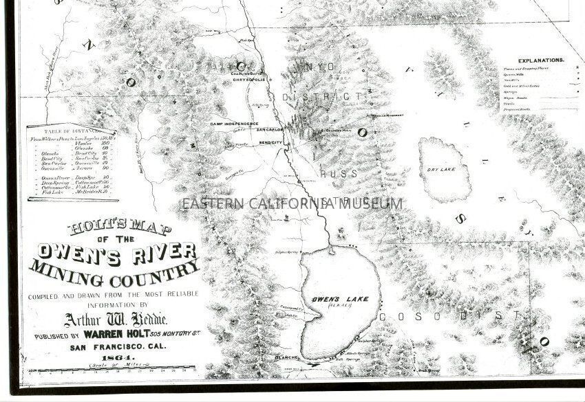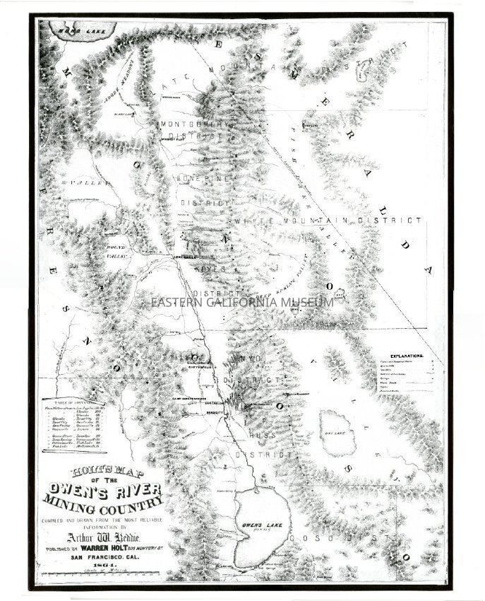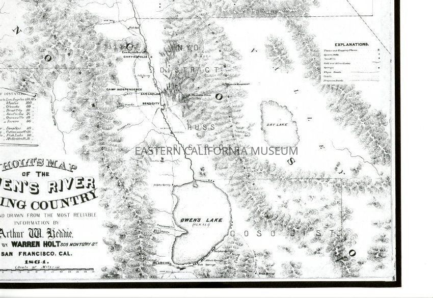 Mounted copy of the 1864 Holt's Map of the Owen's [Owens] River Mining Country. Compiled and drawn from the most reliable information by Arthur W. Reddie and published by Warren Holt of San Francisco. It shows Mono Lake in the north and Owen's [Owens] Lake in the south.