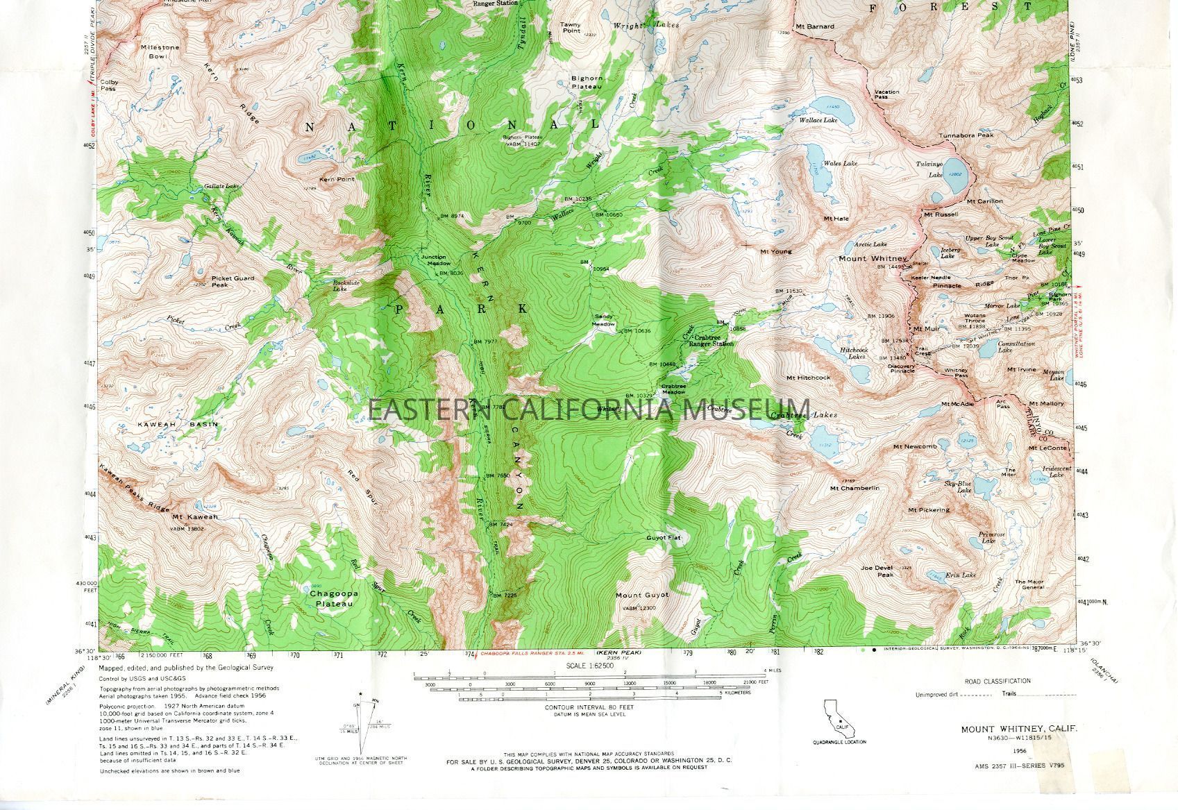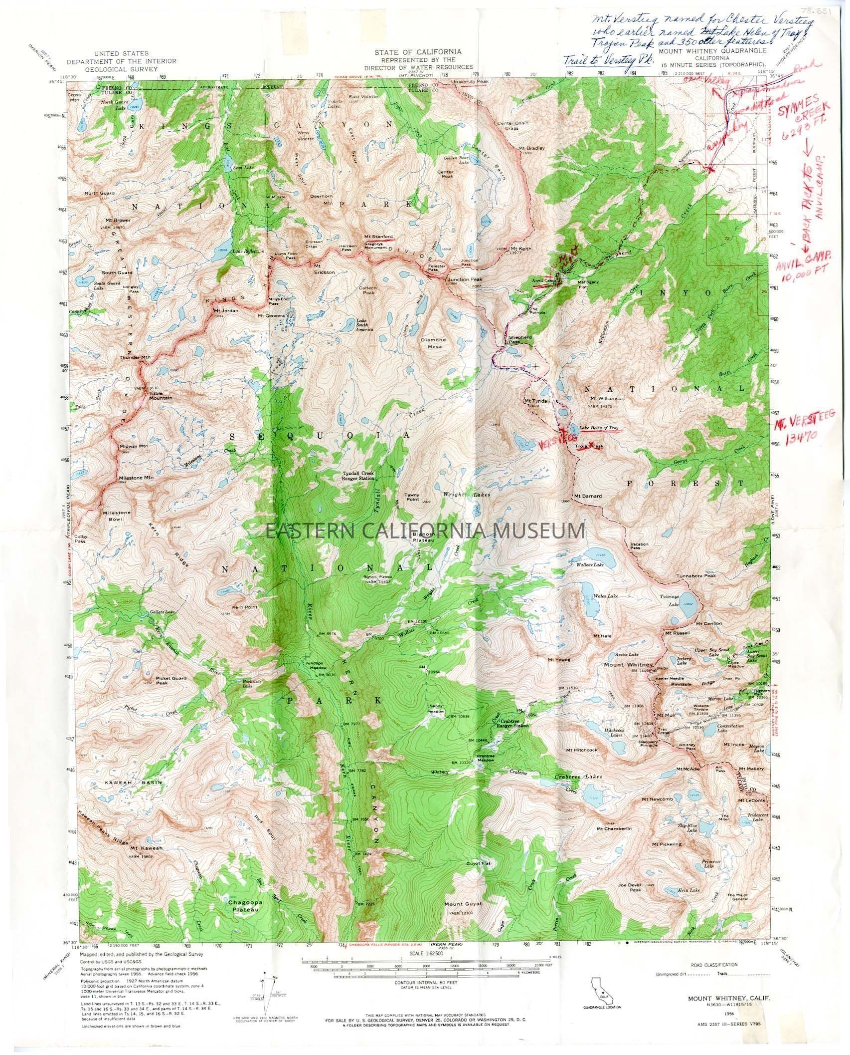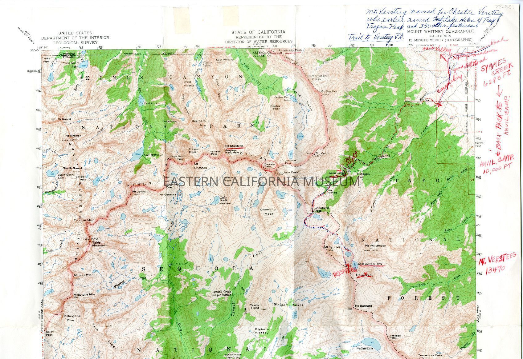 Topographical map of the Mt. Whitney Quadrangle (15 minute series, advance field check 1956) with the trail marked in red from Independence to Mt. Versteeg (13,470 ft.).