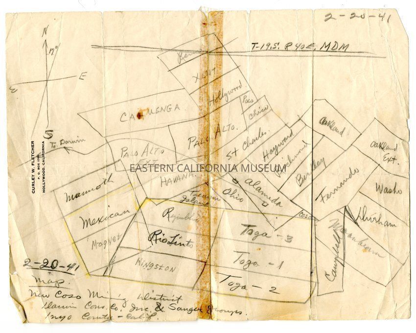 Hand drawn map of the New Coso Mining District, 1941, on Curley Fletcher letterhead
