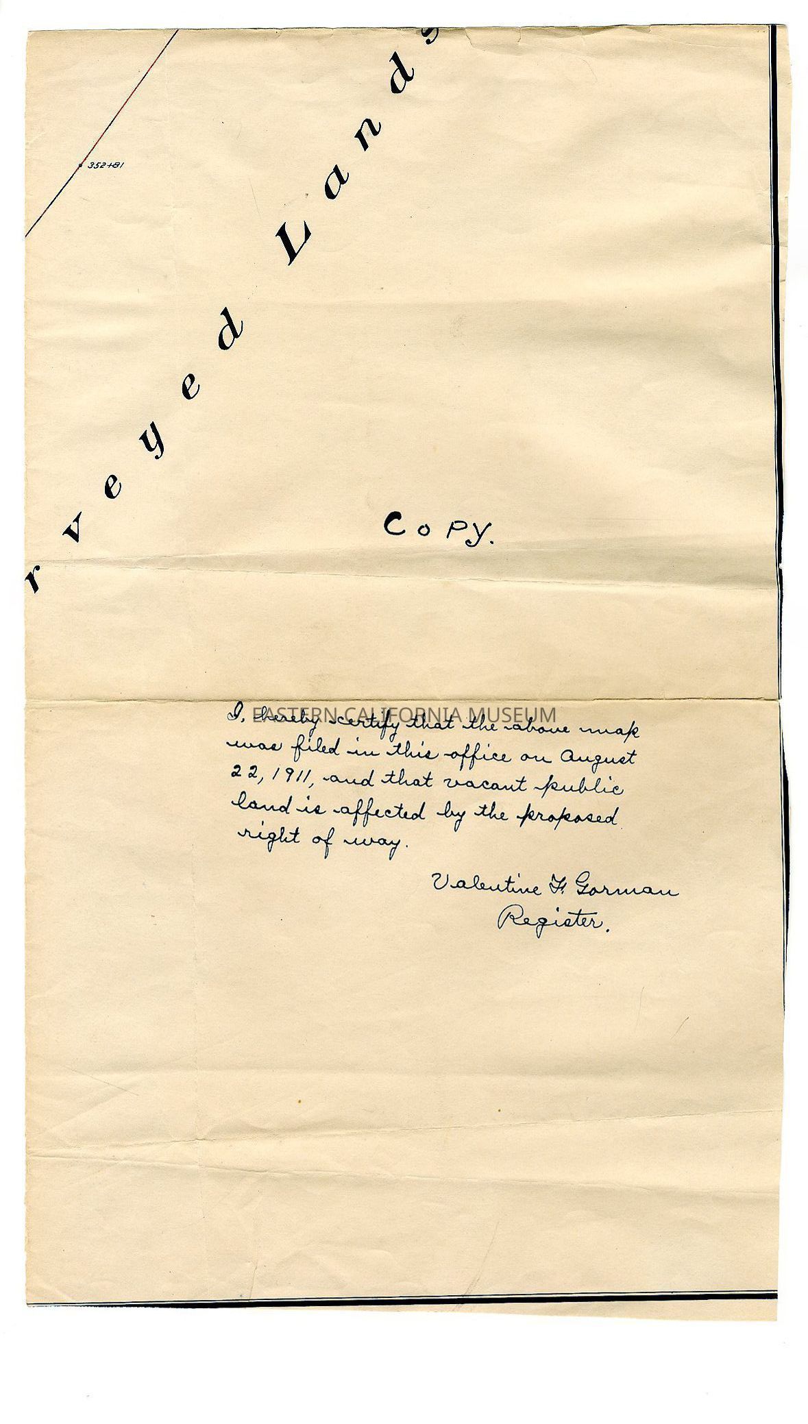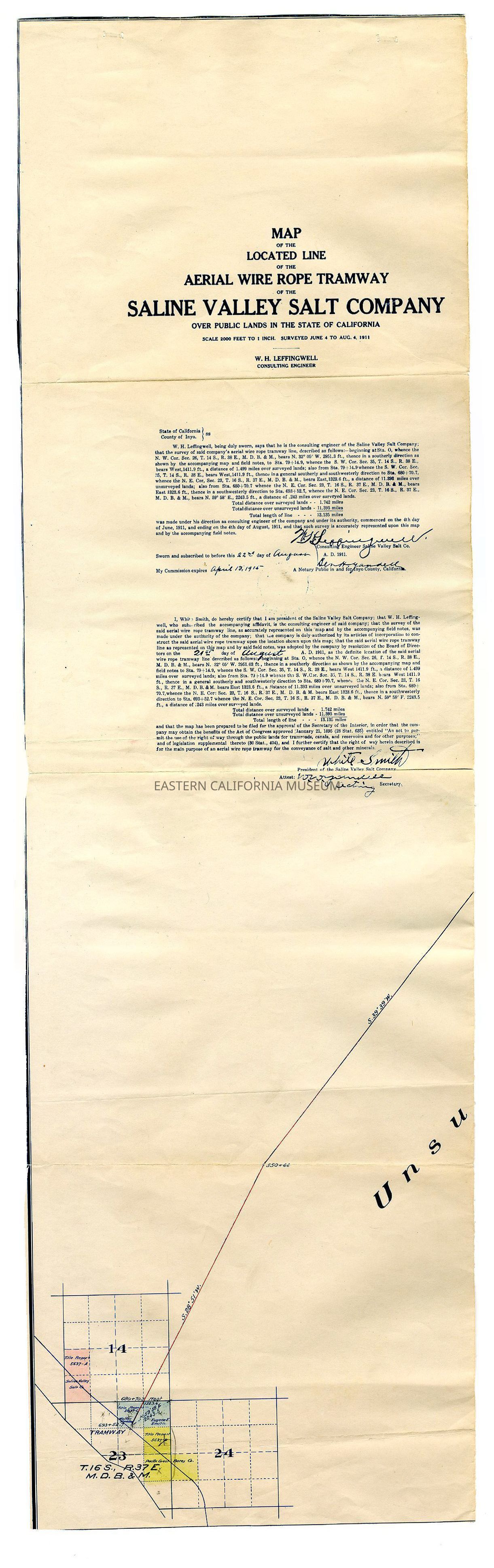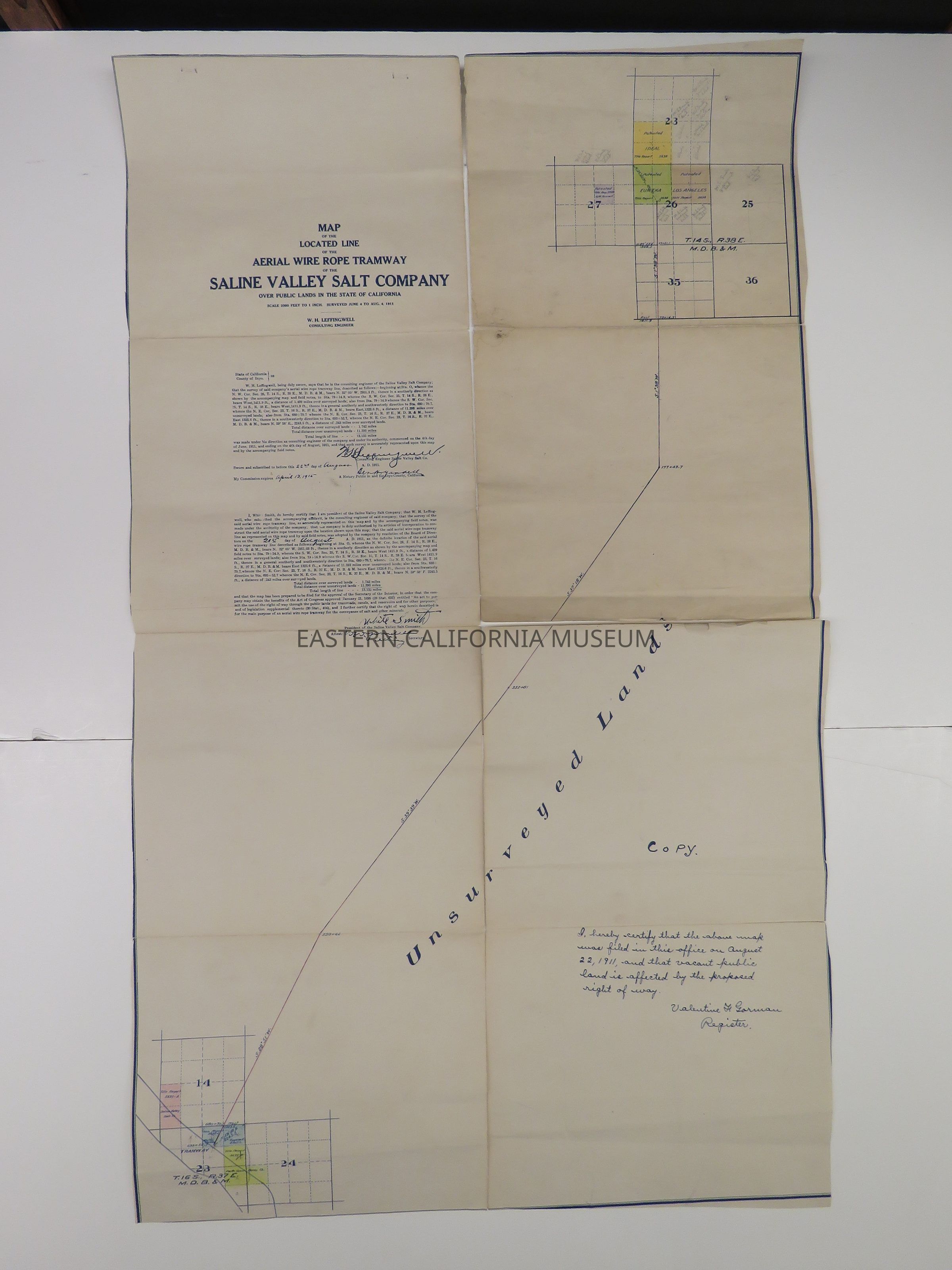 Copy of a map of the Located Line of the Aerial Wire Rope Tramway of the Saline Valley Salt Company, dated August 4, 1911. It was filed in the Inyo County Register's Office on August 22, 1911 and signed by Valentine F. Gorman, Register.