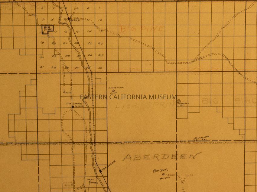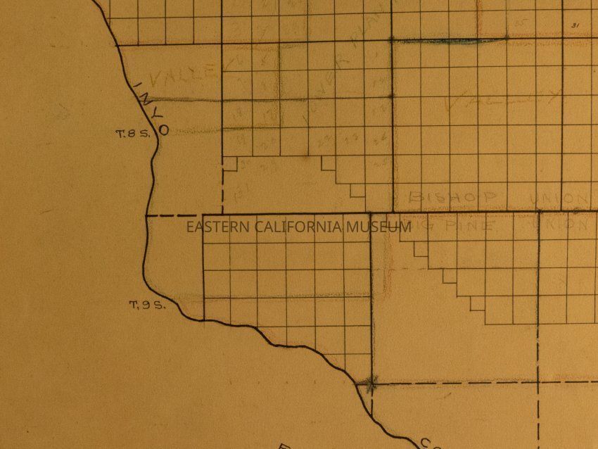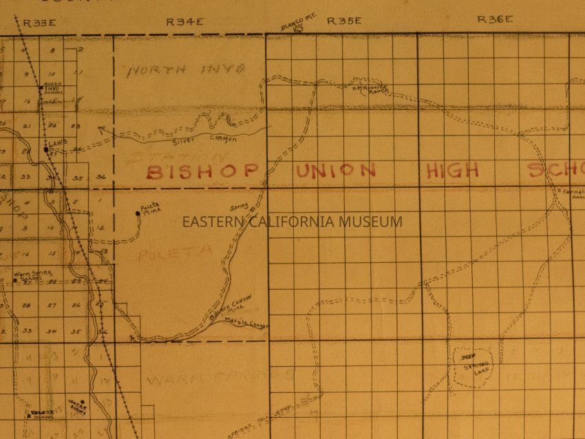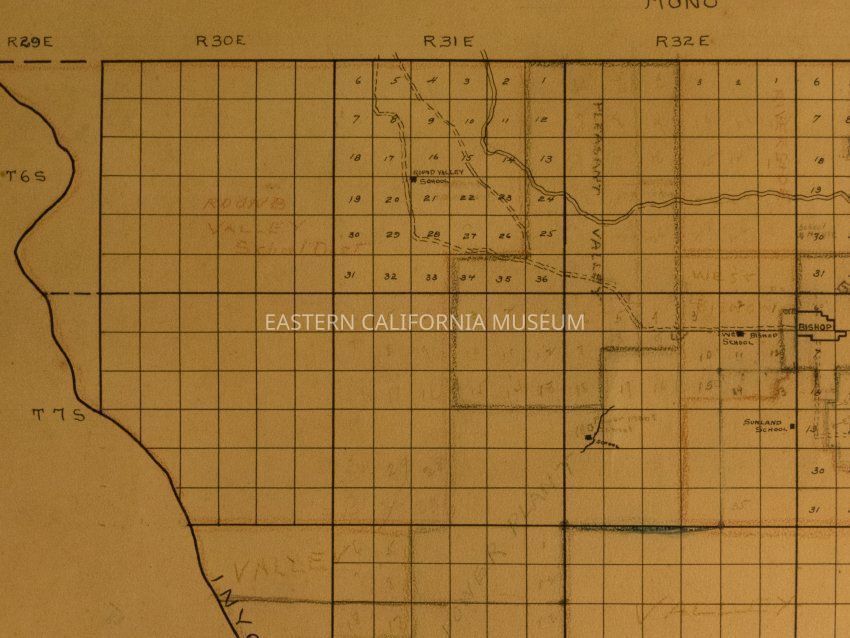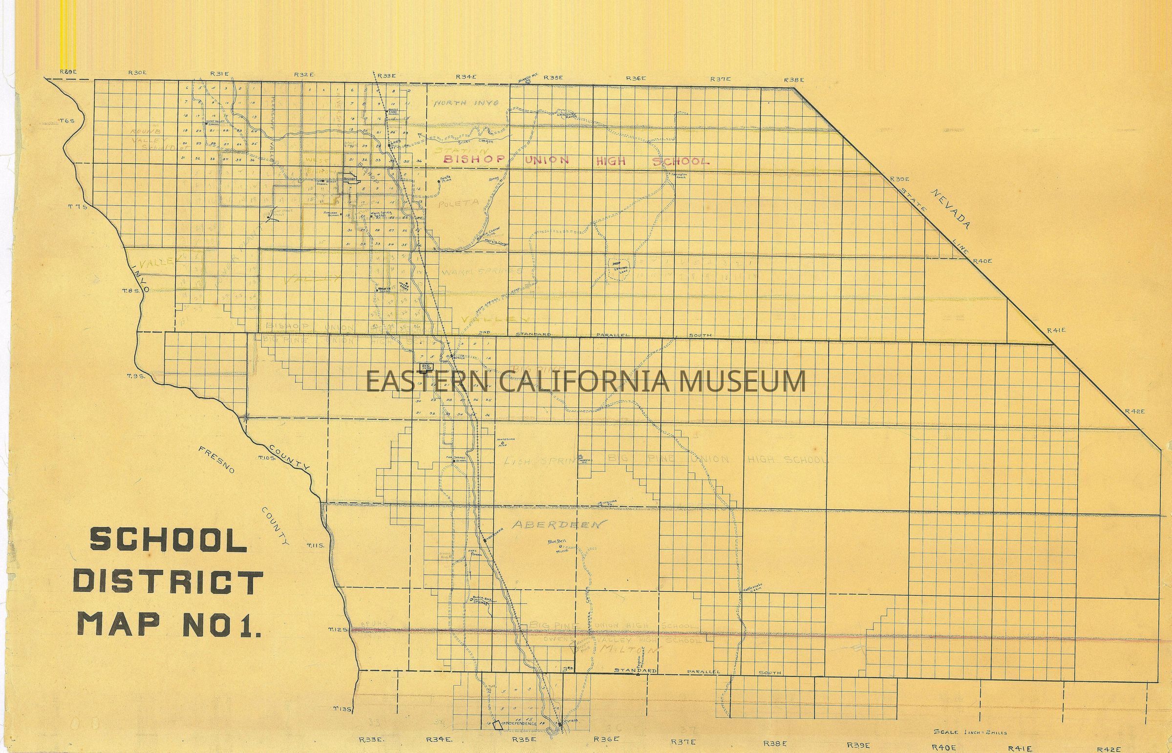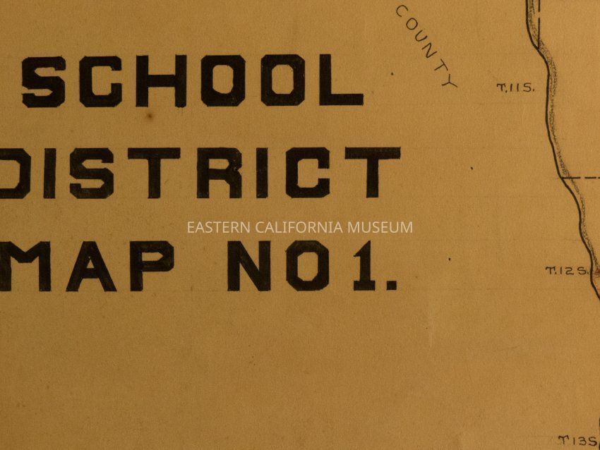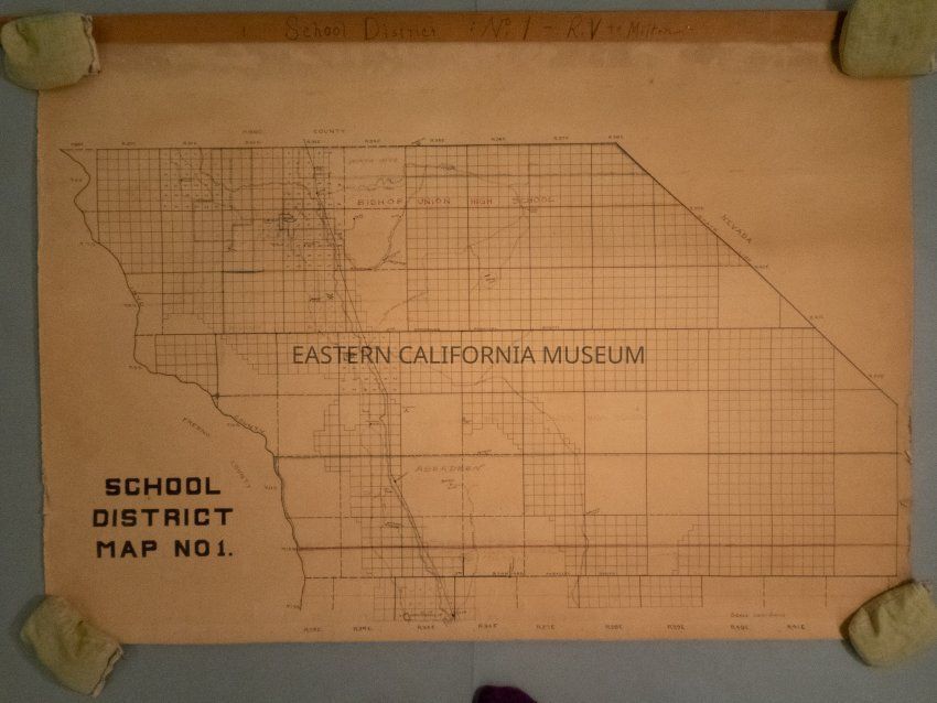 Plat map showing land ownership in School District No. 1 (Round Valley to Milton/Fort Independence). Shows schools, some mine sites, roads, and railroad stations. It dates to pre-1928.Provenance