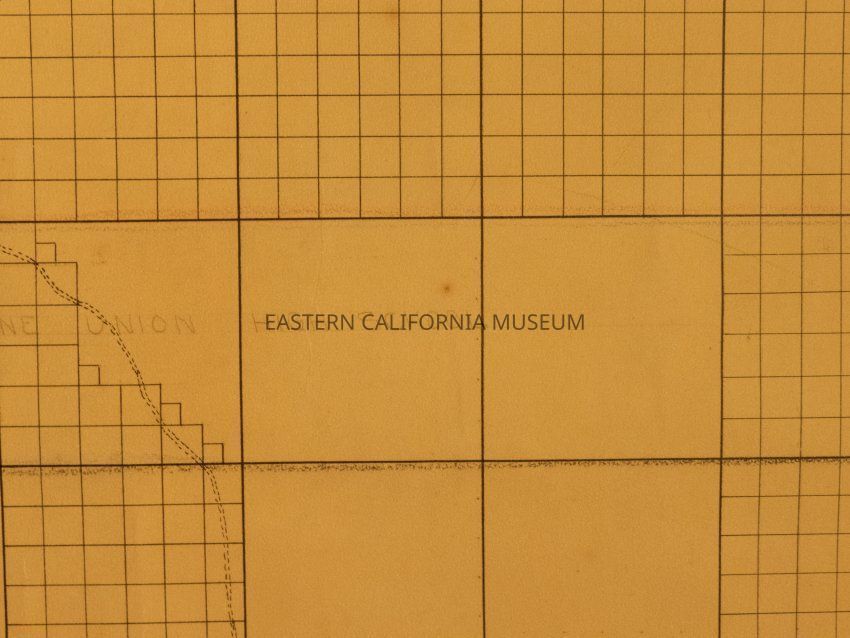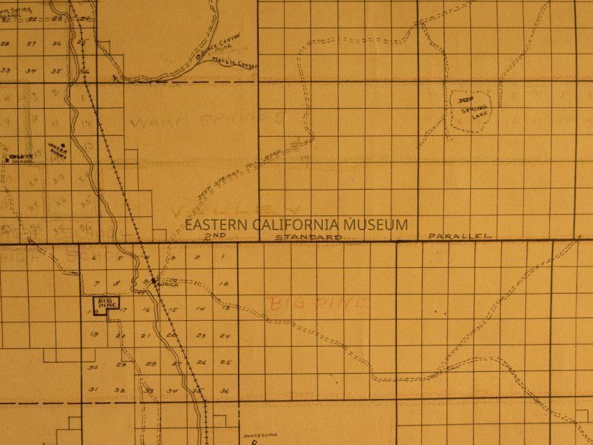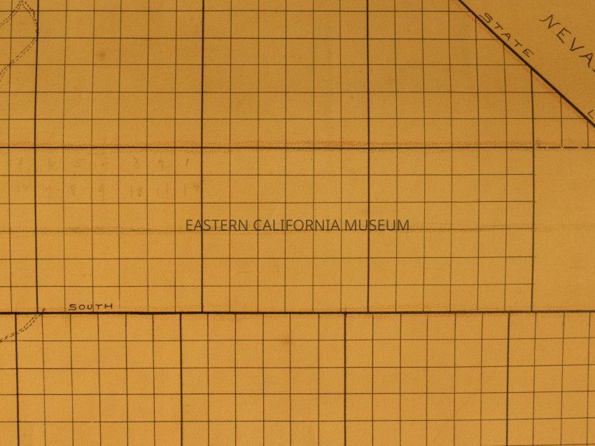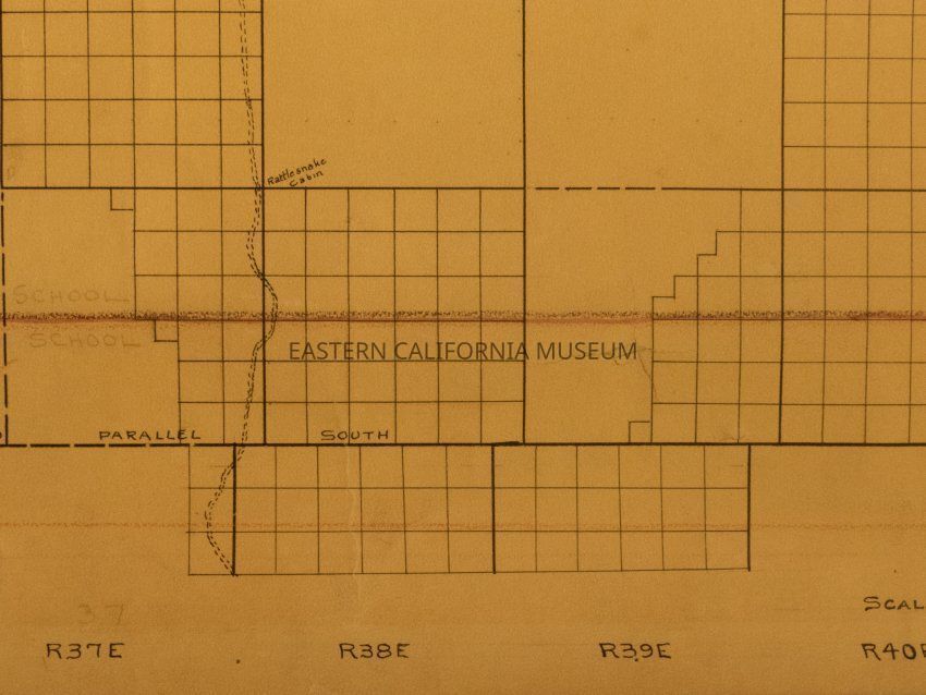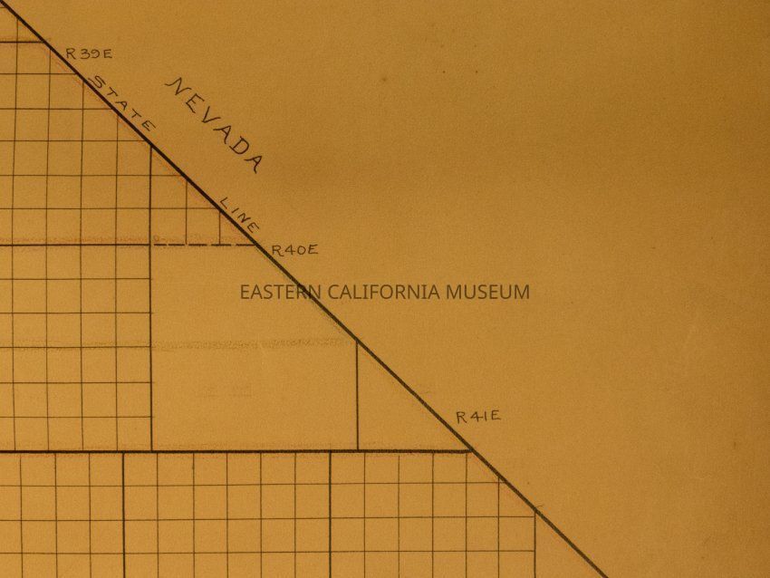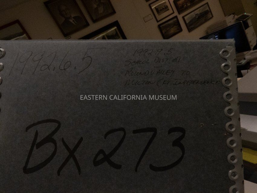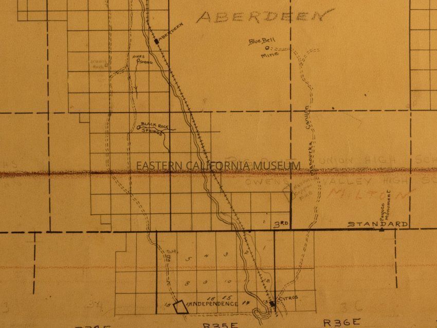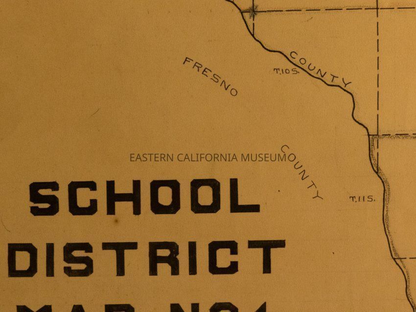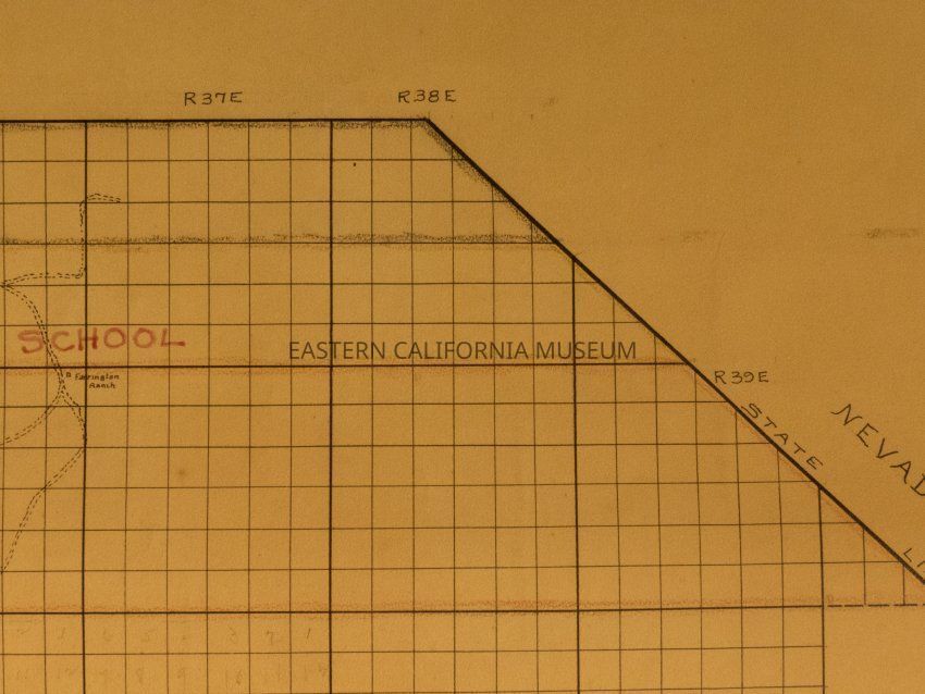 Plat map showing land ownership in School District No. 1 (Round Valley to Milton/Fort Independence). Shows schools, some mine sites, roads, and railroad stations. It dates to pre-1928.Provenance