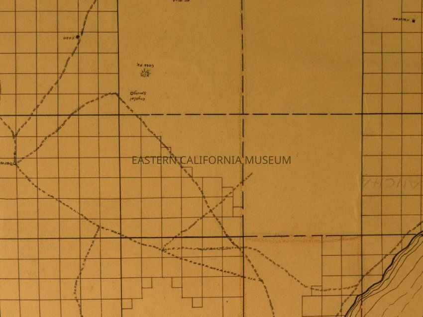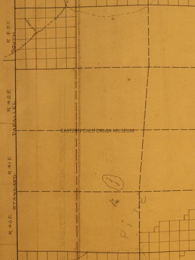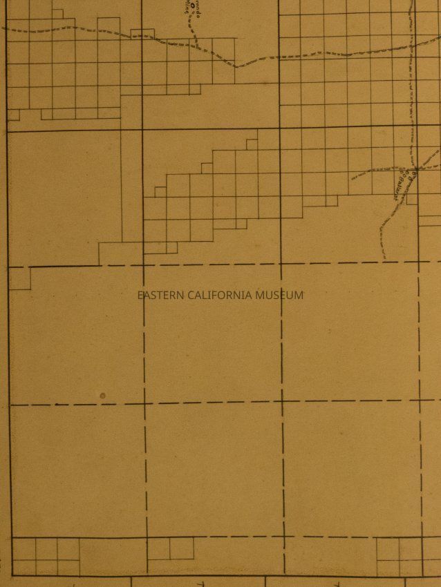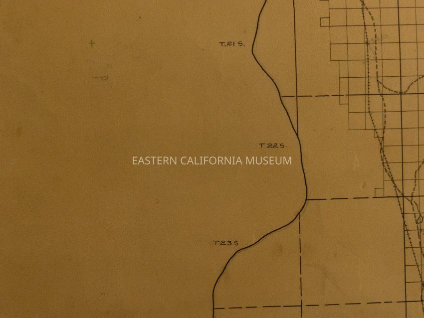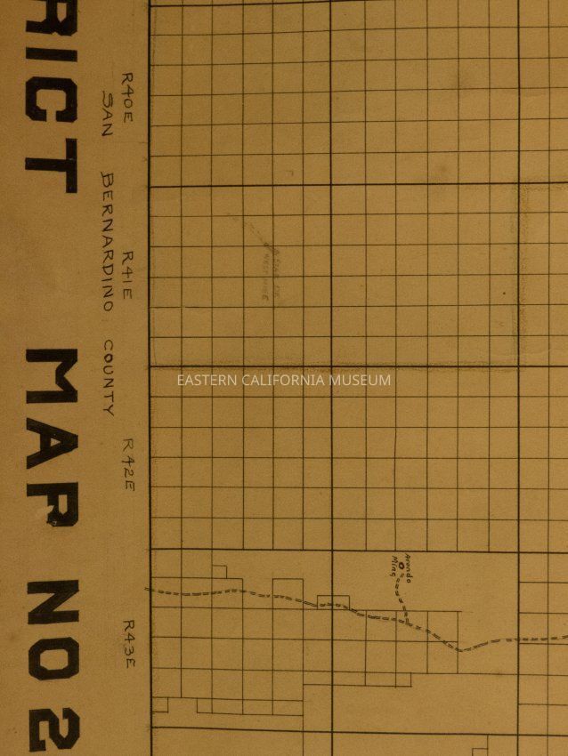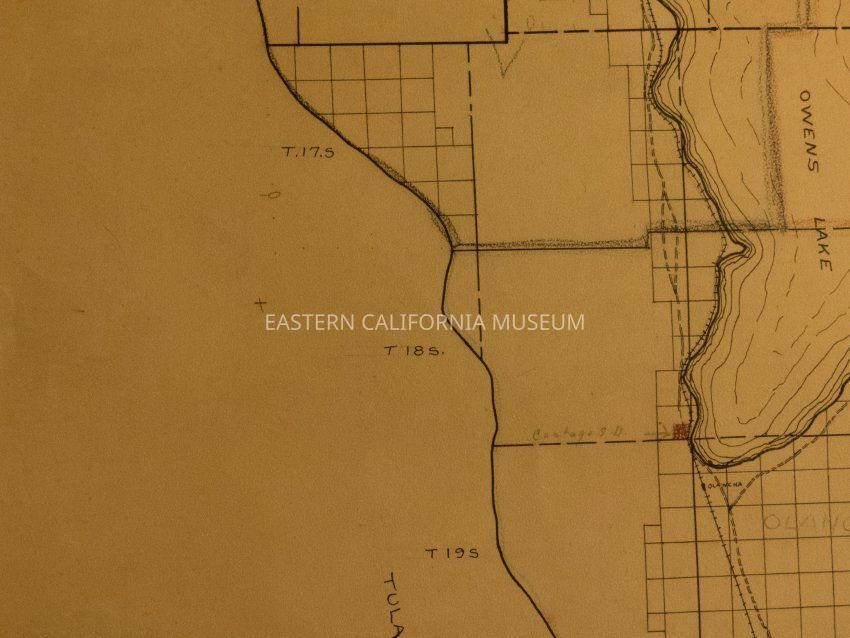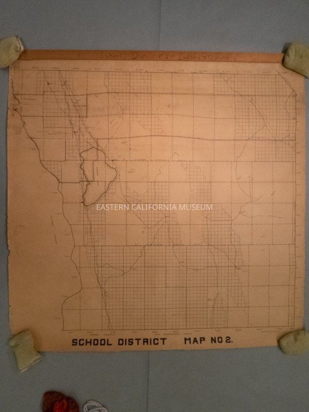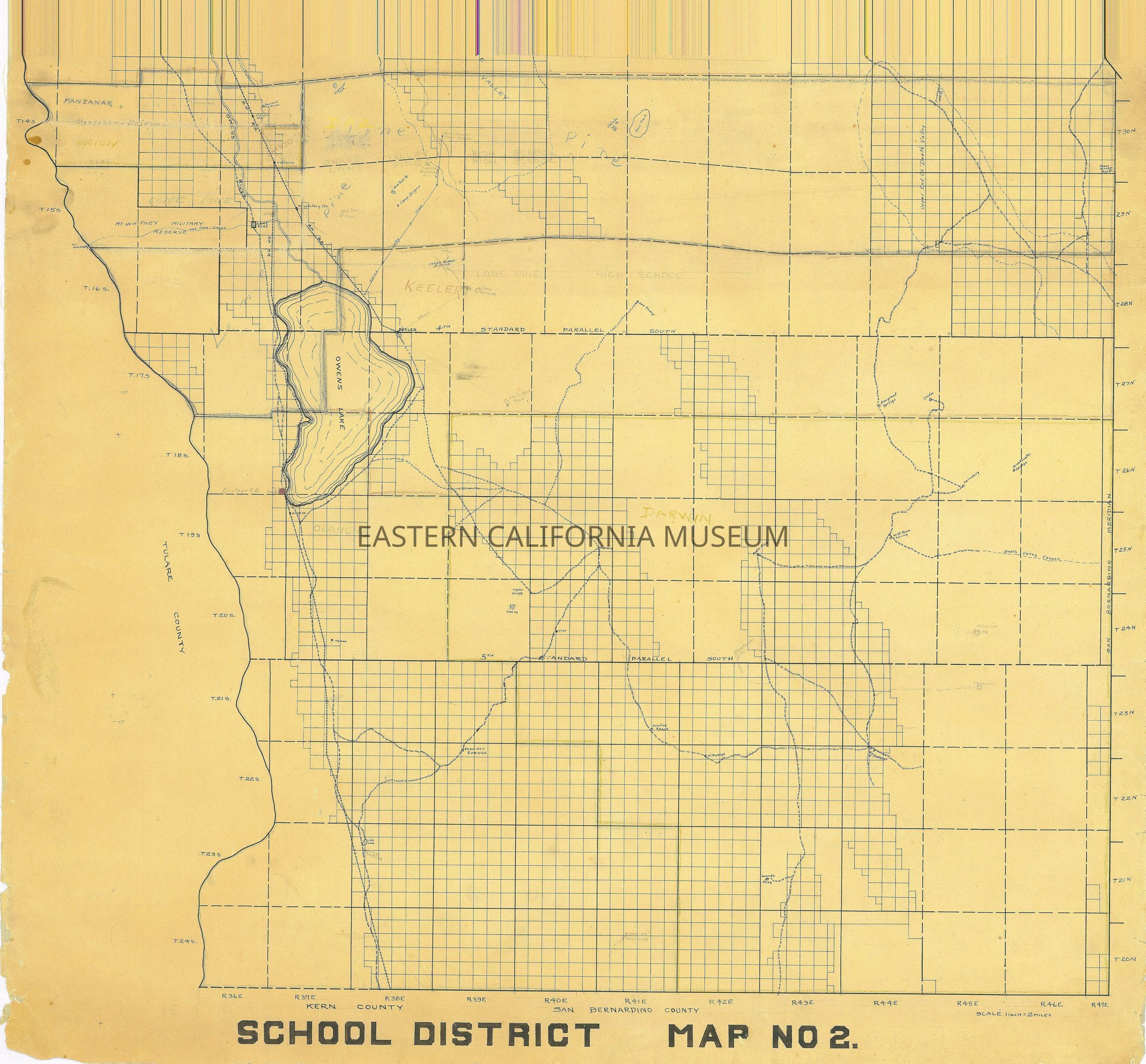 Plat map showing land ownership in School District No. 2 (Independence to Olancha). Shows schools, some mine sites, roads, and railroad stations. It dates to pre-1928.Provenance