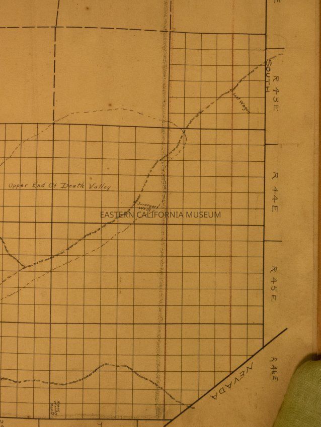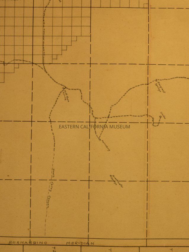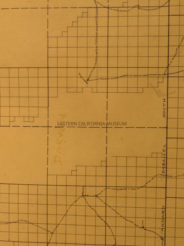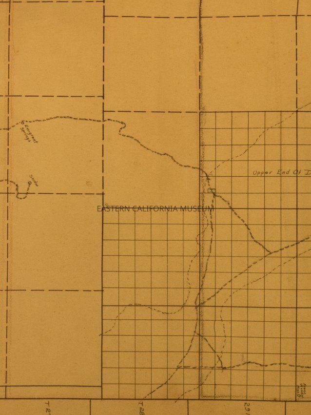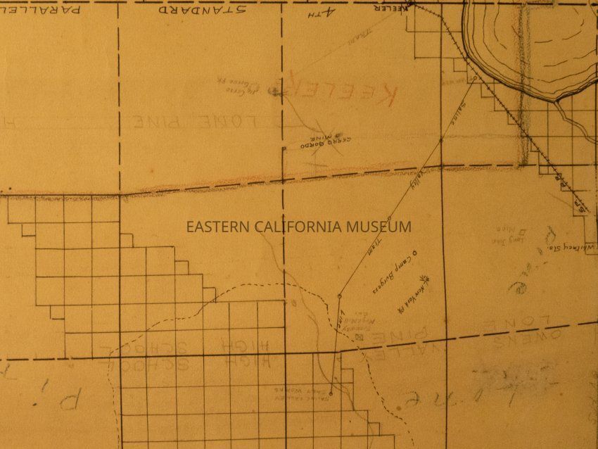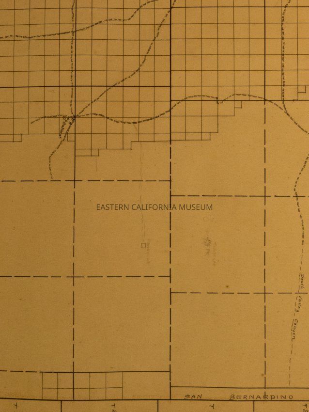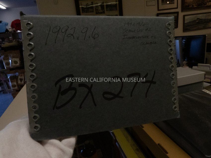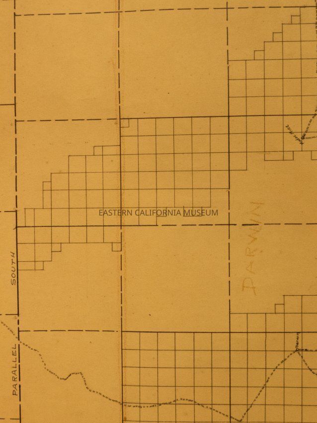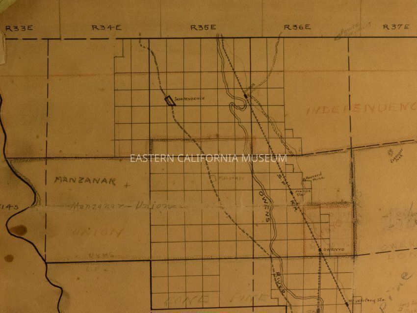 Plat map showing land ownership in School District No. 2 (Independence to Olancha). Shows schools, some mine sites, roads, and railroad stations. It dates to pre-1928.Provenance