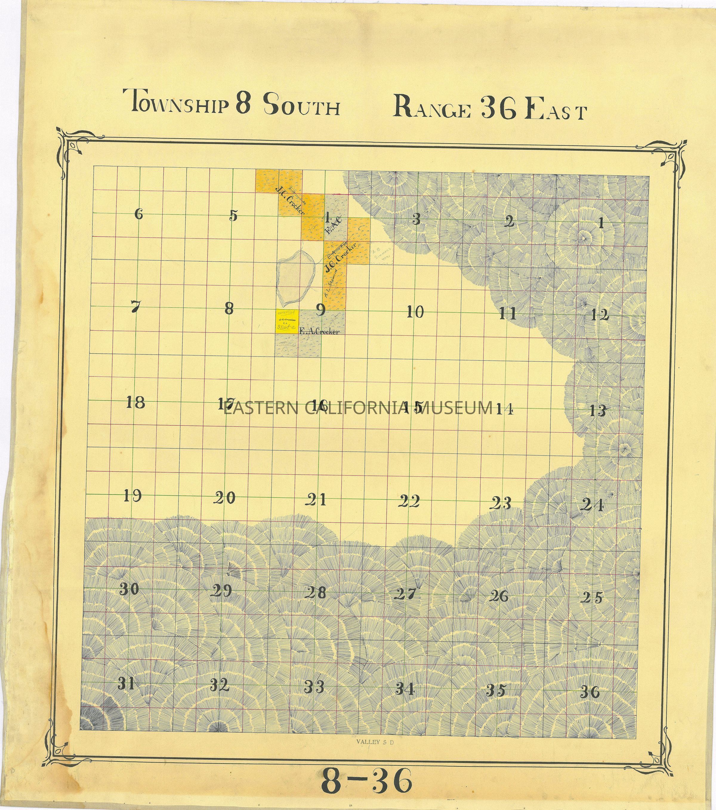 Plat map showing land ownership circa 1900s-1920s. Township 8 South, Range 36 East.
