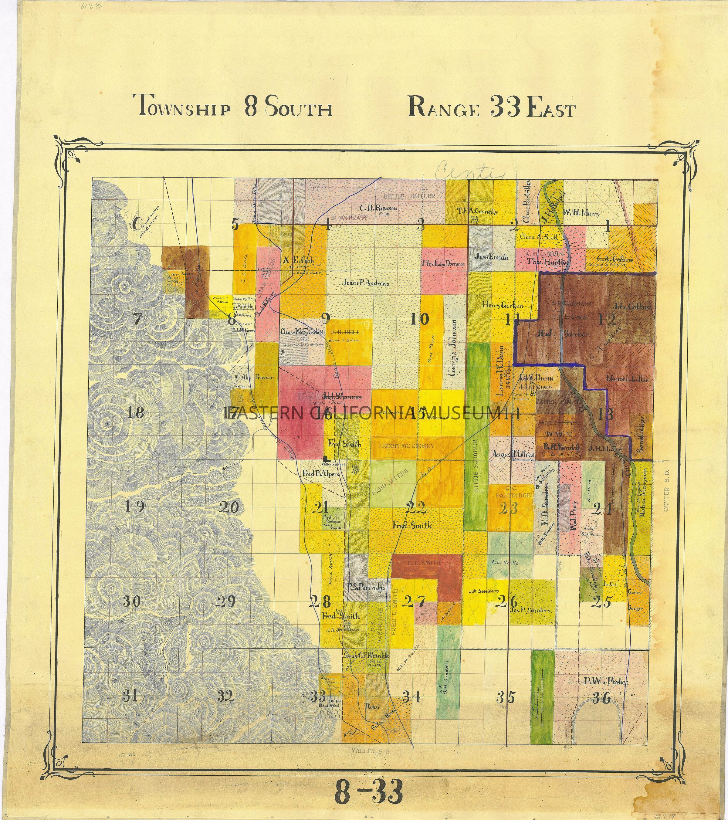 Plat map showing land ownership circa 1900s-1920s. Township 8 South, Range 33 East.