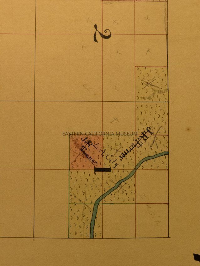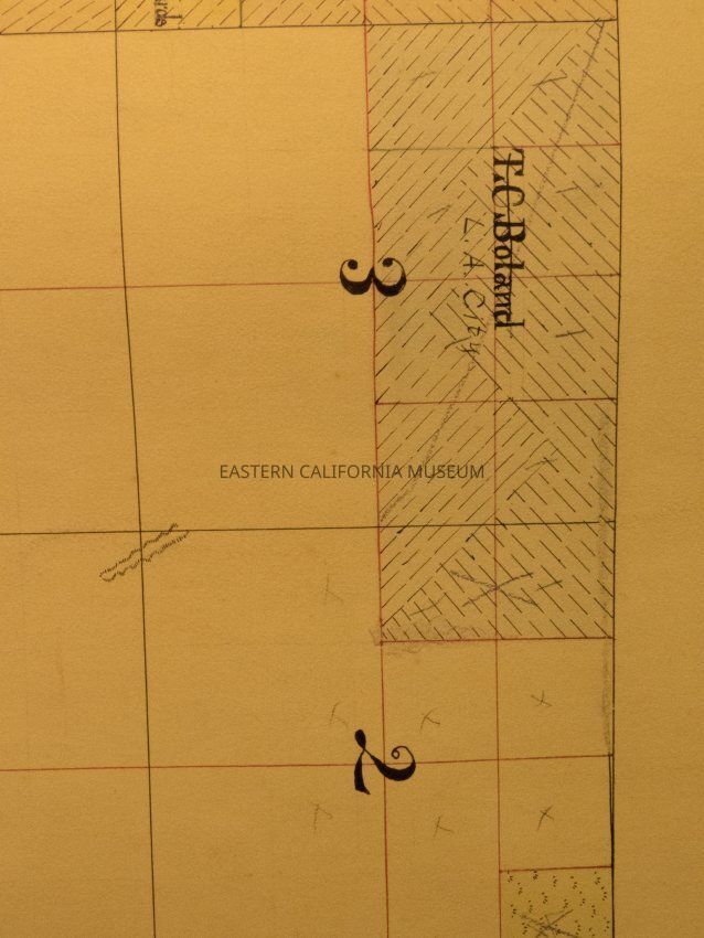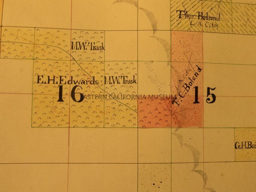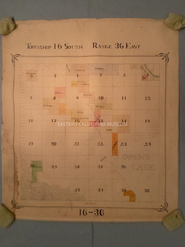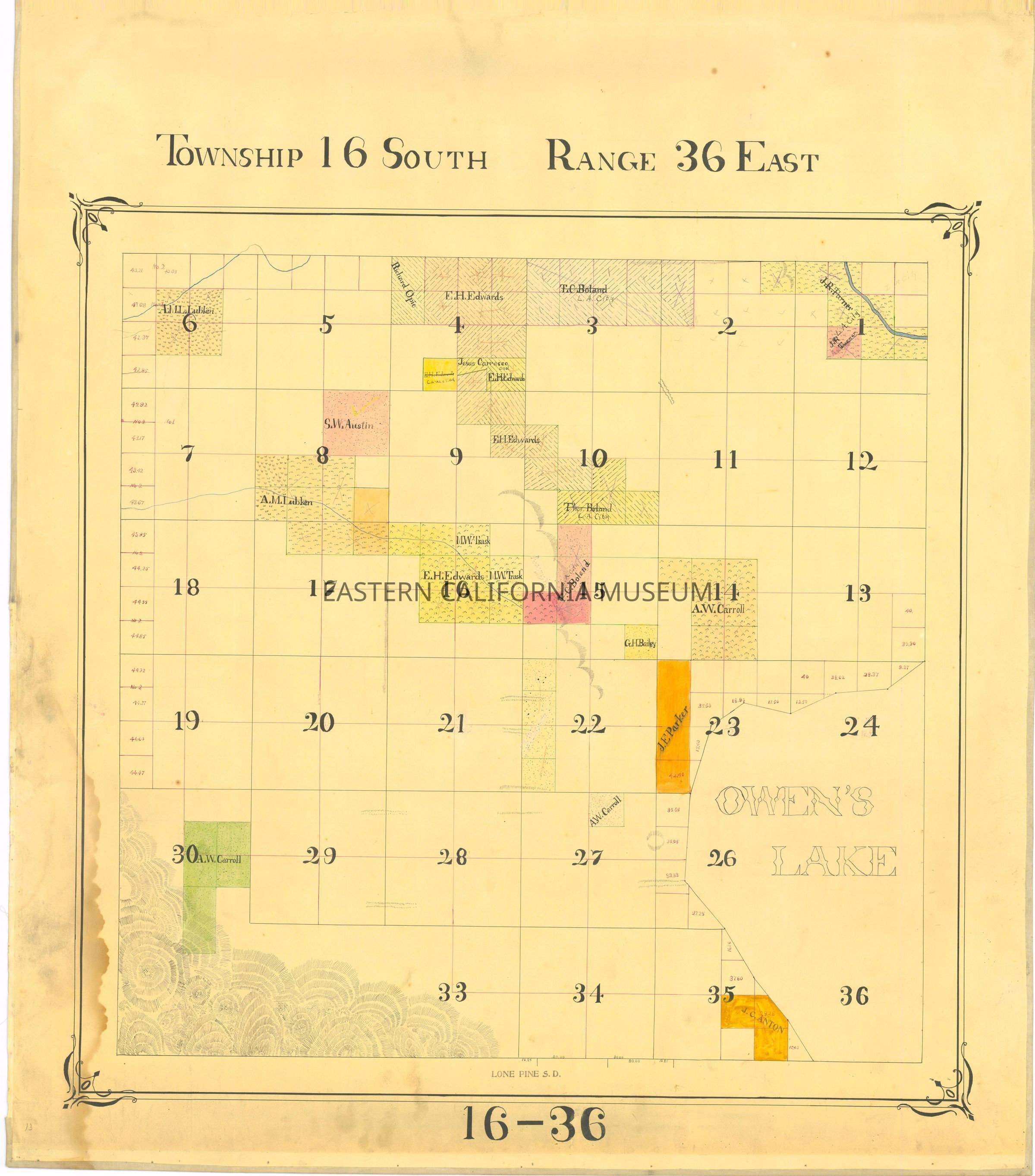 Plat map showing land ownership in the Lone Pine area circa 1900s-1920s. Township 16 South, Range 36 East.