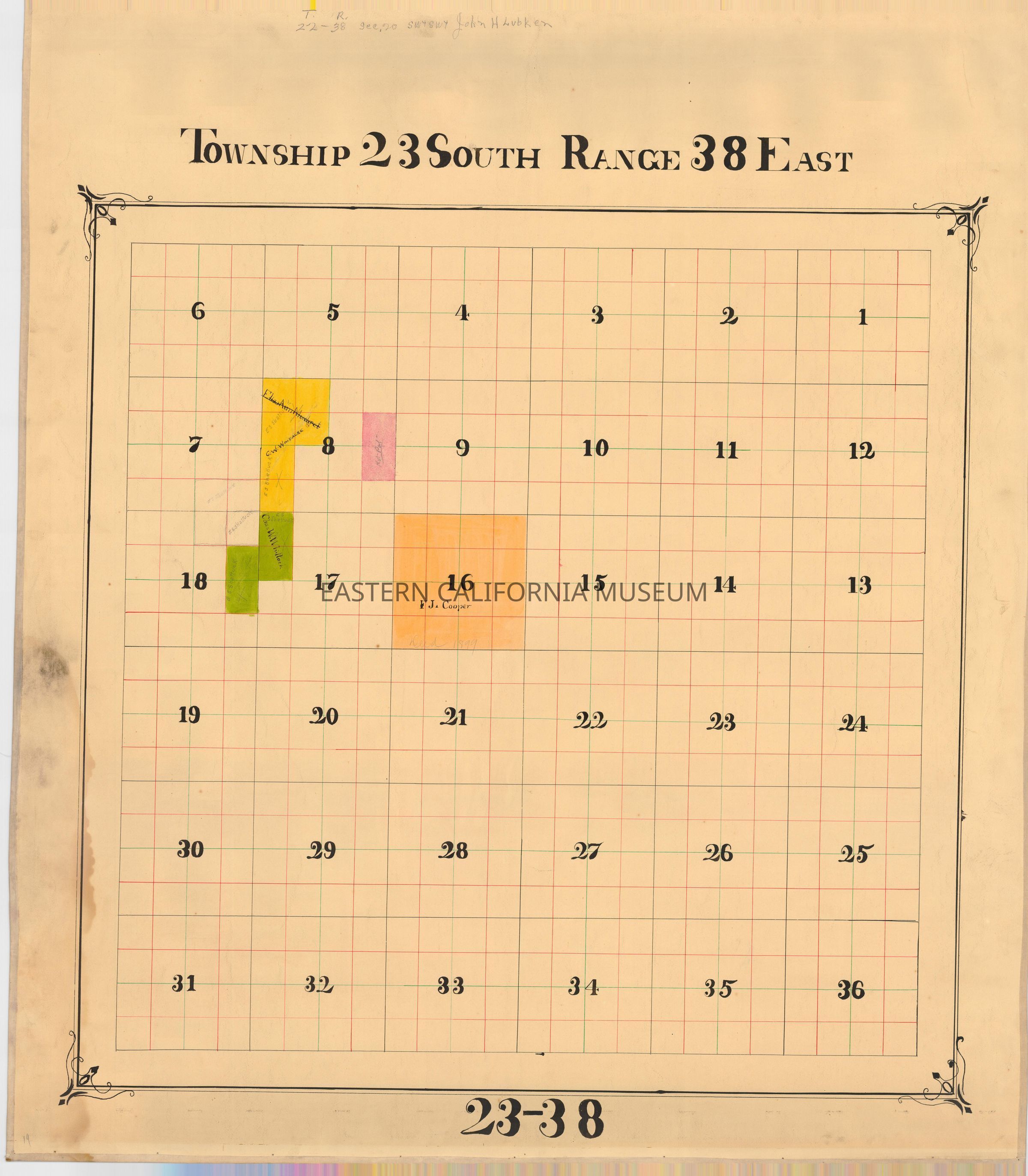 Plat map showing land ownership circa 1900s-1920s. Township 23 South, Range 38 East.