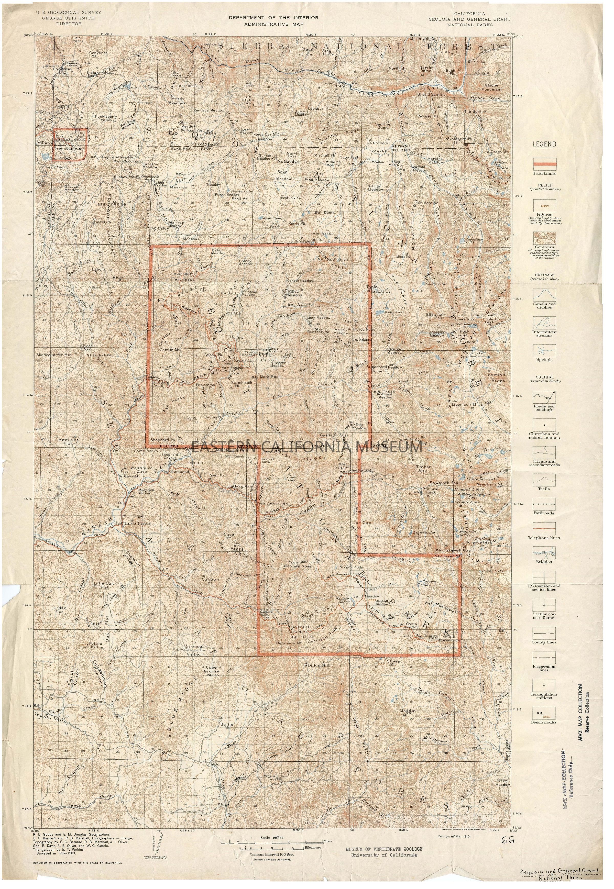 Topographic map: California Sequoia and General Grant National Parks, U.S. Geological Survey, Department of the Interior Administrative Map, edition of Mar. 1910. It has a legend on the right side.