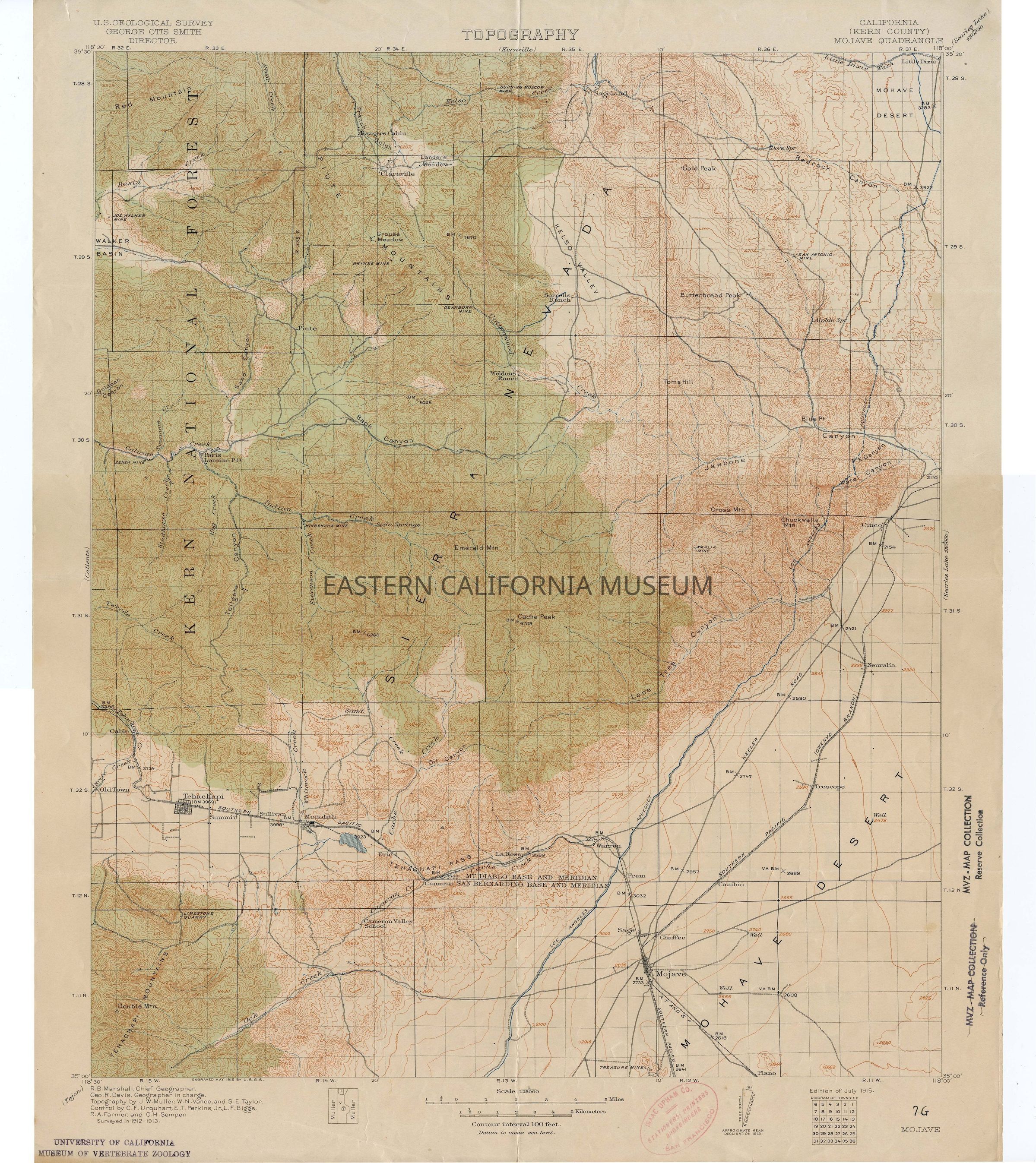 Topographic map: California (Kern County) Mojave Quadrangle, U.S. Geological Survey, edition of July 1915.