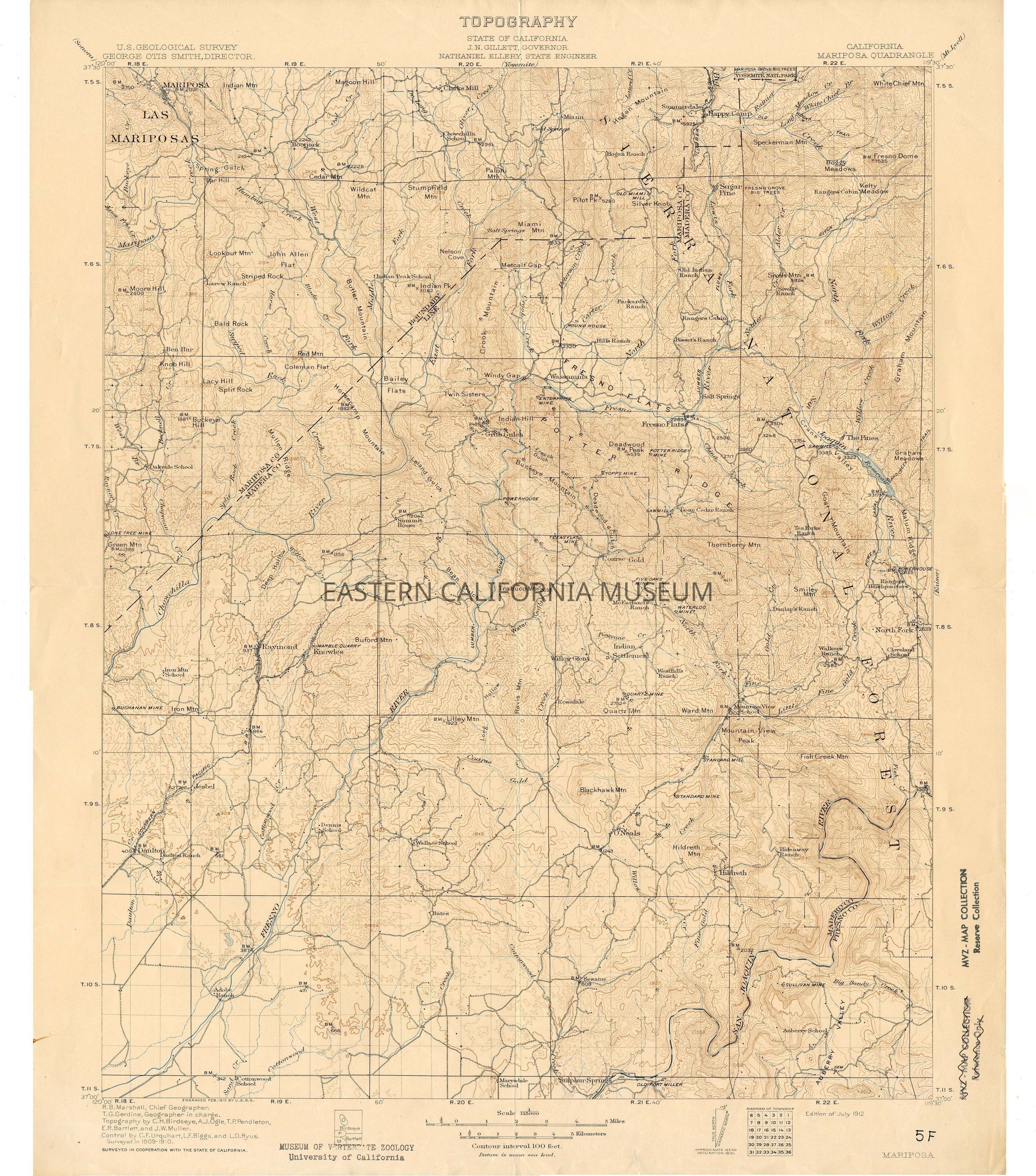 Topographic map: California Mariposa Quadrangle, U.S. Geological Survey, edition of July 1912.