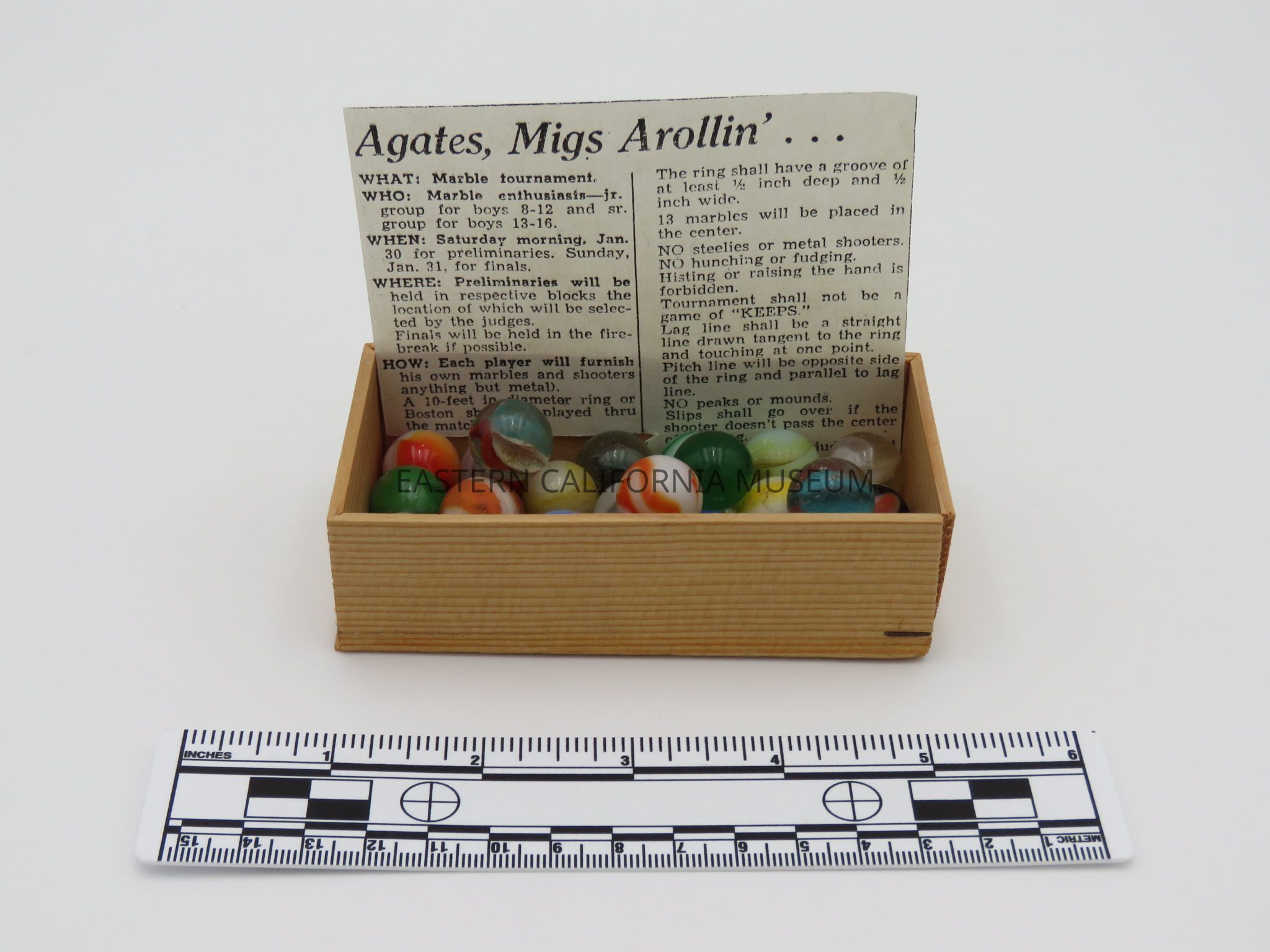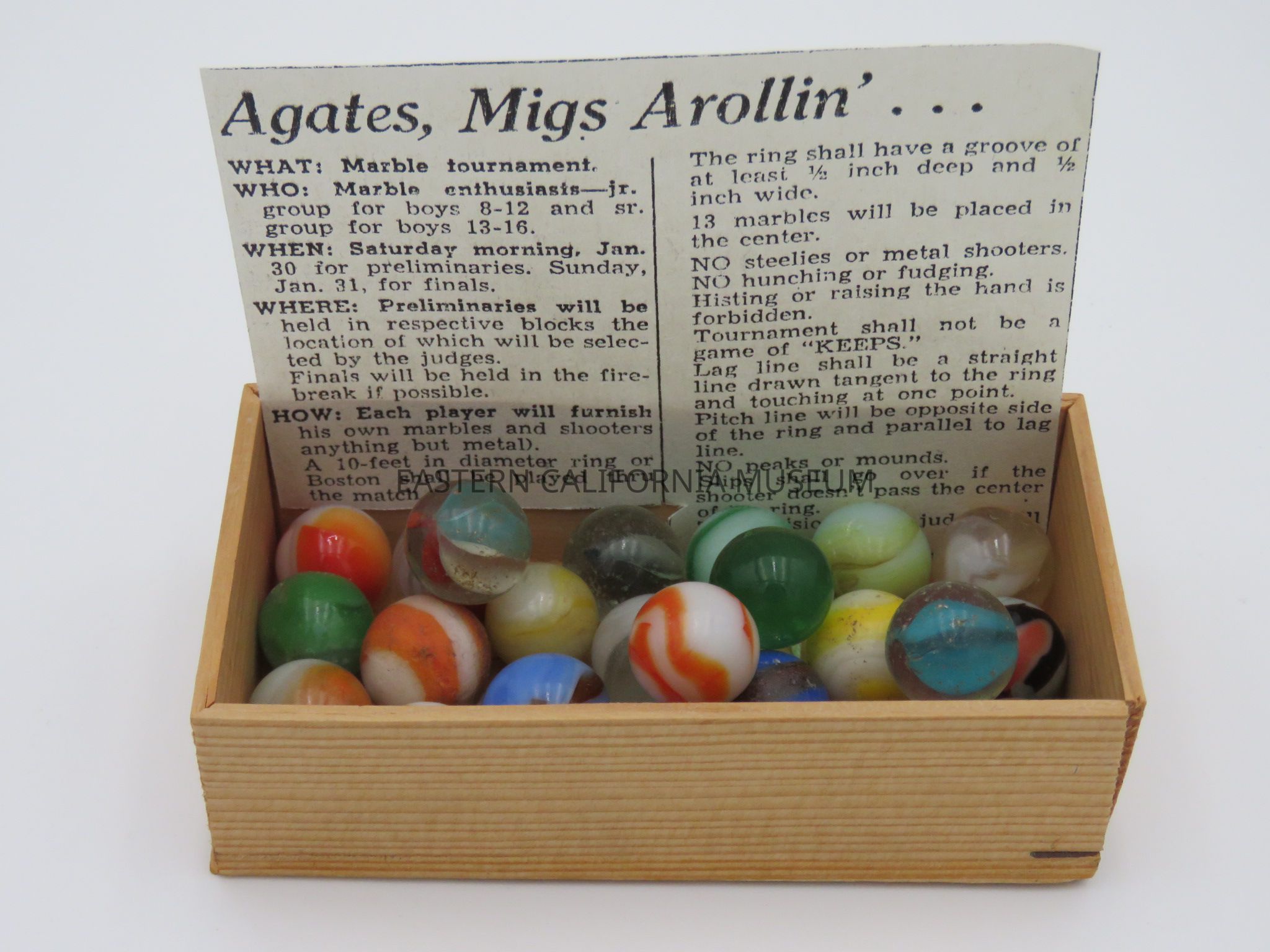 With them is a photocopied article titled, "Agates, Migs Arollin'..." about a marble tournament held for boys at Manzanar War Relocation Center.Collection