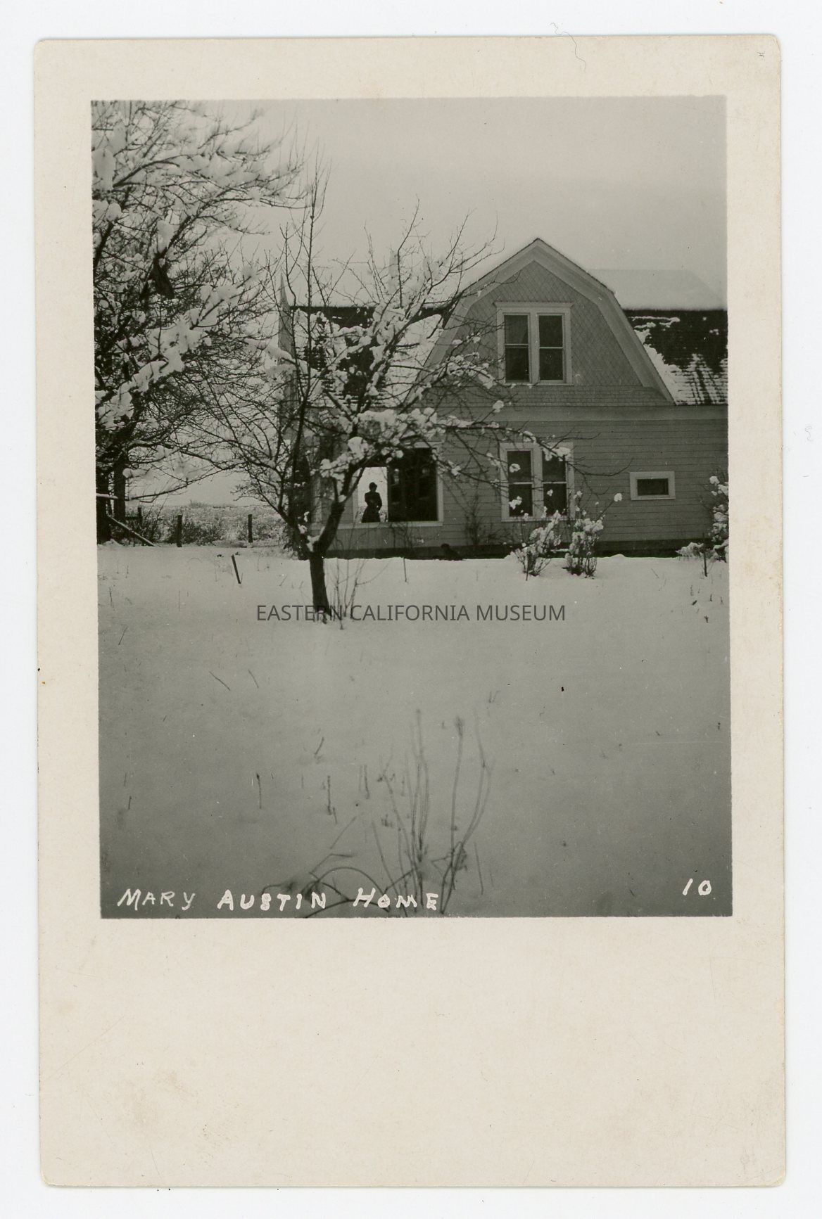 Photo postcard titled, "Mary Austin Home" and given ID #10. It was taken in the winter with snow all around. There is a woman standing in the front porch.