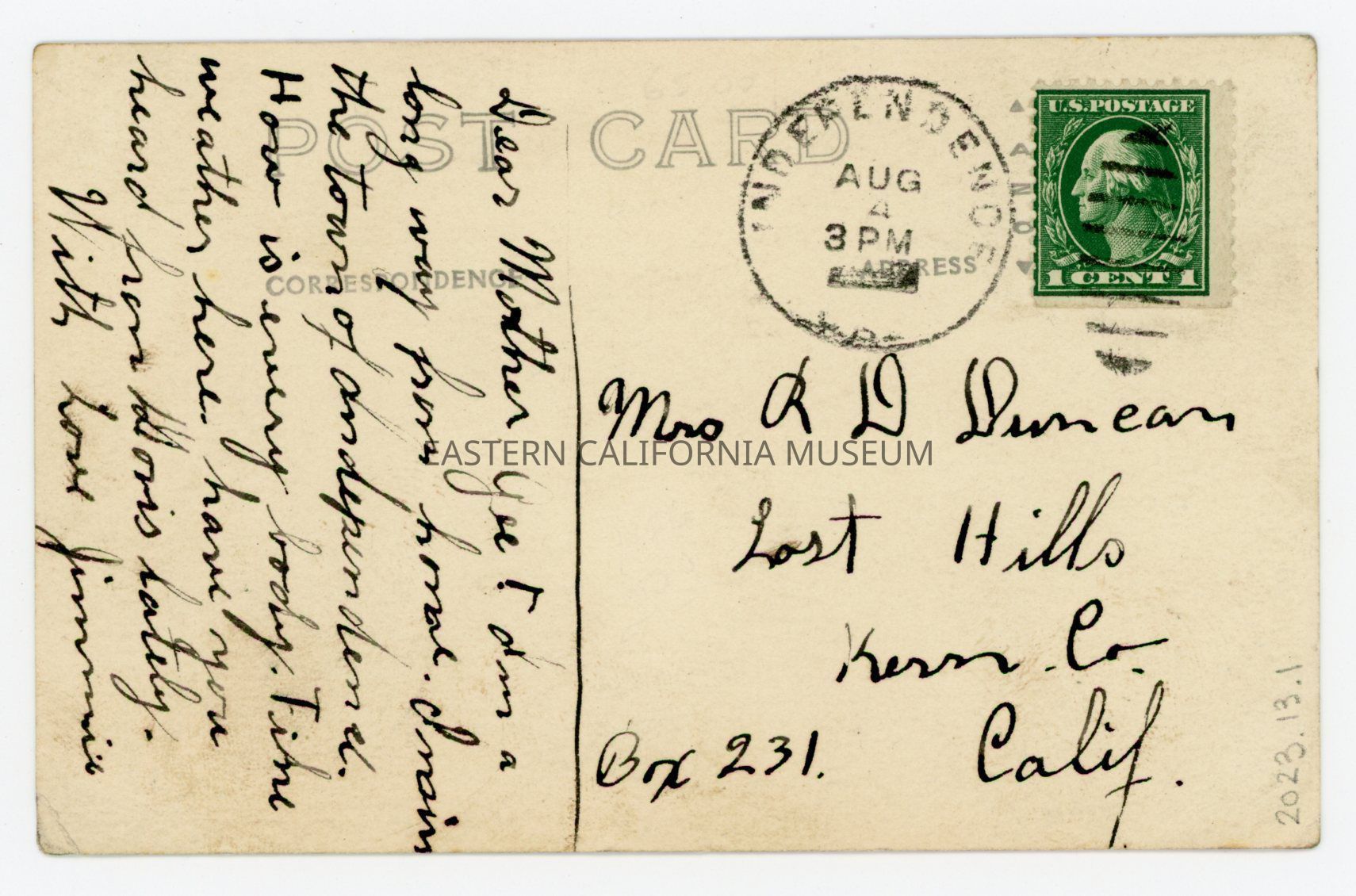 Faded photo postcard titled, "Mary Austin Home, Independence, Cal." The sender has written "Mary Austin, author of the Land of Little Rain" in black ink along top of postcard. It was sent to Mrs. R. D. Duncan of Lost Hills, CA from Jimmie (her son). It has a green, one cent Washington stamp and was sent on August 4th from Independence (year illegible).Collection