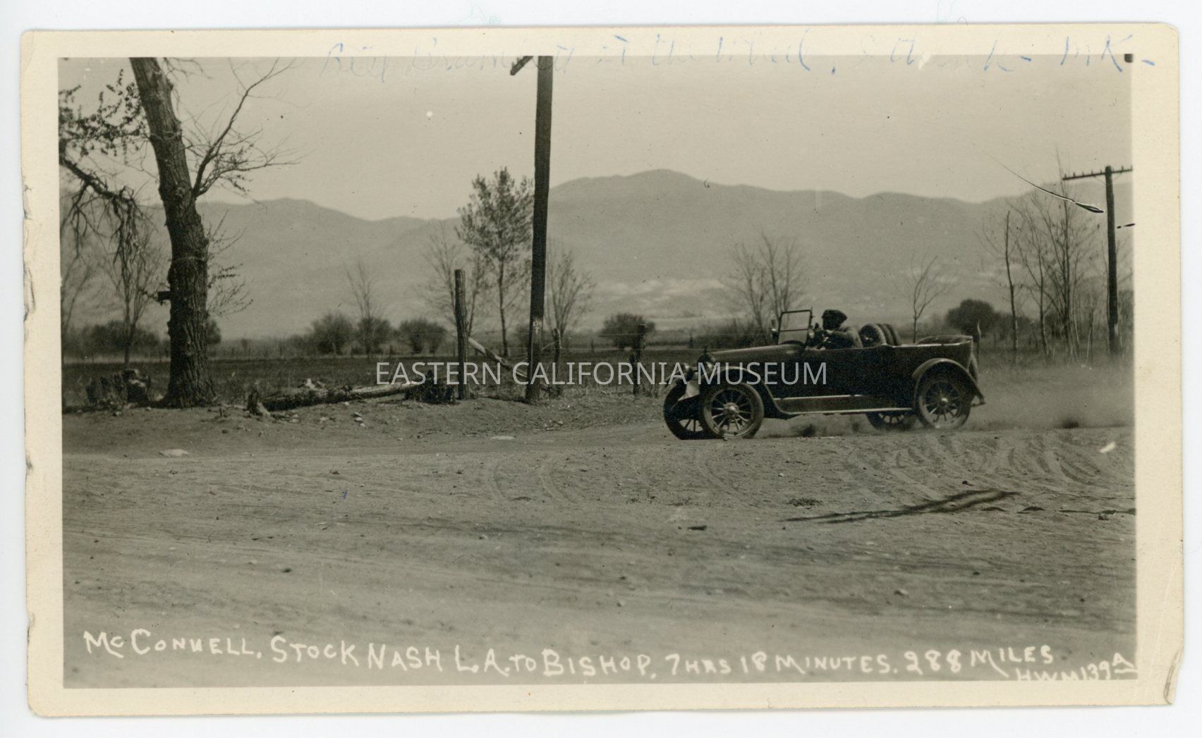 Photo titled, "McConnell, Stock Nash L.A. to Bishop, 7 hrs 18 minutes, 288 miles" taken by photographer H. W. Mendenhall and given his ID #139A. It shows a man driving an early automobile on a dirt road. The Inyo or White mountain range is in the background. Written in blue ink on the photo is, "Bill Bramlett at the wheel, I think. MK."
