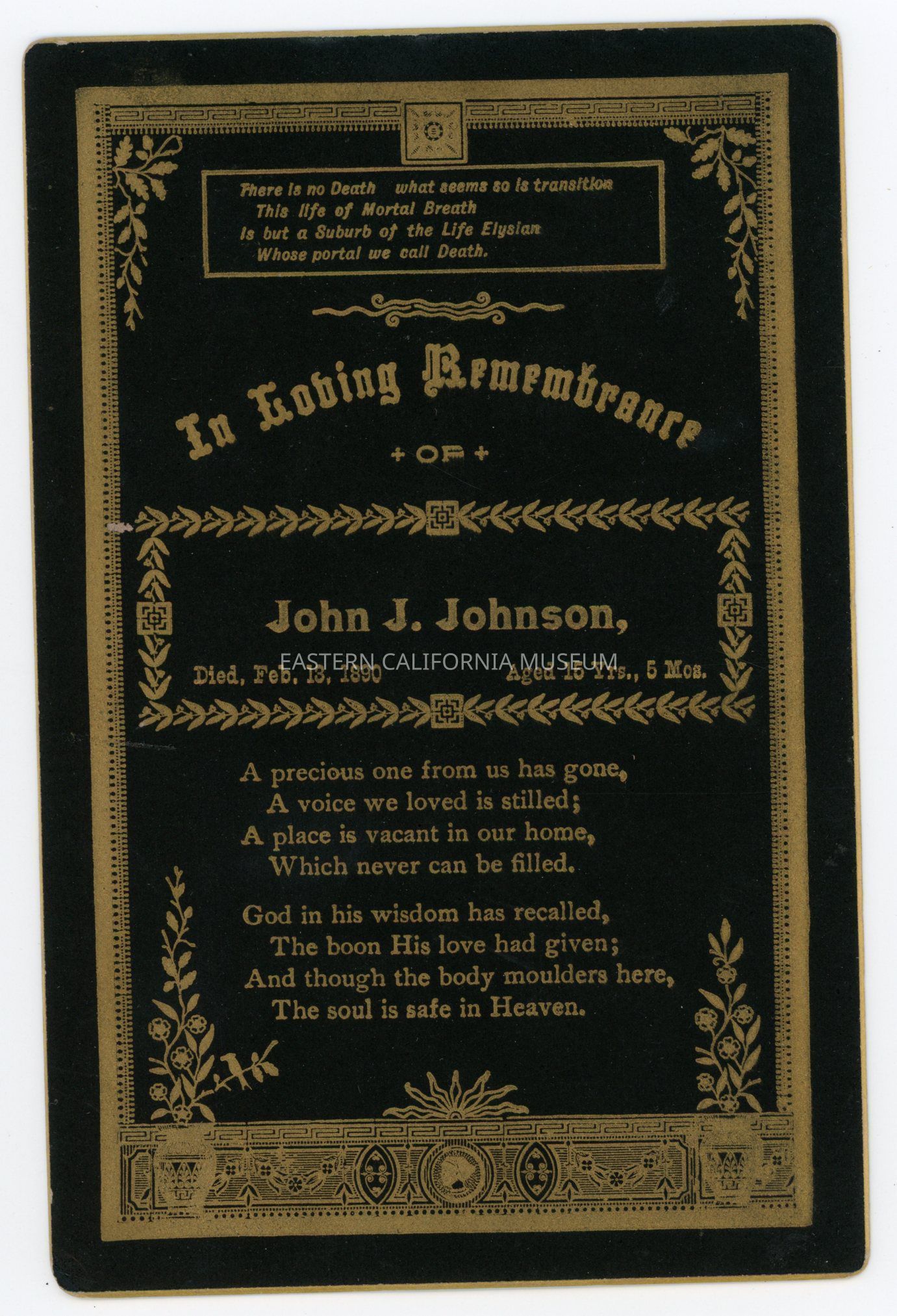 Memorial card in remembrance of John J. Johnson, who died on February 13, 1890 at age 15 years 5 months. It has gold lettering on a black background.Collection