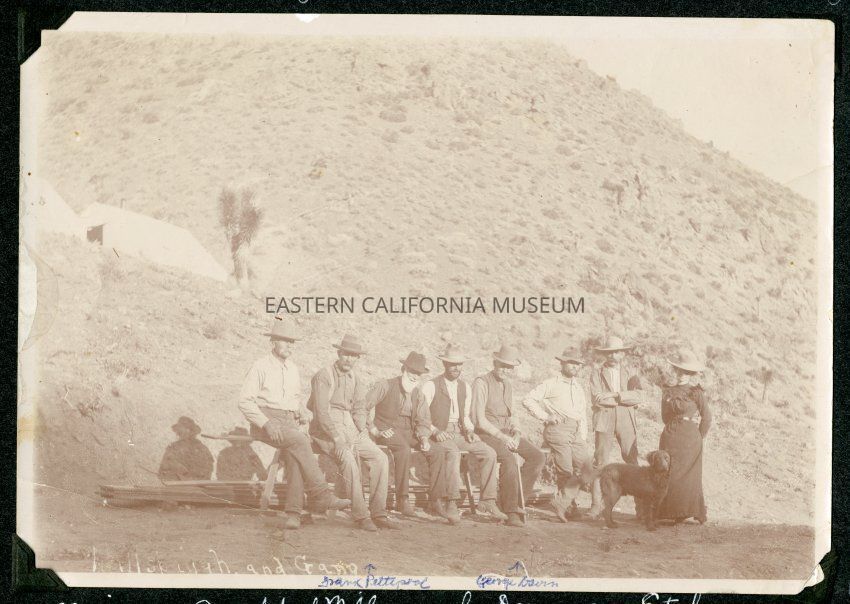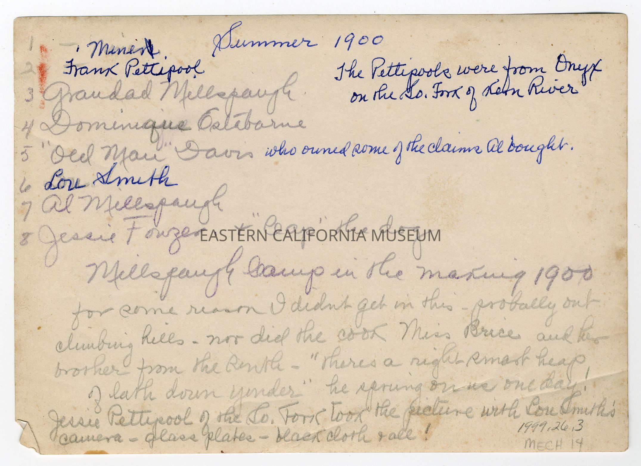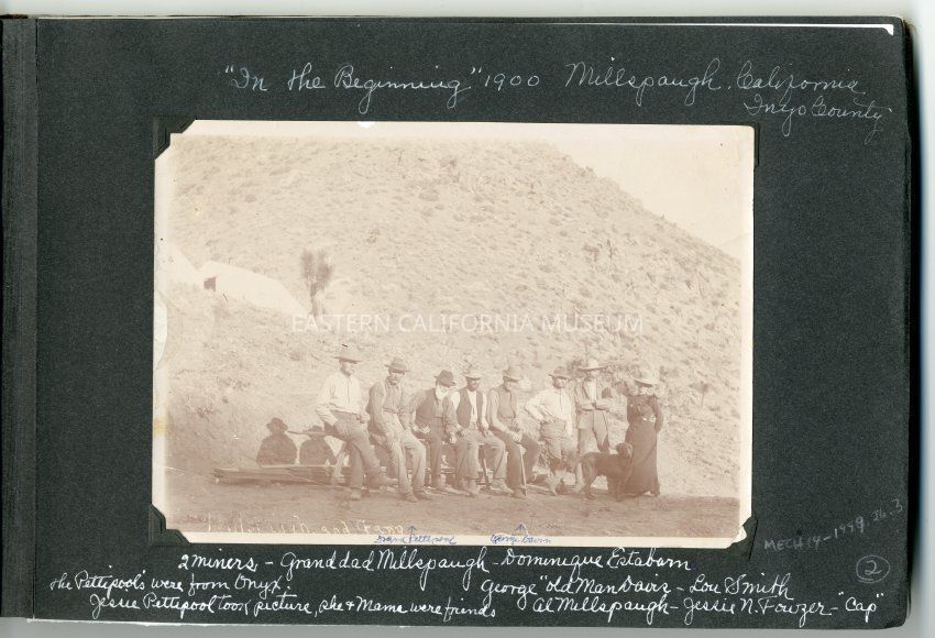 Caption on album page: "In the Beginning" 1900 Millspaugh, California, Inyo County. 2 miners--Granddad Millspaugh--Dominique Estaborn [sp? Estabarn?]. The Pettipools were from Onyx. George "Old Man" Davis--Lou Smith. Al Millspaugh--Jessie N. Fowzer--"Cap." Jessie Pettipool took picture, she and Mama were friends.