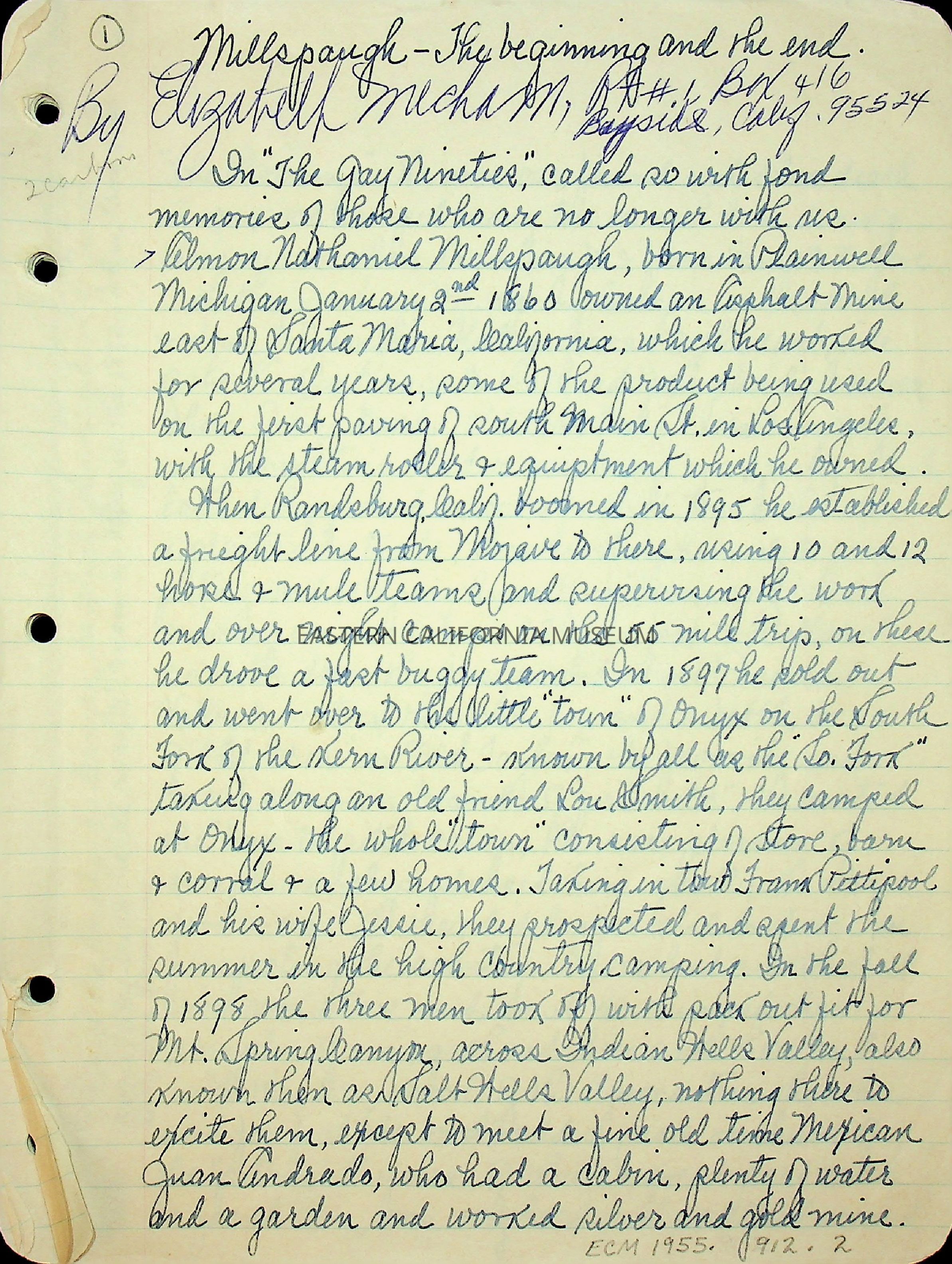Handwritten manuscript titled, "Millspaugh: The Beginning and the End" written by Elizabeth Mecham in 1963. 21 pages.Collection