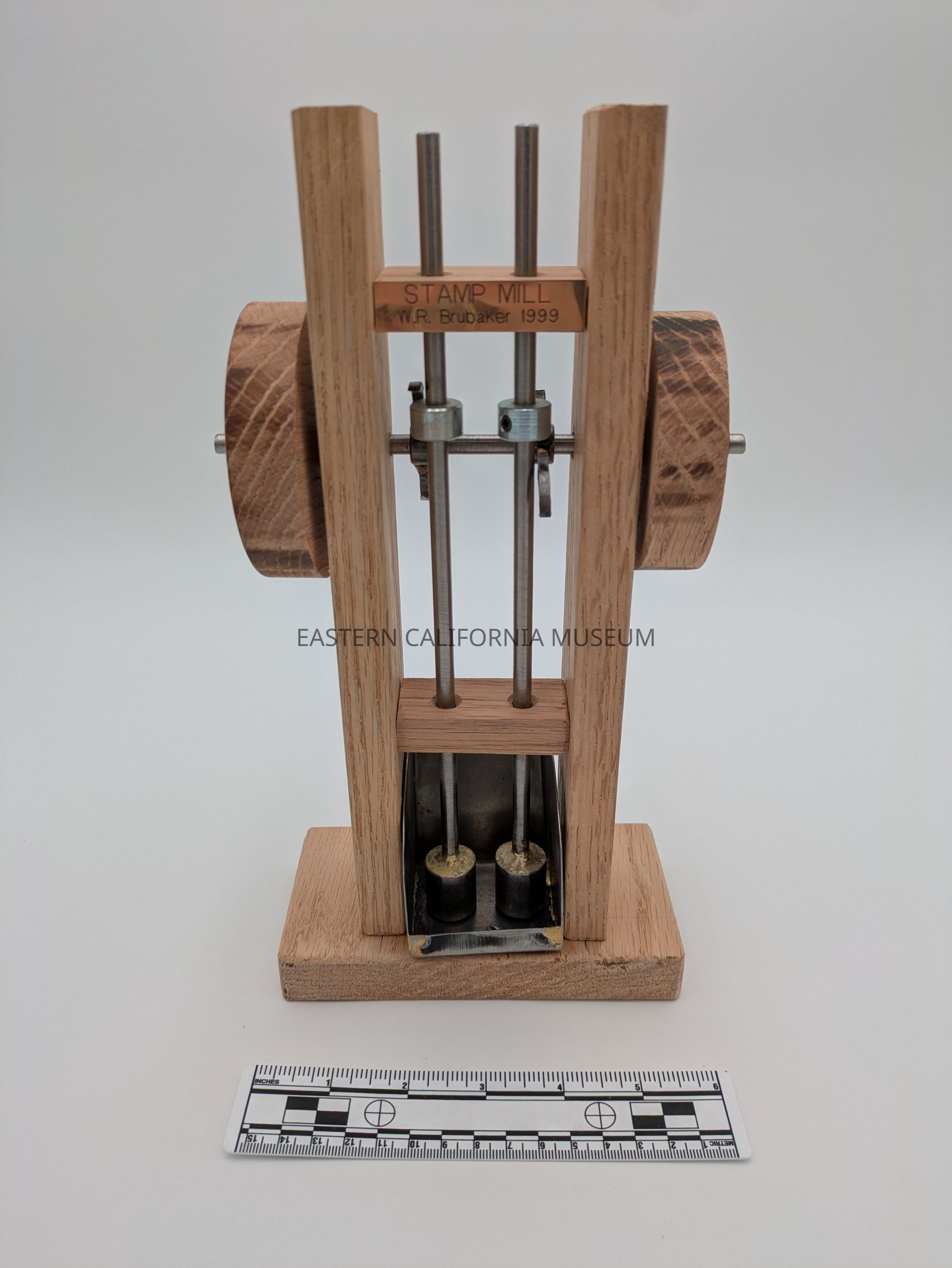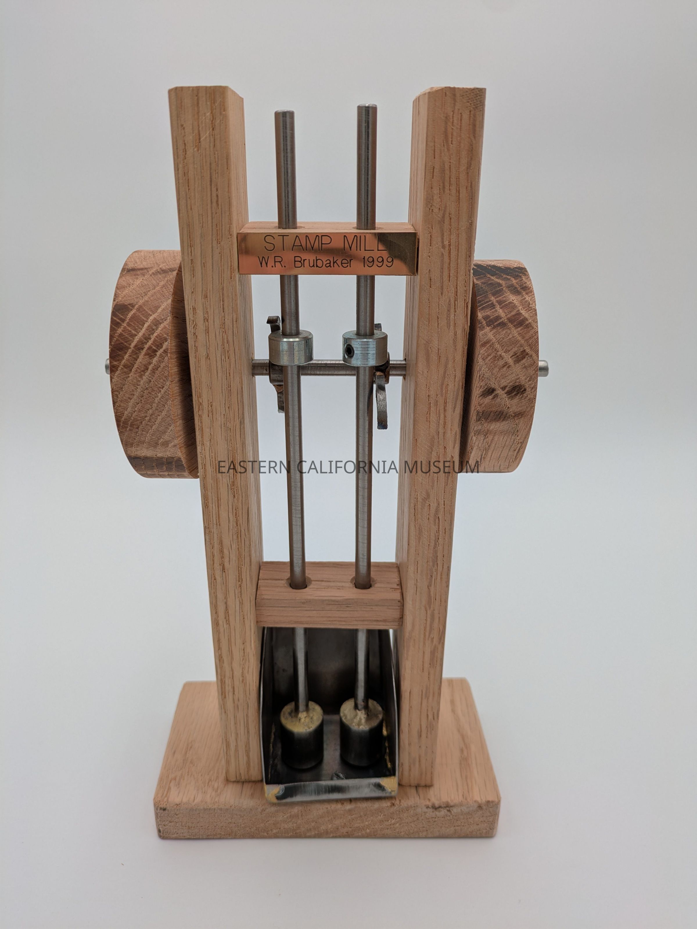 Working model of a stamp mill. Has a little metal plaque that says, "Stamp Mill. W. R. Brubaker, 1999."