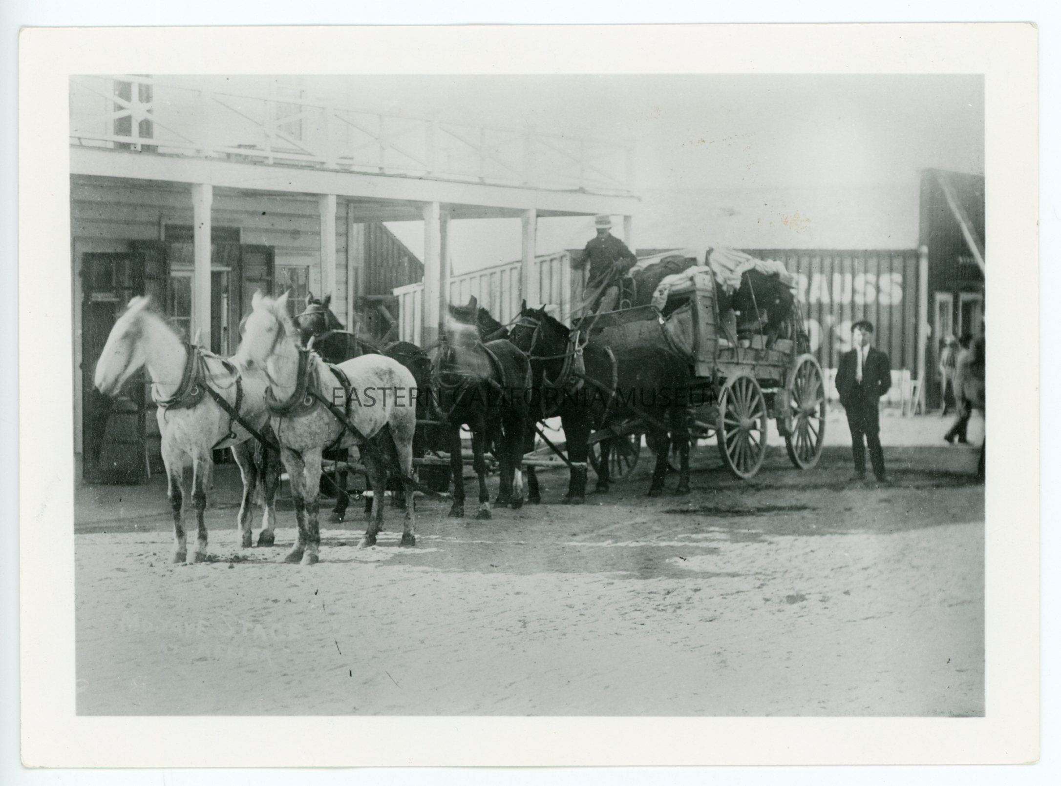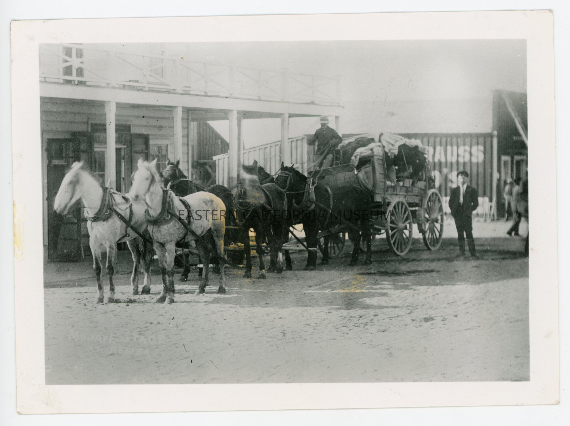 A617.34--Keeler stage leaving Keeler for Mojave. Took 3 days to make the trip. 125 miles trip. Stage in front of Mates Hotel. Six horse team on stage. 1908. Information by George Cook. [Stamped on reverse with ECM address.]Collection
