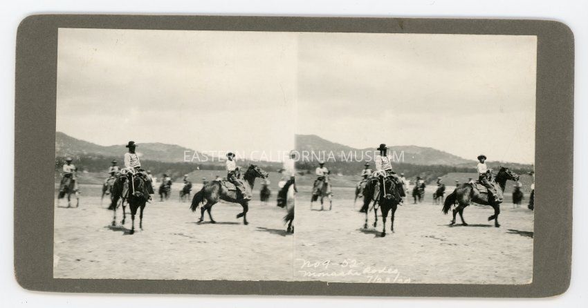 Stereopticon card titled "Monache Rodeo" dated July 23,1920, made by Pacific Art Co. of Los Angeles. It has ID #9-52.Collection