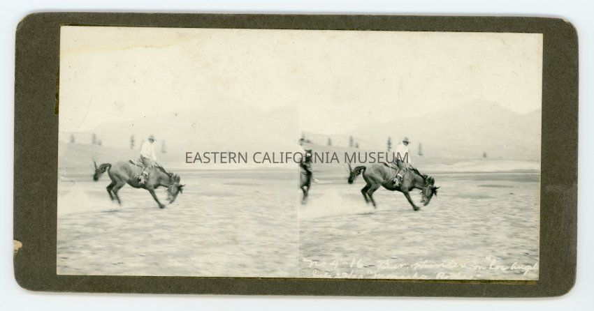 Stereopticon card titled "Monache Rodeo" dated July 22,1920, made by Pacific Art Co. of Los Angeles. It has ID #4-16 and also has the caption "Bev [Beveridge] Hunter on Los Angeles."Collection