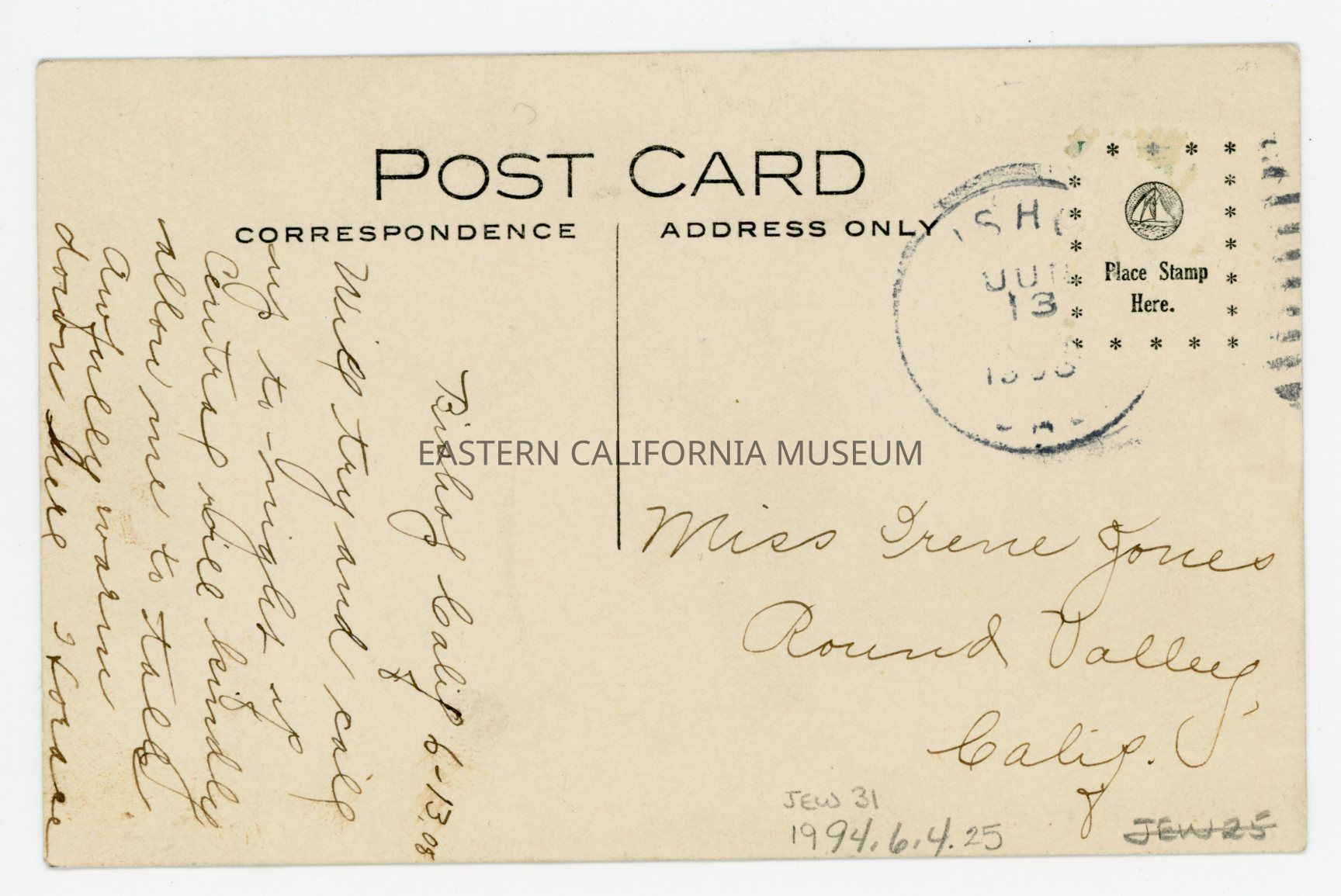 This postcard was sent to Irene Jones in Round Valley from Howard on 06/13/1908. The stamp has been removed.Photograph Details
