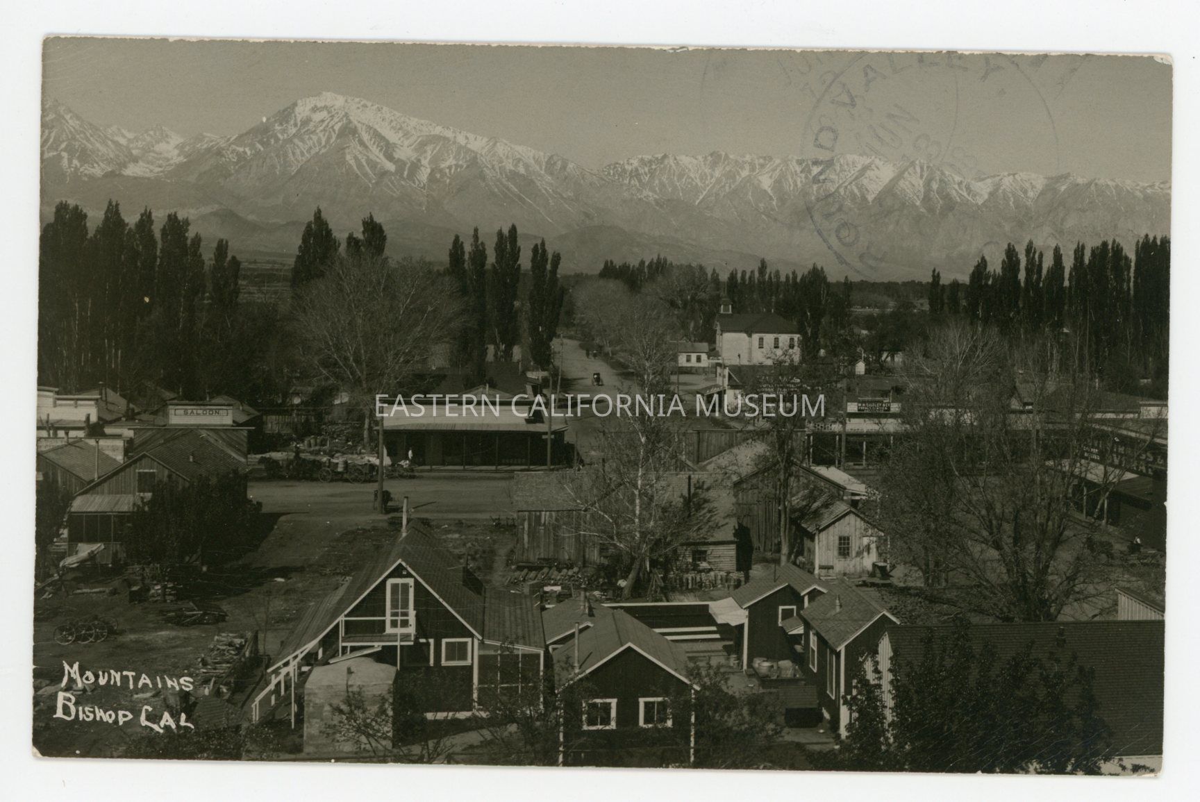 Photo postcard titled, "Mountains, Bishop, Cal." It is taken from a high vantage point (top of the Opera House?) looking west towards the Sierra Nevada mountain range. A saloon is visible to the left, and possibly A. A. Forbes' photo studio is visible near the center. There are two more signs, one of which might be a Levi Strauss advertisement, but they are mostly illegible.