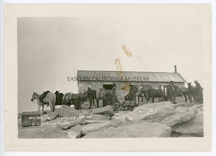 Photo titled, "Mt. Whitney, 14,502 Ft." taken by photographer Fred Harvey and given his ID #46. It shows a group of horses, pack mules, and four men on the summit of Mt. Whitney with the Smithsonian hut in the background. The men are likely Oscar Burkhardt, Horace Elder, Ross Spear, and either Fred Harvey or Bill Skinner. They may be packing observatory equipment.Collection