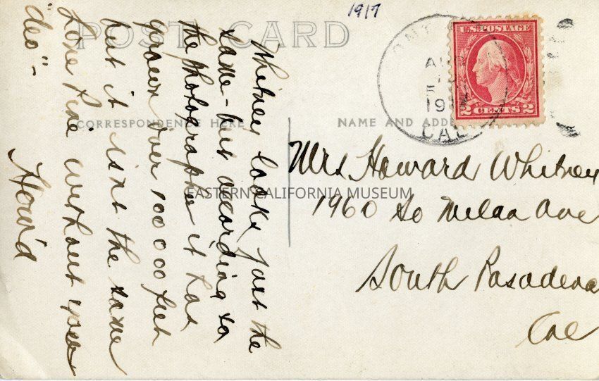 Identified by donor as: 1917- Mt. Whitney Postcard sent from Howard Whitney to his wife Patti Whitney (1)