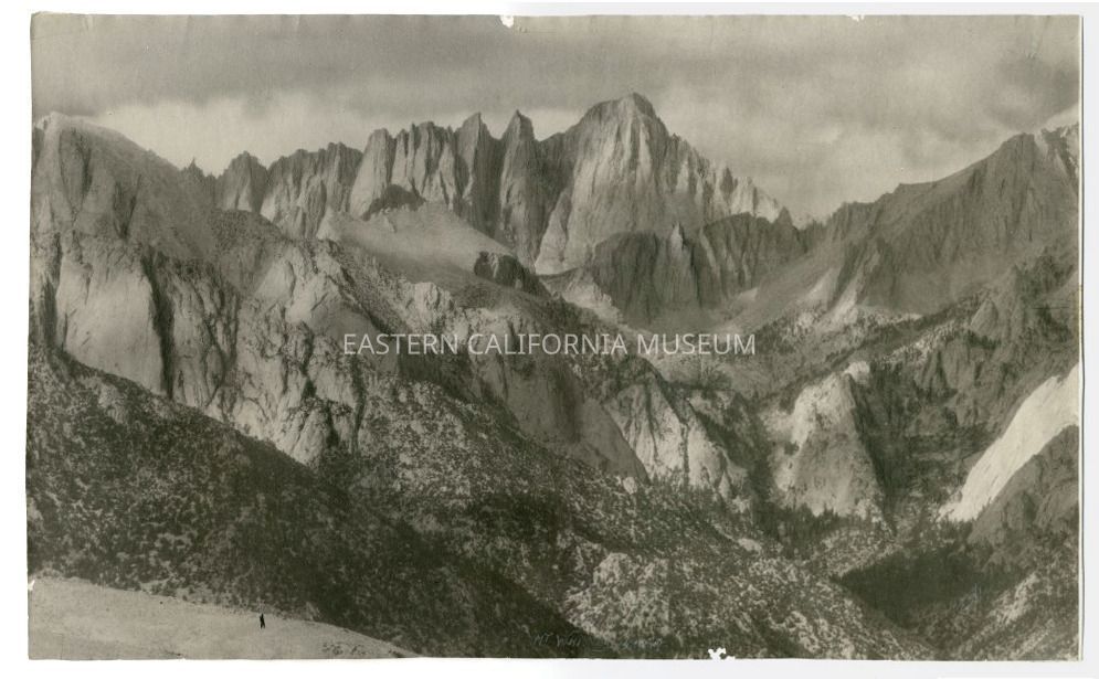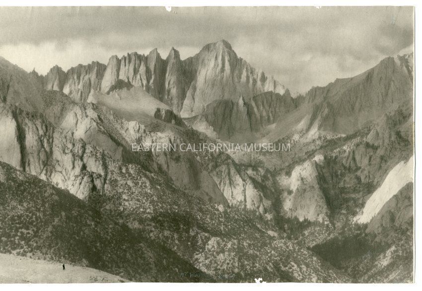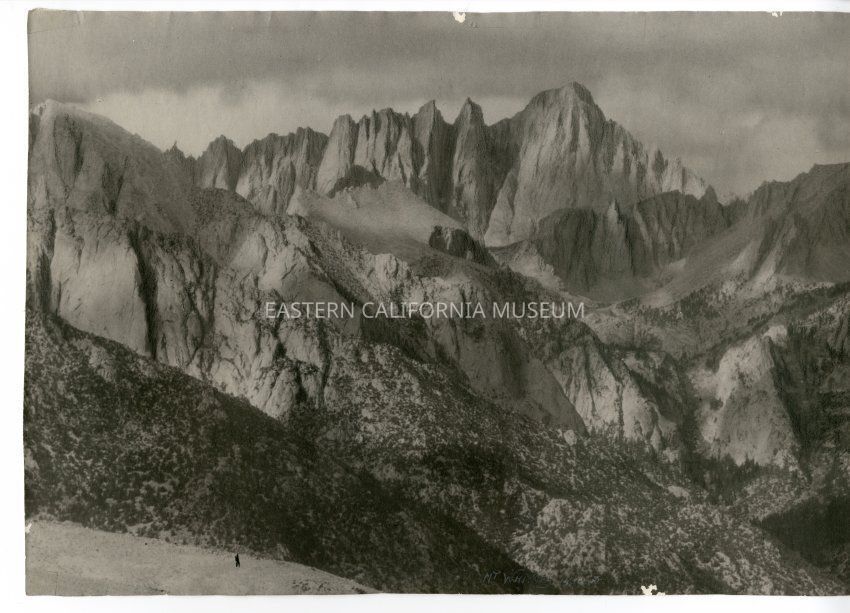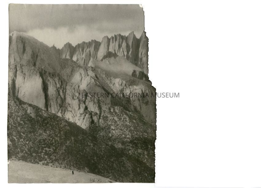Oversize black and white photo of Mt. Whitney. Written on front in white pencil or pen is "Mt. Whitney 14,502 ft." "R779" written on reverse, so likely a Ramsey photo.