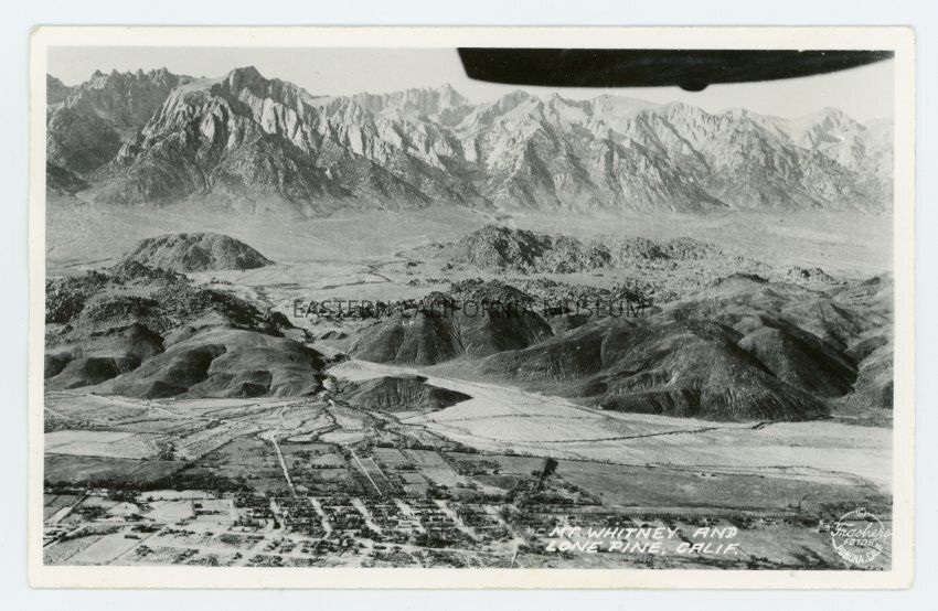 Aerial photo postcard of the town of Lone Pine, Alabama Hills, Mt. Whitney, and the Sierra Nevada mountain range. It is titled, "Mt. Whitney and Lone Pine, Calif." and the photo was taken by Burton Frasher.Collection