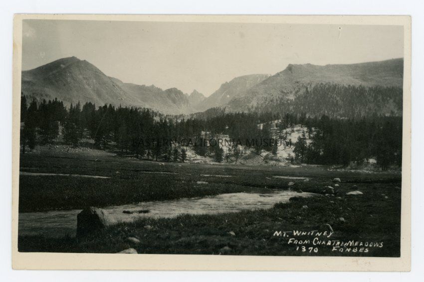 Photo postcard titled, "Mt. Whitney from Crabtree Meadows." It was taken by A. A. Forbes and given his photo ID #1370. There is a stream in the foreground through a meadow.