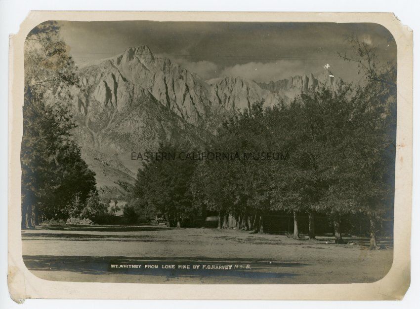 Photo titled, "Mt. Whitney from Lone Pine" taken by photographer F. G. Harvey and given his ID #8. Shows dirt street lined with trees. Mt. Whitney is marked with a "+" in white.Photograph Details