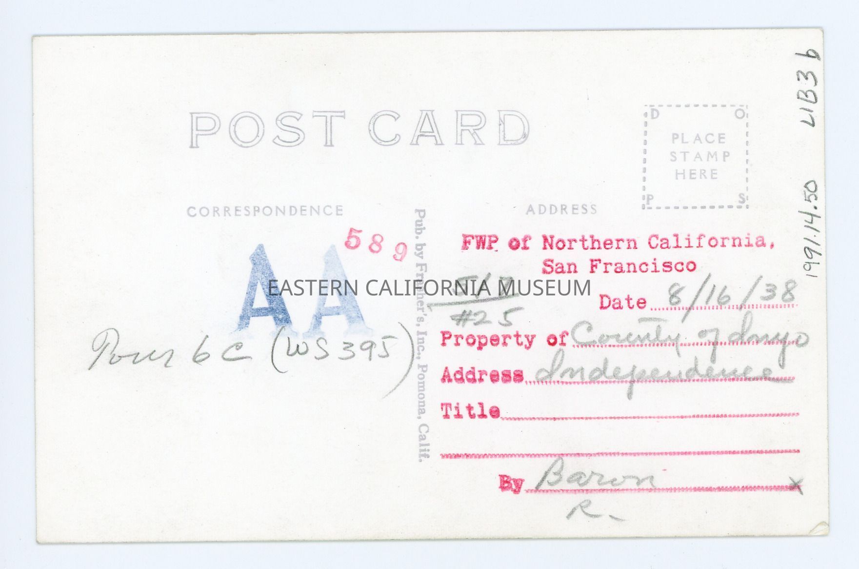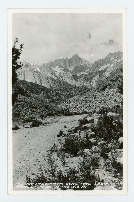 Photo postcard of a dirt road leading toward Mt. Whitney.